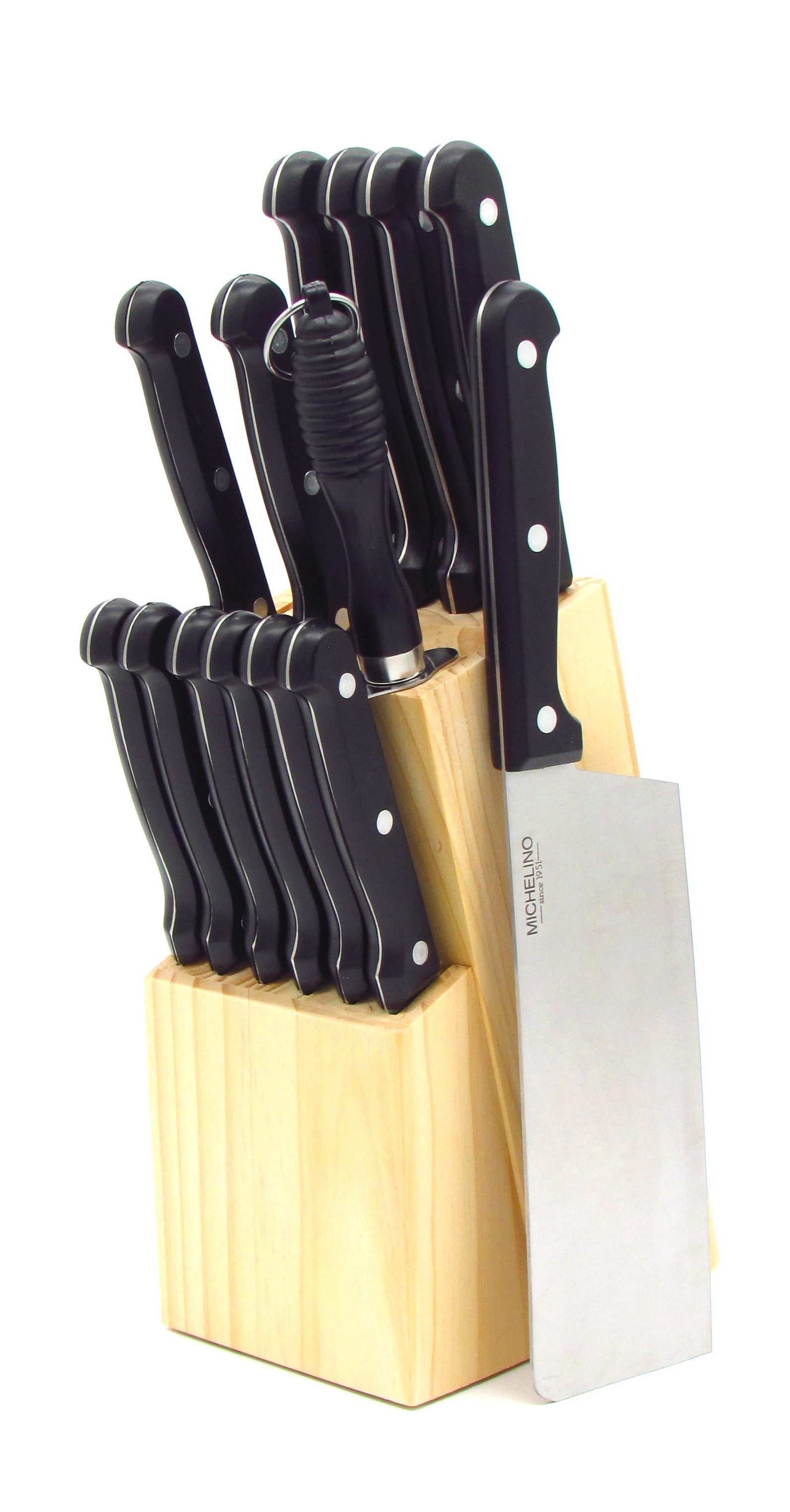 Veredeln Sie Ihre Küche mit diesem hochwertigen 15-teiligen Messerblock-Set – die perfekte Kombination aus Funktionalität, Design und Qualität. Egal ob Hobby- oder Profikoch, ob Vegetarier oder Fleischliebhaber mit viel oder wenig Platz in der in der Küche: Eine gewisse Auswahl an Messern gehört zum leichten und erfolgreichen Kochen einfach dazu. Der elegante Messerblock aus Kiefernholz bietet sicheren Halt für alle Messer und den Wetzstahl, während die sorgfältig ausgewählten Klingen aus bestem Klingenstahl eine langlebige, extrem scharfe Schneide garantieren. Die ergonomischen Griffe aus hygienischem Kunststoff sorgen für angenehmes Handling und optimale Balance. Mit diesem Set sind Sie bestens ausgestattet für alle Schneidaufgaben in der Küche! Mit diesem stilvollen Messerblock-Set sind Sie bestens ausgestattet für jede Herausforderung in Ihrer Küche. Hochwertige Verarbeitung trifft auf praktisches Design – bestellen Sie jetzt und erleben Sie Küchenkomfort auf höchstem Niveau! Lieferumfang • 1 Hackbeil (Klingenlänge: 17 cm, Gesamtlänge: 29 cm) • 1 Kochmesser (Klingenlänge: 20 cm, Gesamtlänge: 32,5 cm) • 1 Brotmesser (Klingenlänge: 20 cm, Gesamtlänge: 35,4 cm) • 1 Tranchiermesser (Klingenlänge: 20 cm, Gesamtlänge: 32,5 cm) • 1 Fleischmesser (Klingenlänge: 15 cm, Gesamtlänge: 27 cm) • 1 Universalmesser (Klingenlänge: 12,5 cm, Gesamtlänge: 23 cm) • 1 Gemüsemesser (Klingenlänge: 8 cm, Gesamtlänge: 18,5 cm) • 1 Edelstahl-Wetzstahl (Длина: ca. 19 cm; Grifflänge: ca. 9,5 cm) • 1 Messerblock aus Kiefernholz (Maße:14 x9,5 x 21 cm ohne Messer 14 x9,5 x 32 cm inkl. Messer) Eigenschaften Material: Messer: hochwertiger Klingenstahl Griffe: hygienischer Kunststoff und Edelstahlnieten Wetzstahl: Edelstahl Messerblock: Kiefernholz Pflegehinweis: Все Messer und der Wetzstahl sind spülmaschinengeeignet, wir empfehlen jedoch Handwäsche für längere Schärfe und Pflege.