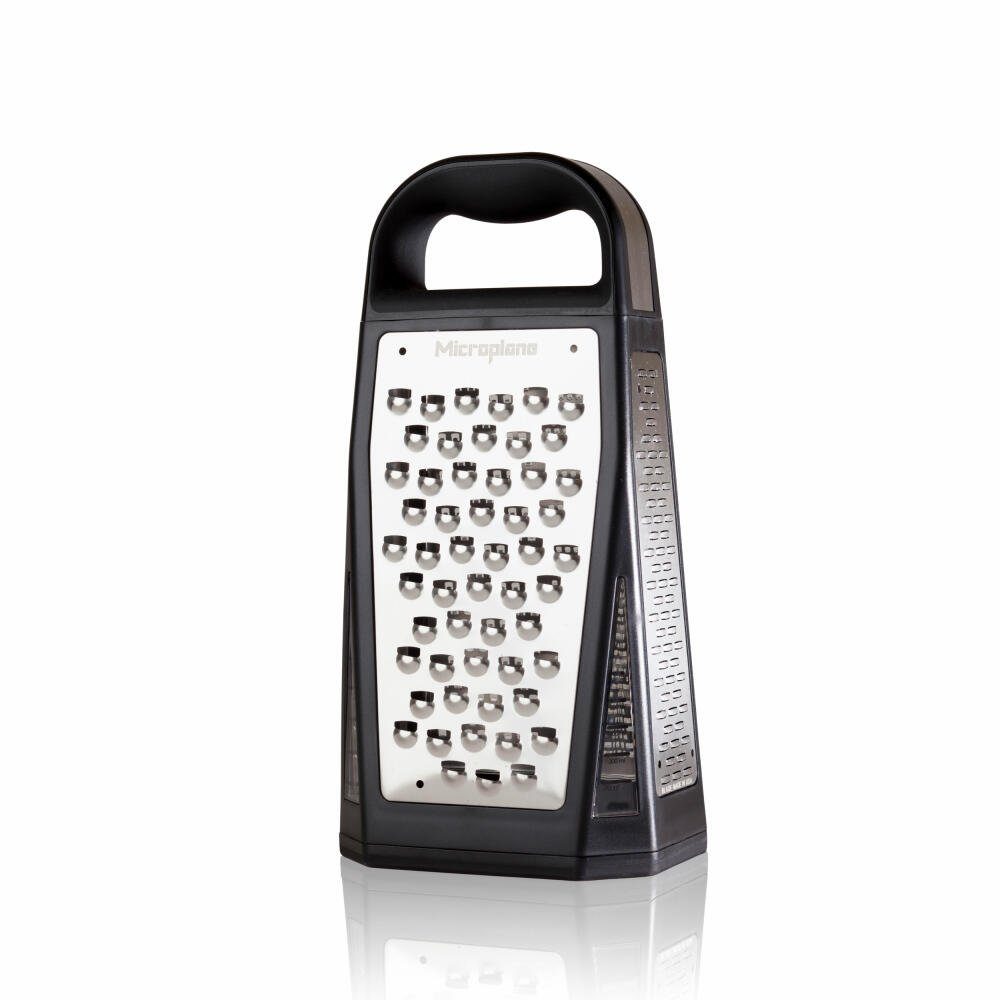 Gleich 5 verschiedene Reibeflächen vereint die Turmreibe ELITE von Microplane in ihrem robusten und optisch ansprechenden Gehäuse. Neben Reiben in 3 Stufen (Fein, Grob, Sehr Grob) und einer praktischen 2-Wege-Schneide verfügt die Turmreibe über eine große Raspel. Egal, was Sie reiben - die photogeätzten Edelstahlklingen made in USA sorgen für präzise und saubere Reibeergebnisse mit geringem Kraftaufwand. Der Schieber im Boden ermöglicht es, die Reibe zugleich als Auffangbehälter zu verwenden - die Sichtfenster mit Messskala bis 600 ml ermöglichen die perfekte Dosierung.