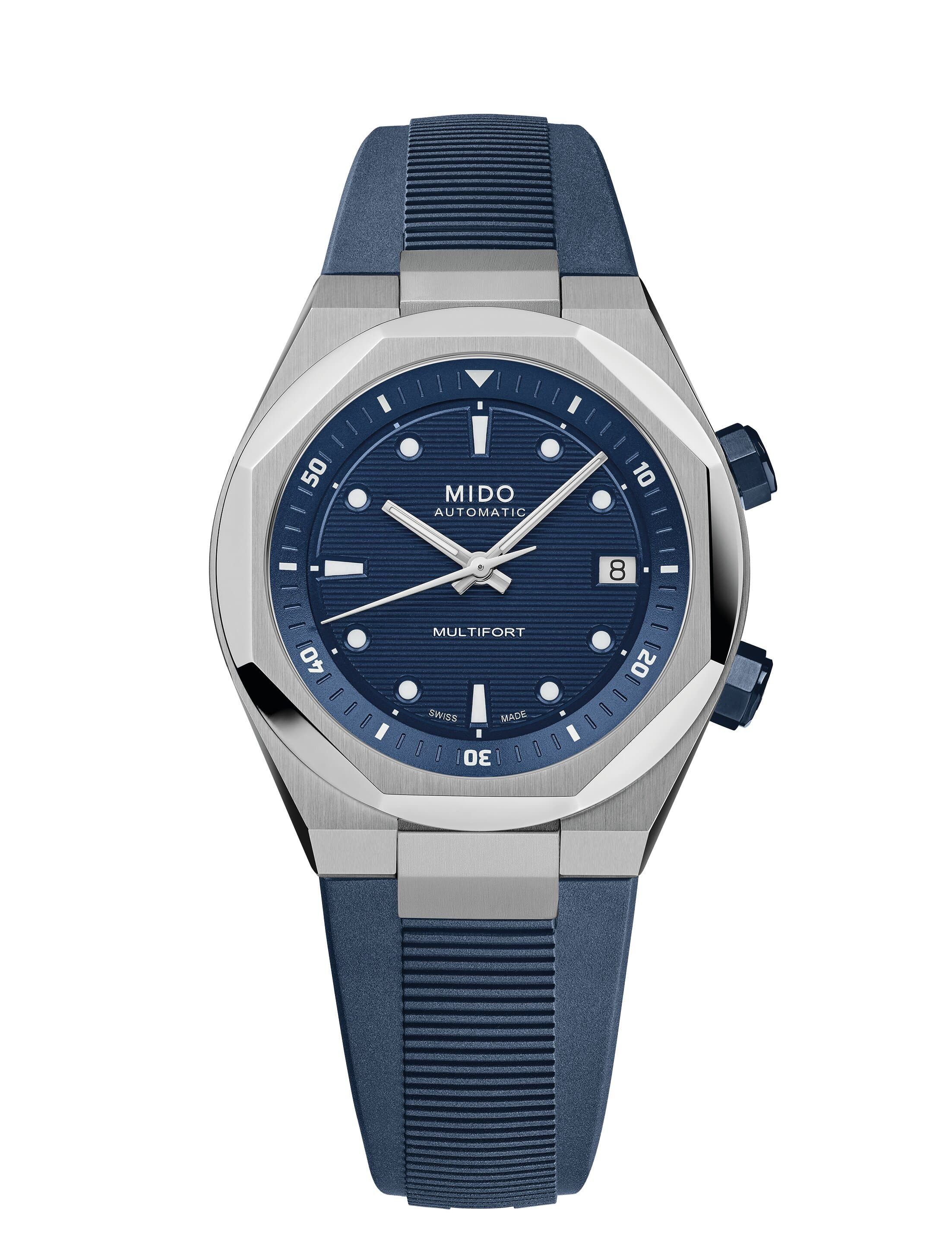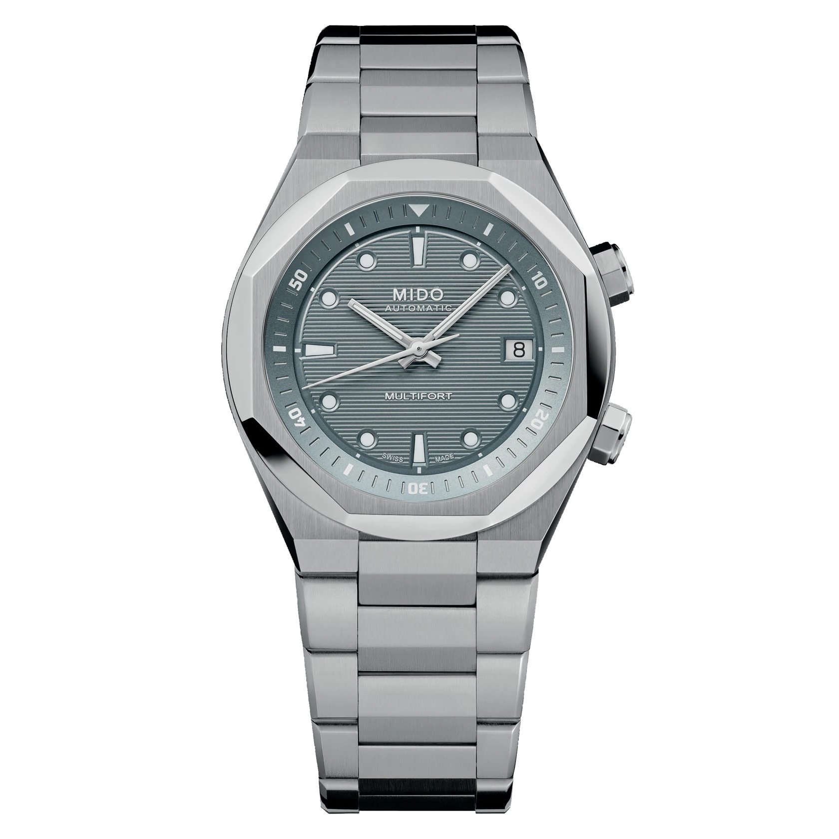 Die Kühnheit der Multifort 8 steht für Veränderung! Das dynamische und moderne Design mit einer 8-eckigen Lünette wird durch ein horizontales, geprägtes Zifferblatt betont, während weiße Super-LumiNova® die Sichtbarkeit der Indizes verbessert. Dieses Juwel vereint Technologie und Geometrie und ist mit einer innenliegenden drehbaren Lünette ausgestattet, die über die Krone bei 2 Uhr bedient wird, während Uhrzeit und Datum über die Krone bei 4 Uhr eingestellt werden können. Dieses Modell ist ausgestattet mit Kaliber 72 mit Nivachron™-Technologie, ein Uhrwerk, das speziell aufgrund seiner geringen Höhe ausgewählt wurde, was ein 40-mm-Gehäuse ermöglicht, das ebenso schlank wie raffiniert ist.