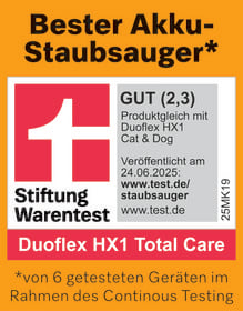 Testurteil von Stiftung Warentest vom 25.06.2025, Ausgabe 24.06.2025, Seite test.de/Staubsauger-im-Test-1838262-0/: "GUT (2,3) - Produktgleich mit Duoflex HX 1 Cat & Dog - Bester Akkusauger von 6 getesteten Geräten im Rahmen des Continous Testing"