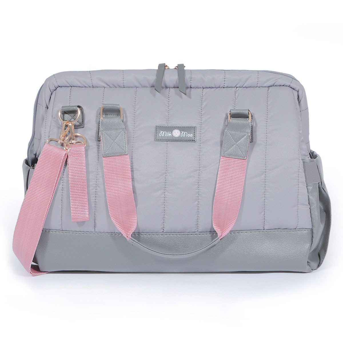 Mit dem anthrazitfarbenen Steppstoff, veganem Leder und einem roséfarbenen Akzent bieten wir eine stilvolle Tasche, die speziell für Mütter entworfen wurde. Sie kann sowohl über der Schulter als auch in der Hand getragen werden und verfügt über spezielle Riemen für den Kinderwagen.