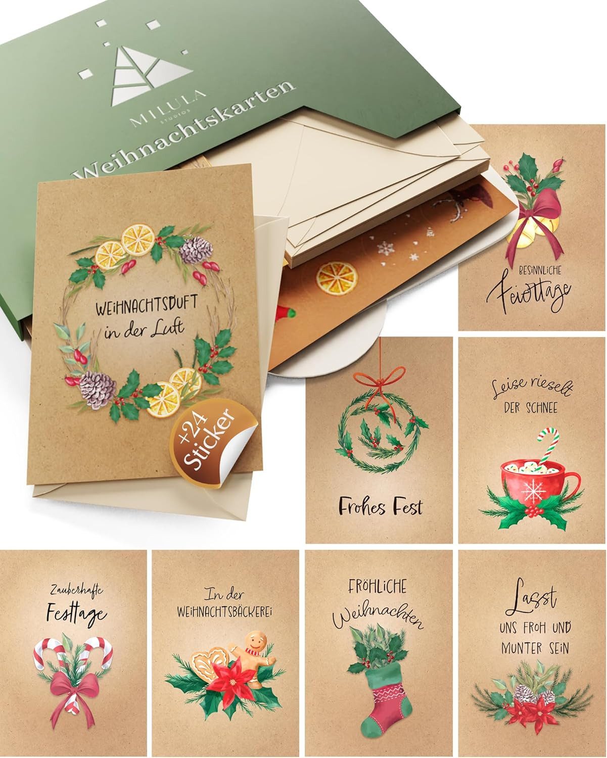Set Weihnachtskarten, Umschläge & Sticker: Unsere Weihnachtskarten präsentieren wunderschöne, aber schlichte Designs, die deine Grüße stilvoll und elegant übermitteln Premiumqualität: Hergestellt aus hochwertigem Material, bietet jede Weihnachts Karte ein luxuriöses Tastgefühl Vielfalt für jeden Empfänger: Unser Weihnachtskarten Set beinhaltet eine breite Auswahl an Designs, damit du die perfekte Karte für jeden deiner Lieben finden kannst. Teile deine Gefühle: Unsere Weihnachtskarten ermöglichen es dir, deine tiefsten Emotionen auf herzliche Weise zu übermitteln - diese Karten bringen deine Botschaft auf den Punkt Mach es persönlich: Mit ausreichend Platz für deine individuellen Worte kannst du jede Karte zu etwas Besonderem machen. Schreibe deine eigenen, von Herzen kommenden Nachrichten und verleihe deinen Grüßen eine persönliche Note