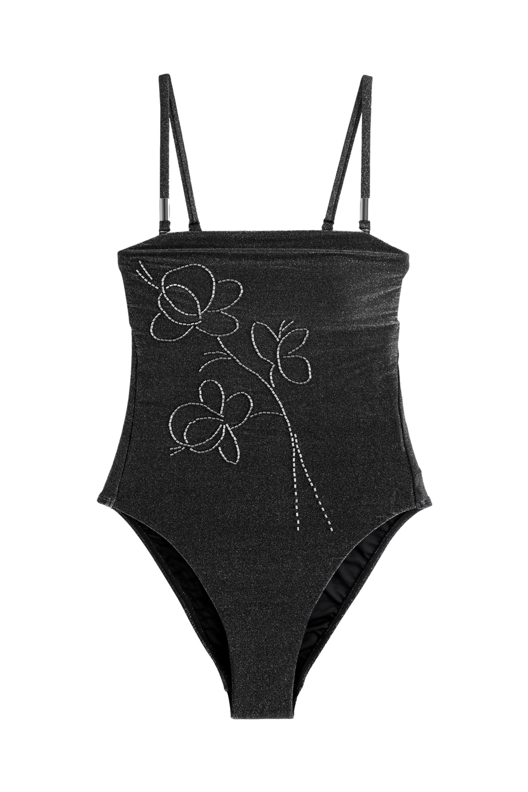 Materialzusammensetzung | Hauptmaterial: 75 % Polyamid, 20 % metallisierte Faser, 5 % Elasthan, Netzstoff: 88 % Polyamid, 12 % Elasthan. Futter: 92 % Polyester (recycelt), 8 % Elasthan. |