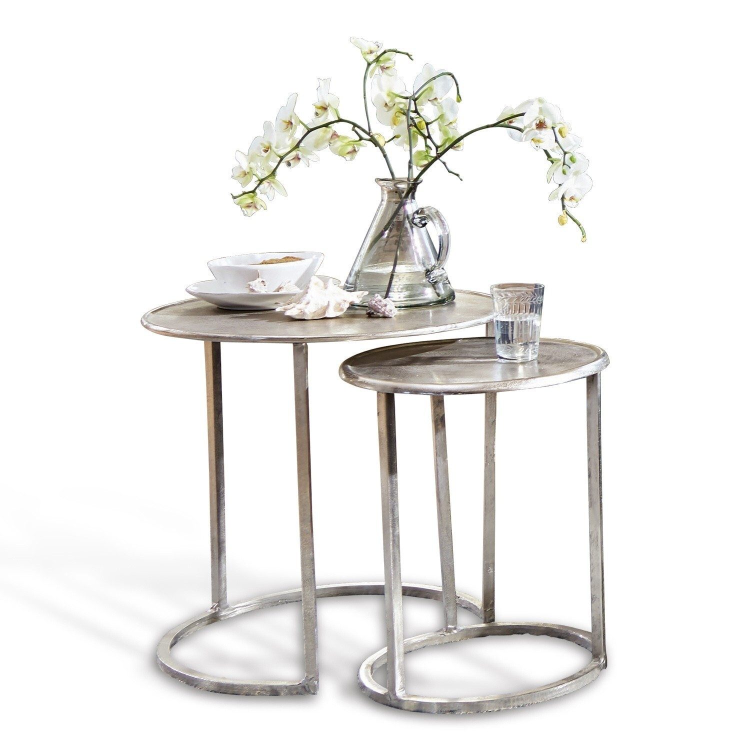 Der kleine Tisch schmiegt sich perfekt in das halbrunde Gestell des größeren Tisches. Zwei formschöne Beistelltische aus hochwertigem Aluguss, die durch ihr silbern schimmerndes Antik-Finish besonders elegant wirken. Das Design ist aber nicht nur wunderschön, sondern auch überaus funktionell. Schließlich schmiegt sich der kleine Tisch genau an das Gestell des Großen. Ideal also, wenn man hin und wieder eine weitere Ablagefläche benötigt, aber eigentlich keinen Raum für zwei Tische hat.