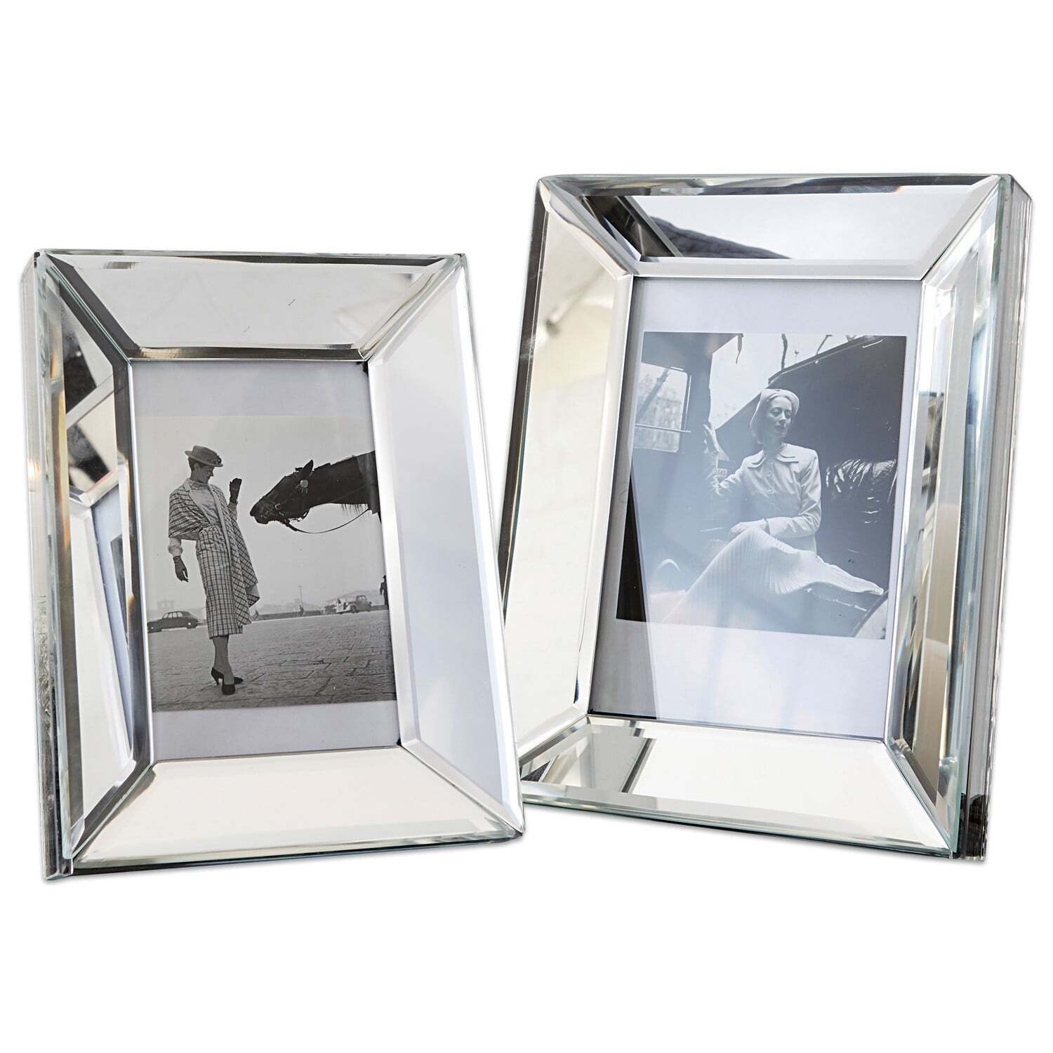 Dezente Eleganz mit dekorativem Rahmen aus verspiegeltem Glas. Zwei schicke Designs zum Stellen, hochkant oder im Querformat. Zwei Größen im Set. Wunderbar für Familienfotos oder kleine Bilder. Die Rückseite ist mit weichem, dunklem Filz bezogen. Geben Sie Ihren Lieblingsfotos oder anderen Kunstwerken wortwörtlich den perfekten Rahmen. Die beiden edlen Modelle harmonieren mit jedem Wohnstil und machen sich auf dem Nachttisch, dem Arbeitstisch oder im Regal aufgestellt wunderbar. Zeitloser Chic, der immer passt.