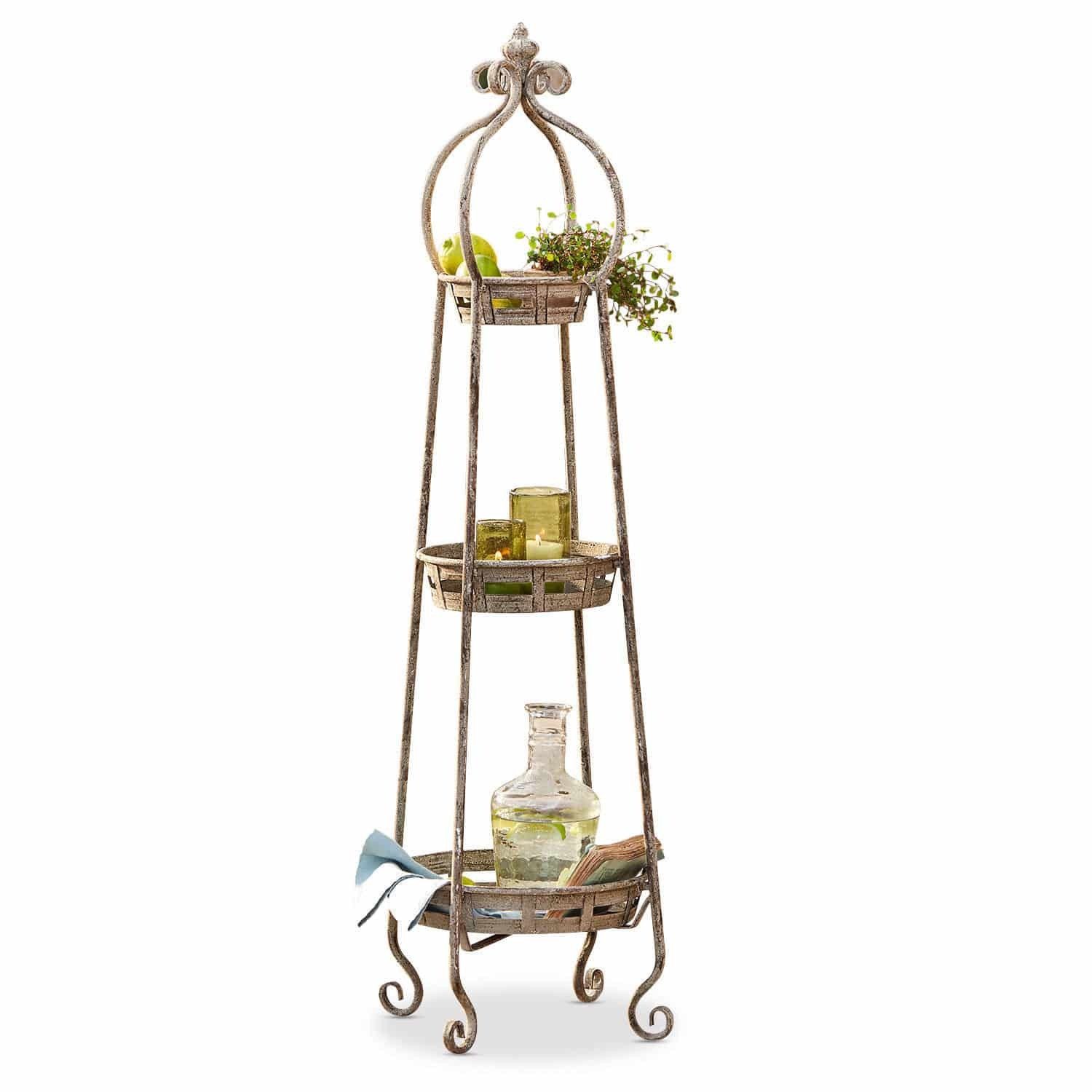 Langlebige Eisenkonstruktion. Charmantes Shabby-Finish. Diese Etagere ist ideal, um ihre Pflanzen, Kerzen und Deko-Objekte zu präsentieren. Elegantes, klassisches Design mit klaren Linien und schwungvollen Akzenten zeichnet diese Etagere aus. Sie ist aus Eisen gefertigt, was sie sehr langlebig und robust macht. Das aufwendig applizierte Shabby-Finish sorgt für eine besondere Ästhethik, die im Laufe der Jahre immer schöner wird. Das dreistufige Design bietet genügend Raum für unterschiedlichste Pflanzen, Deko-Objekte und Kerzen-Arrangements. Die Etagere ist für die Innen- und Außenanwendung konzipiert und macht einfach überall eine gute Figur.