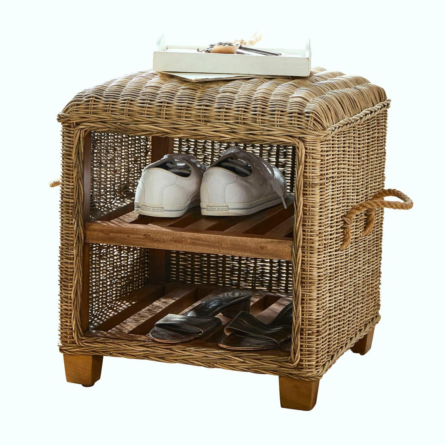 Kombiniert praktisches Schuhregal und gemütliche Sitzgelegenheit. Gefertigt aus Rattan mit stabilem Mahagoniholz-Gestell. Seitliche Jutegriffe für einfaches Umstellen und Transportieren. Perfekt für den Eingangsbereich: Ein harmonisches Möbelstück, das als Schuhregal und gepolsterte Sitzfläche überzeugt. Geflochtenes Rattan sorgt für natürliche Eleganz, während das Gestell aus Mahagoniholz Stabilität und Wärme verleiht. Praktische Jutegriffe erleichtern die Handhabung.