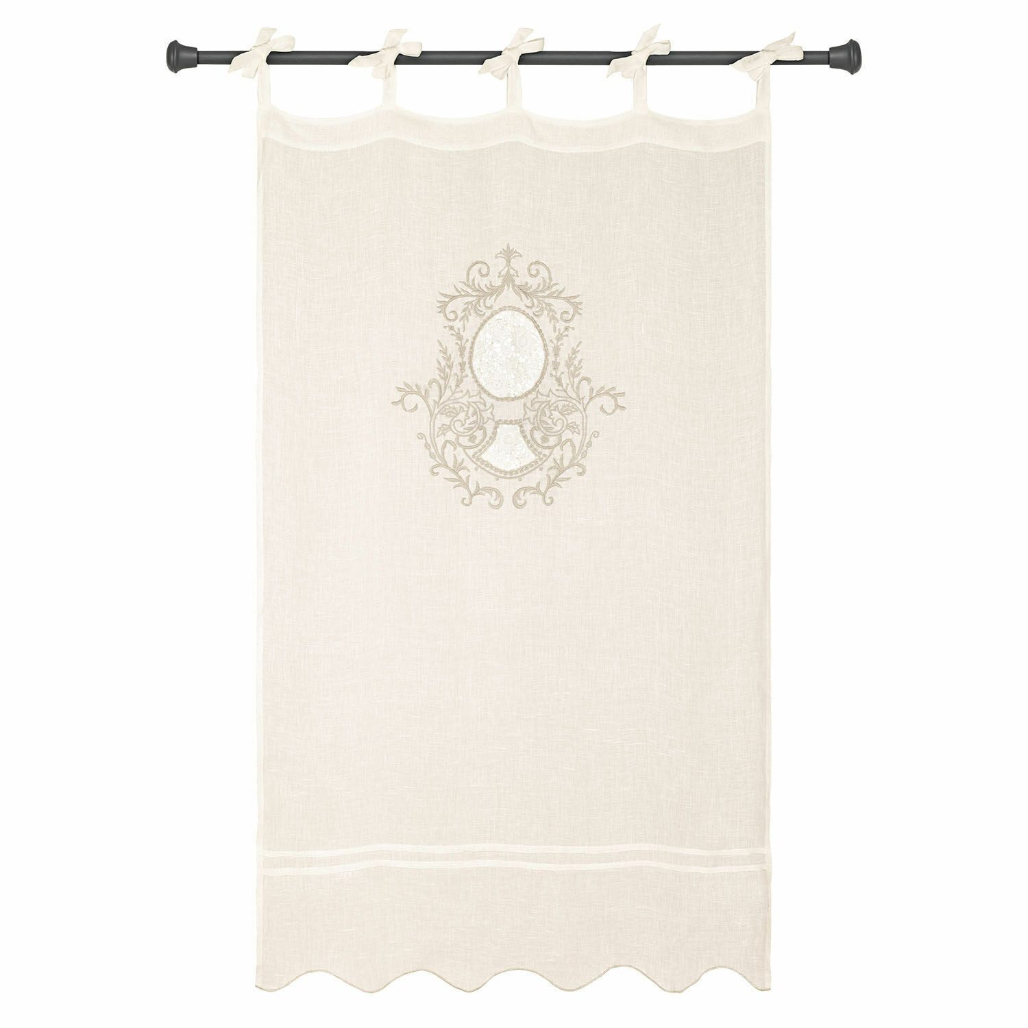 Mittiger, filigraner Spitzen-Einsatz mit kunstvoller Stickerei-Umrandung. Wellenkante und Biesen runden das Design ab. Gefertigt aus luftig-leichtem Leinen in zarter Farbgebung. Ein Design, das Romantik und Handwerkskunst vereint. Der transparente Leinenvorhang besticht durch seine aufwendigen Details wie Biesen, eine geschwungene Wellenkante und einen dekorativen Spitzeneinsatz, der von zarter Stickerei umrahmt wird. Perfekt, um Licht sanft hindurch scheinen zu lassen und eine behagliche Atmosphäre zu schaffen.