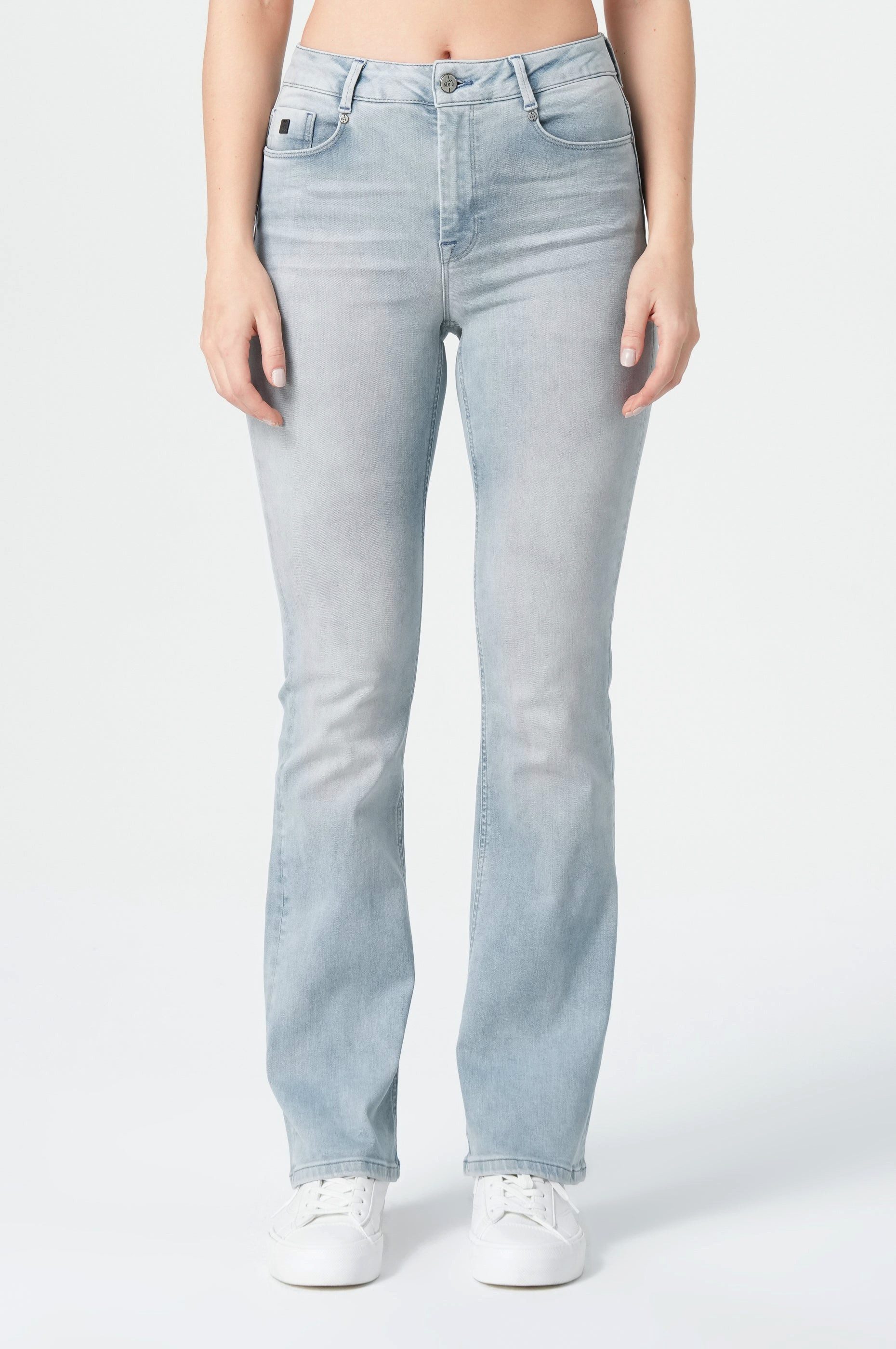 Sina Damen Bootcut Jeans Danger Grau – Minimalistischer Chic mit zeitloser EleganzDie Sina Bootcut Jeans in Danger Grau verkörpert moderne Raffinesse mit klarer Formensprache. Ihre präzise Linienführung – hochgeschnitten an der Taille, schmal am Oberschenkel und harmonisch ausgestellt ab dem Knie – schafft eine ausgewogene Silhouette mit beinverlängernder Wirkung. Der hochwertige Denim aus 82% Baumwolle, 15% Polyester und 3% Elasthan vereint angenehme Textur mit optimaler Formstabilität. Die außergewöhnliche Danger Grau-Waschung in kühlem, lichtem Farbton verleiht dieser Jeans eine zeitgemäße Modernität und macht sie zum vielseitigen Statement-Piece. Der hochgezogene Bund mit cleaner Knopfleiste betont deine Taille und sorgt für den perfekten Sitz mit selbstbewusster Ausstrahlung.Vielseitige Styling-Partnerin für subtile EleganzDie Sina Bootcut überzeugt durch ihre außergewöhnliche Anpassungsfähigkeit an verschiedene Style-Konzepte. Die monochrome Farbgebung harmoniert besonders eindrucksvoll mit kräftigen Kontrastfarben für markante Statements oder mit sanften Pastelltönen für einen harmonischen Look. Die leichte Ausstellung am Beinabschluss schafft eine ideale Balance zur figurbetonten Taille und kommt besonders vorteilhaft mit Absatzschuhen zur Geltung. Die seidige Haptik des premium Denims sorgt für angenehmen Tragekomfort bei jedem Schritt. Mit der Sina Bootcut in Danger Grau investierst du in ein durchdachtes Design-Essential mit unaufdringlicher Eleganz, das sowohl im Büro mit Bluse und Blazer als auch in der Freizeit mit leichtem Pullover eine souveräne Figur macht.