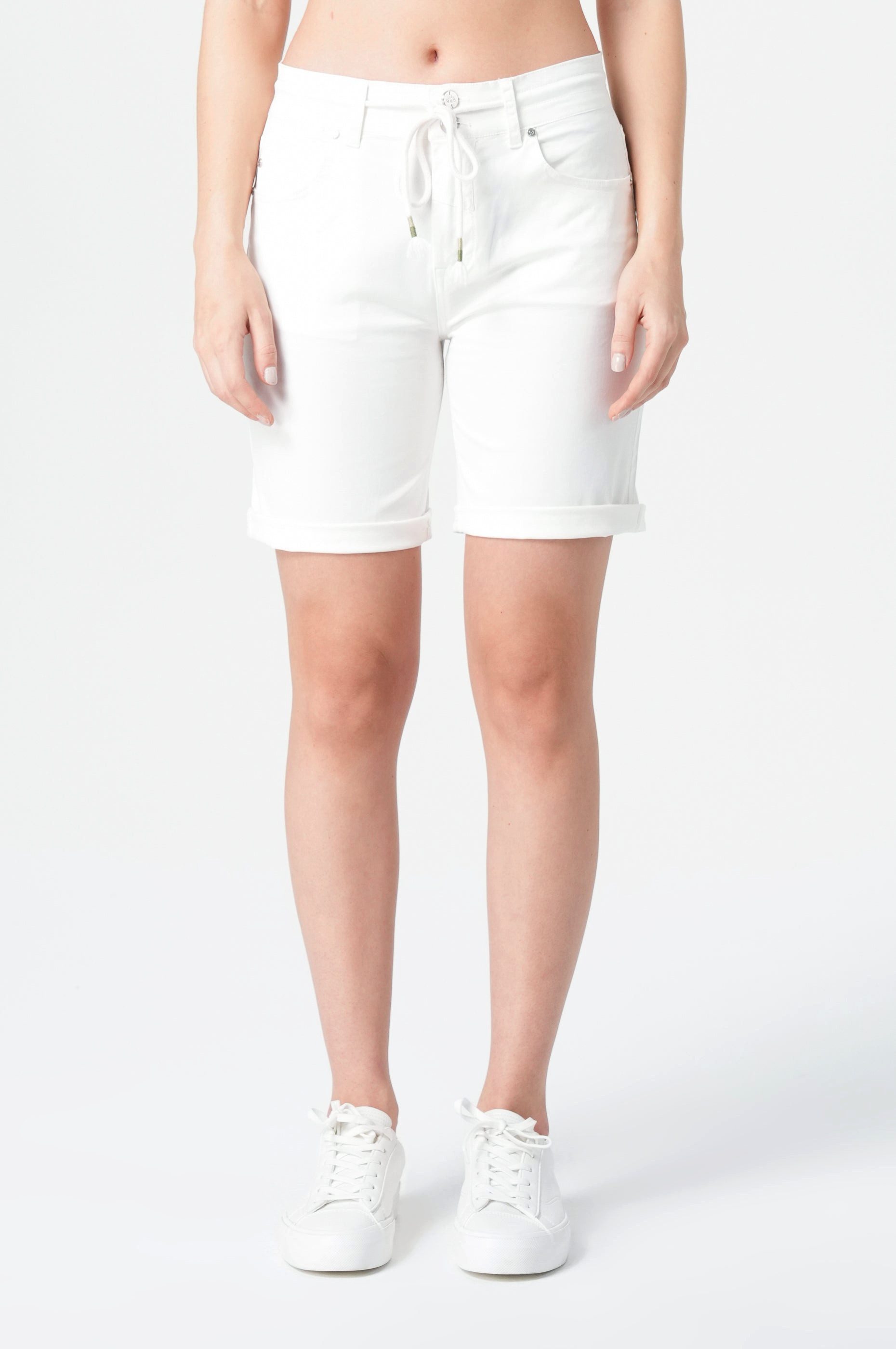 Dora Damen-Shorts Weiß – Klare Frische für deinen SommerstyleDie Dora-Shorts in strahlendem Weiß sind dein perfekter Begleiter für Frühling und Sommer. Mit ihrem angenehm lockeren Short-Fit schenken sie dir Bewegungsfreiheit und höchsten Tragekomfort an warmen Tagen. Die hochwertige Materialzusammensetzung aus 97 % Baumwolle und 3 % Elasthan sorgt für eine angenehme Haptik auf der Haut und bietet gleichzeitig die nötige Elastizität, um sich perfekt deiner Silhouette anzupassen. Die cleane Waschung in klassischem Weiß verleiht den Shorts eine zeitlose Eleganz und macht sie zum vielseitigen Styling-Partner in deiner Frühjahrs- und Sommergarderobe.Vielseitig kombinierbar für jeden LookMit den Dora-Shorts von M.O.D kreierst du mühelos verschiedenste Outfits. Kombiniere sie mit einem lässigen T-Shirt und Sneakern für einen entspannten Alltagslook oder mit einer luftigen Bluse und Sandalen für einen eleganten Sommerstyle. Die weiße Farbe harmoniert perfekt mit bunten Oberteilen und ermöglicht dir endlose Styling-Möglichkeiten. Ob für den Stadtbummel, das Strandcafé oder den Grillabend mit Freunden – diese Shorts sind der ideale Begleiter für all deine sommerlichen Aktivitäten. Das hochwertige Material sorgt für Langlebigkeit und Formstabilität, sodass du lange Freude an diesem unverzichtbaren Basic haben wirst.