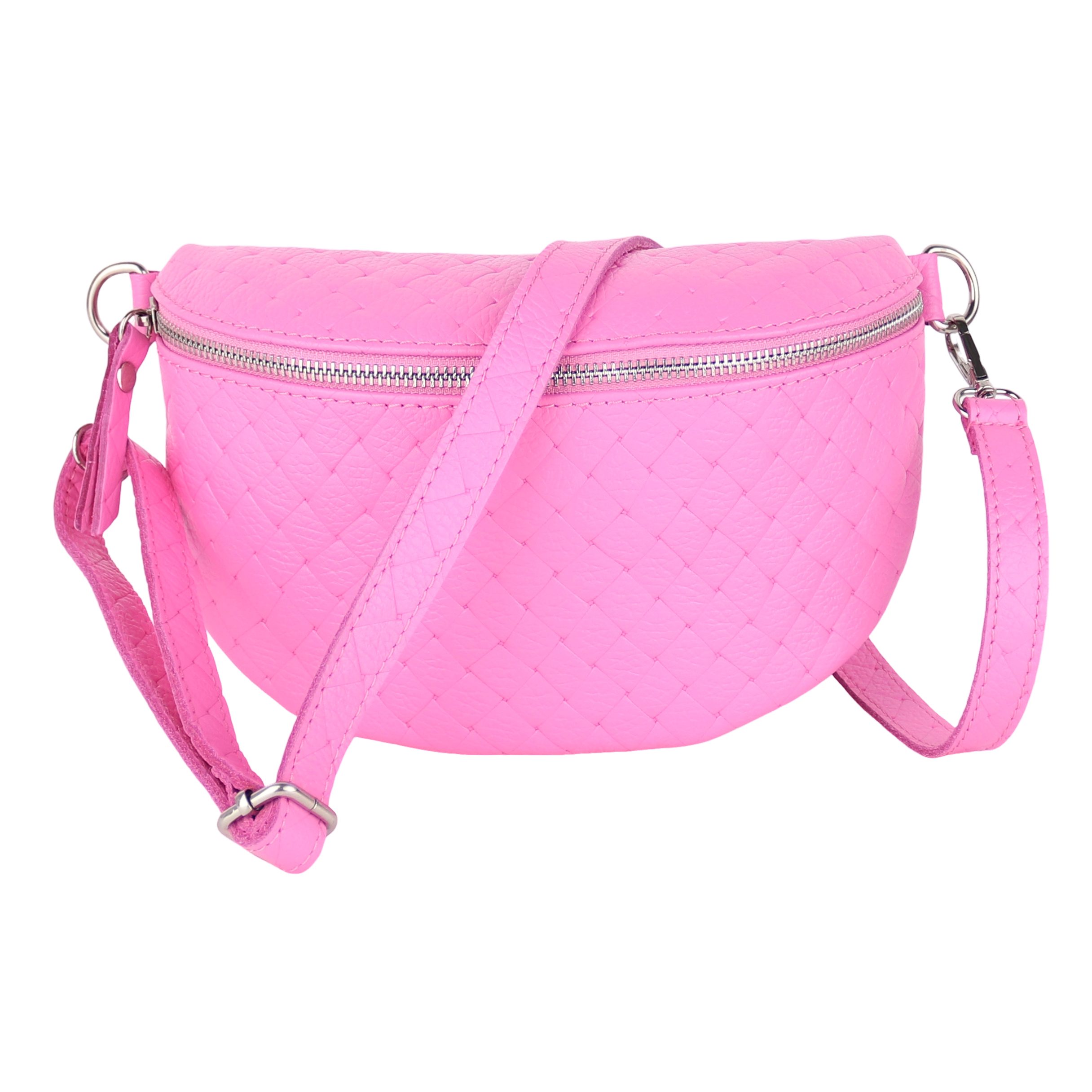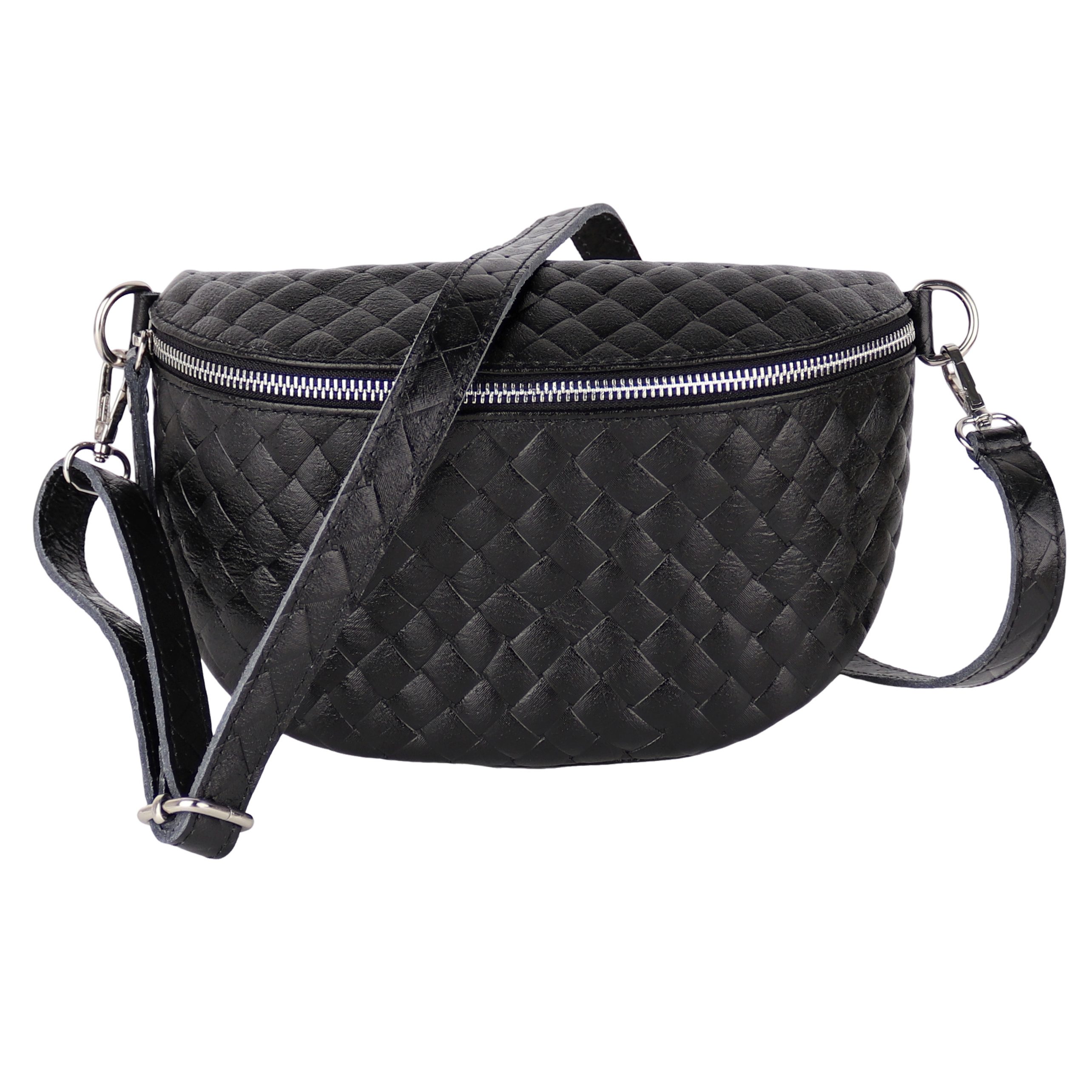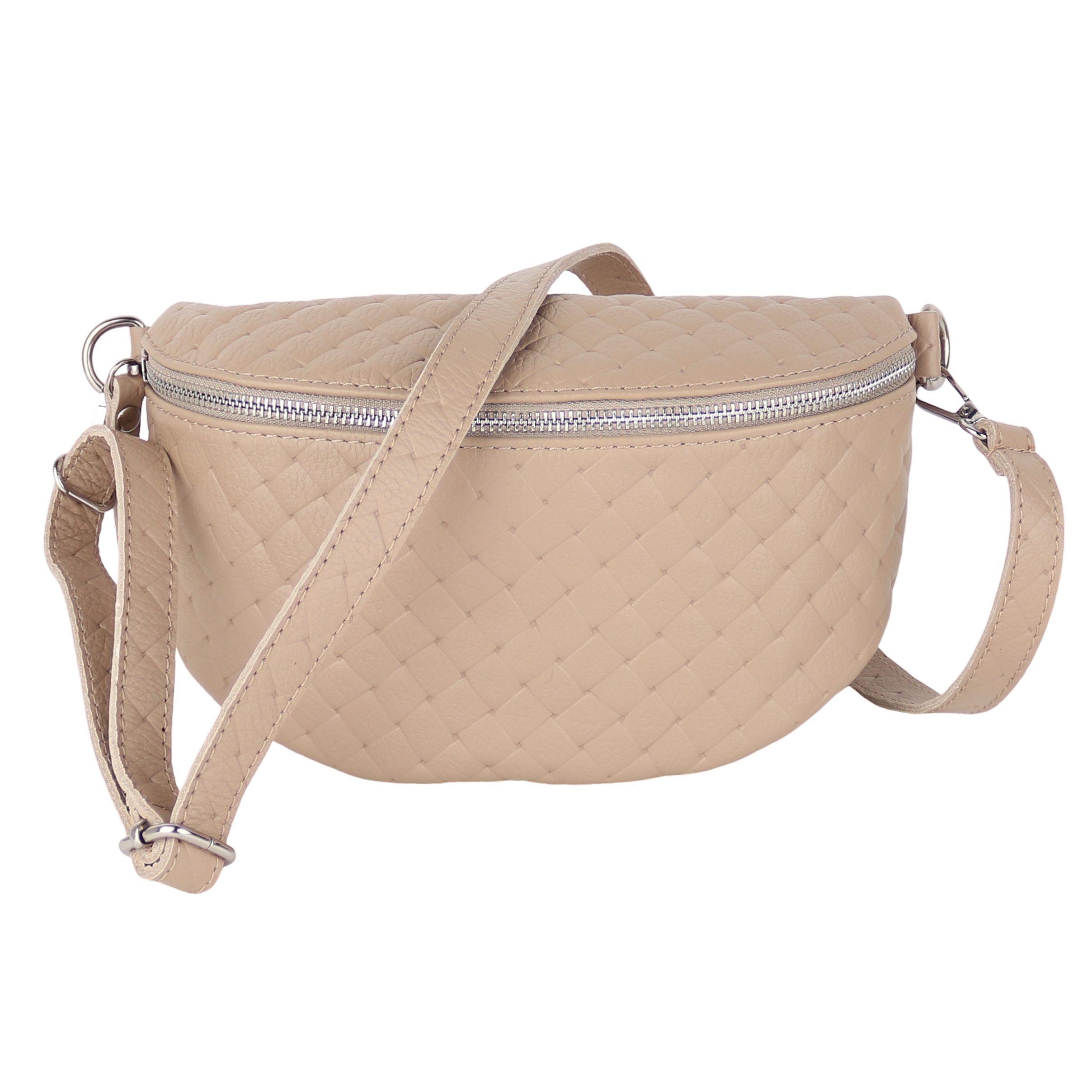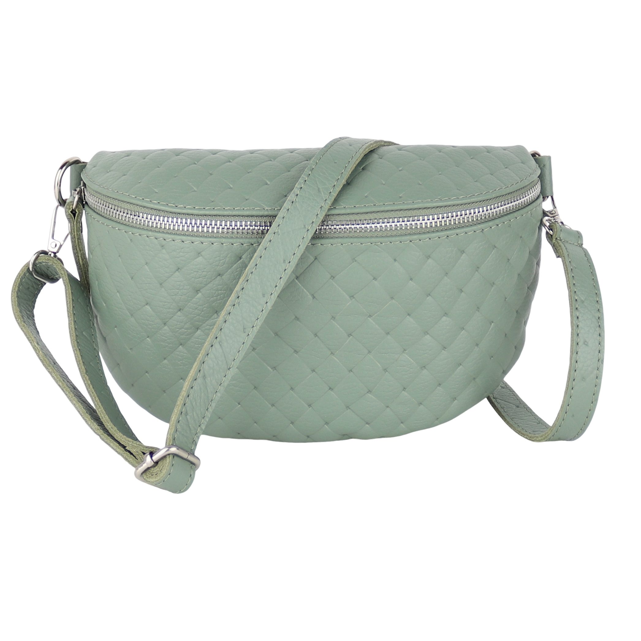 Diese edle Tasche wird in Italien aus hochwertigem, echtem Leder gefertigt und überzeugt mit einer eleganten Raute-Prägung, die ihr eine stilvolle Struktur verleiht. Die matte Oberfläche und die weiche Haptik werden durch robuste Reißverschlüsse und glänzende D-Ringe aus Edelstahl ergänzt. Der großzügige Innenraum bietet ausreichend Platz für all Ihre Essentials und verfügt über ein praktisches Reißverschlussfach zur sicheren Aufbewahrung kleinerer Gegenstände. Die präzisen Nähte und die hochwertige Verarbeitung garantieren eine lange Lebensdauer der Tasche. Dank des verstellbaren Schultergurts lässt sich die Tasche flexibel tragen – sei es im Alltag oder zu besonderen Anlässen.