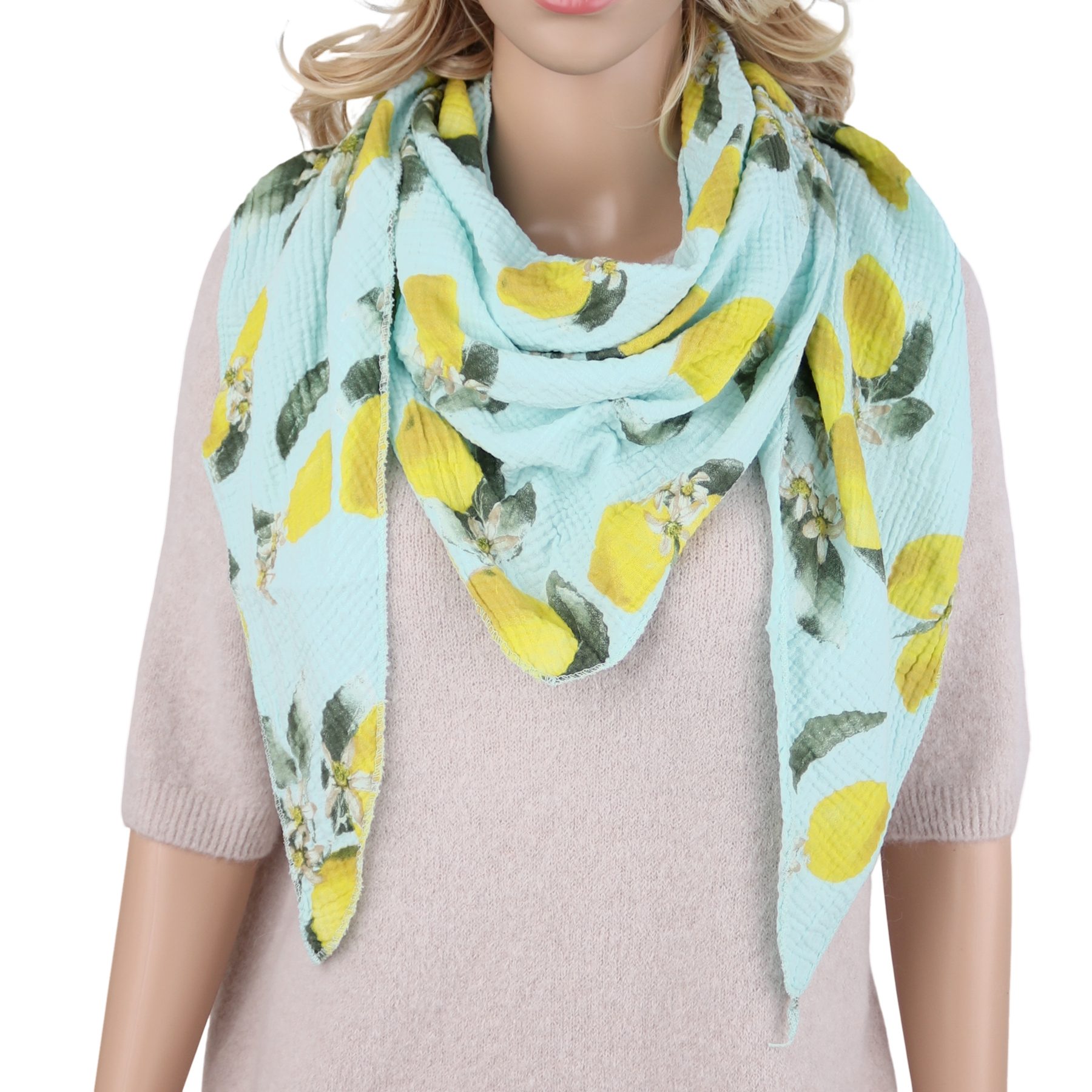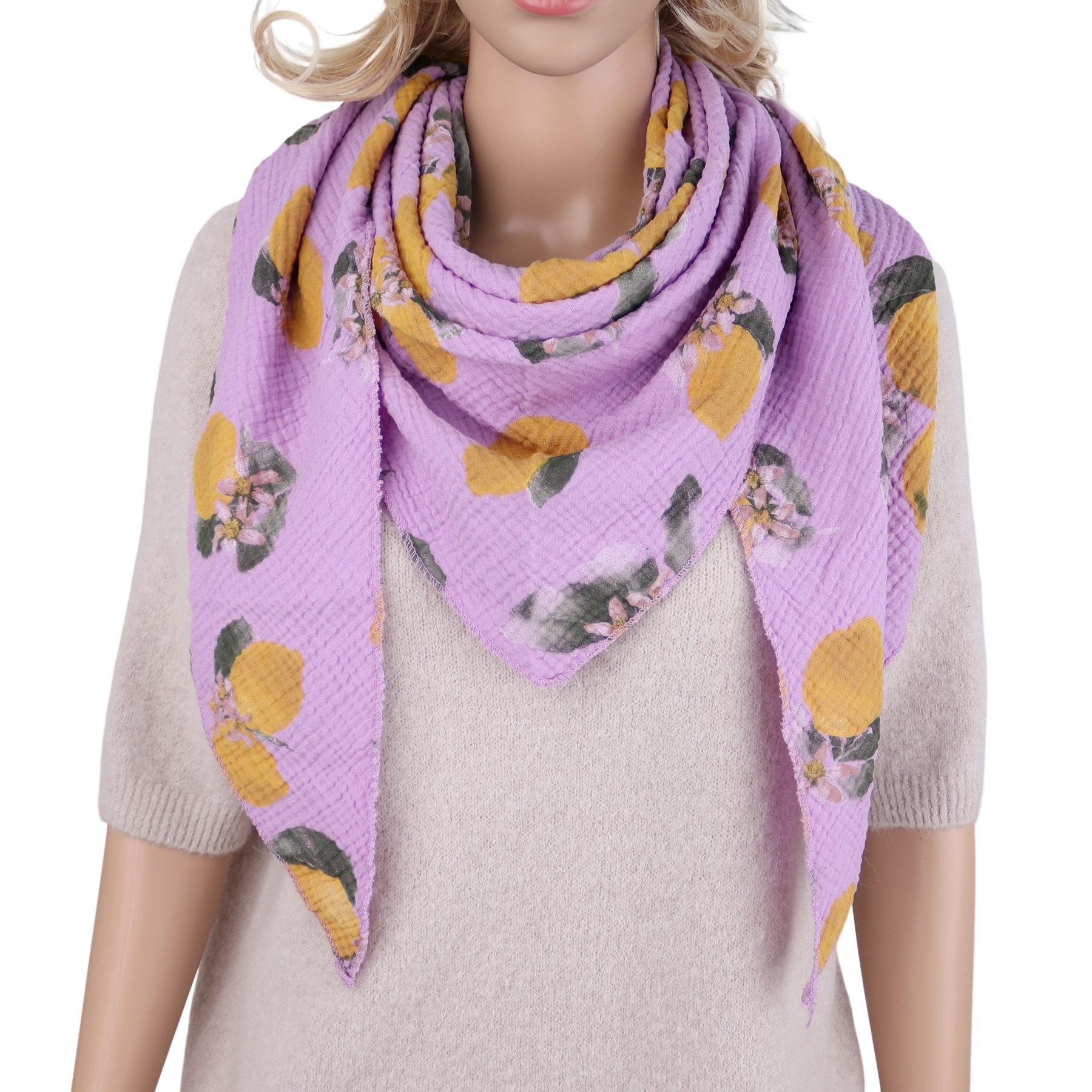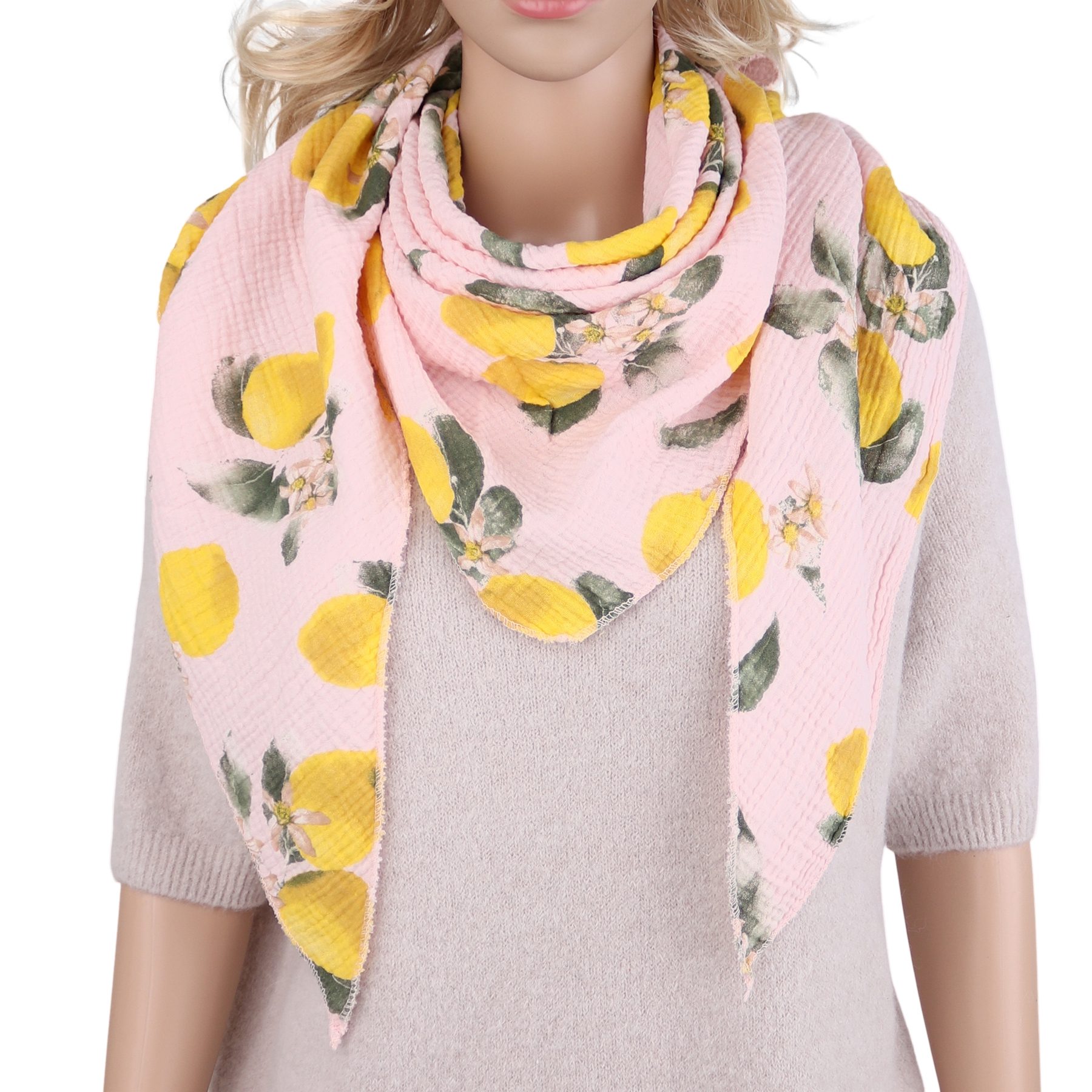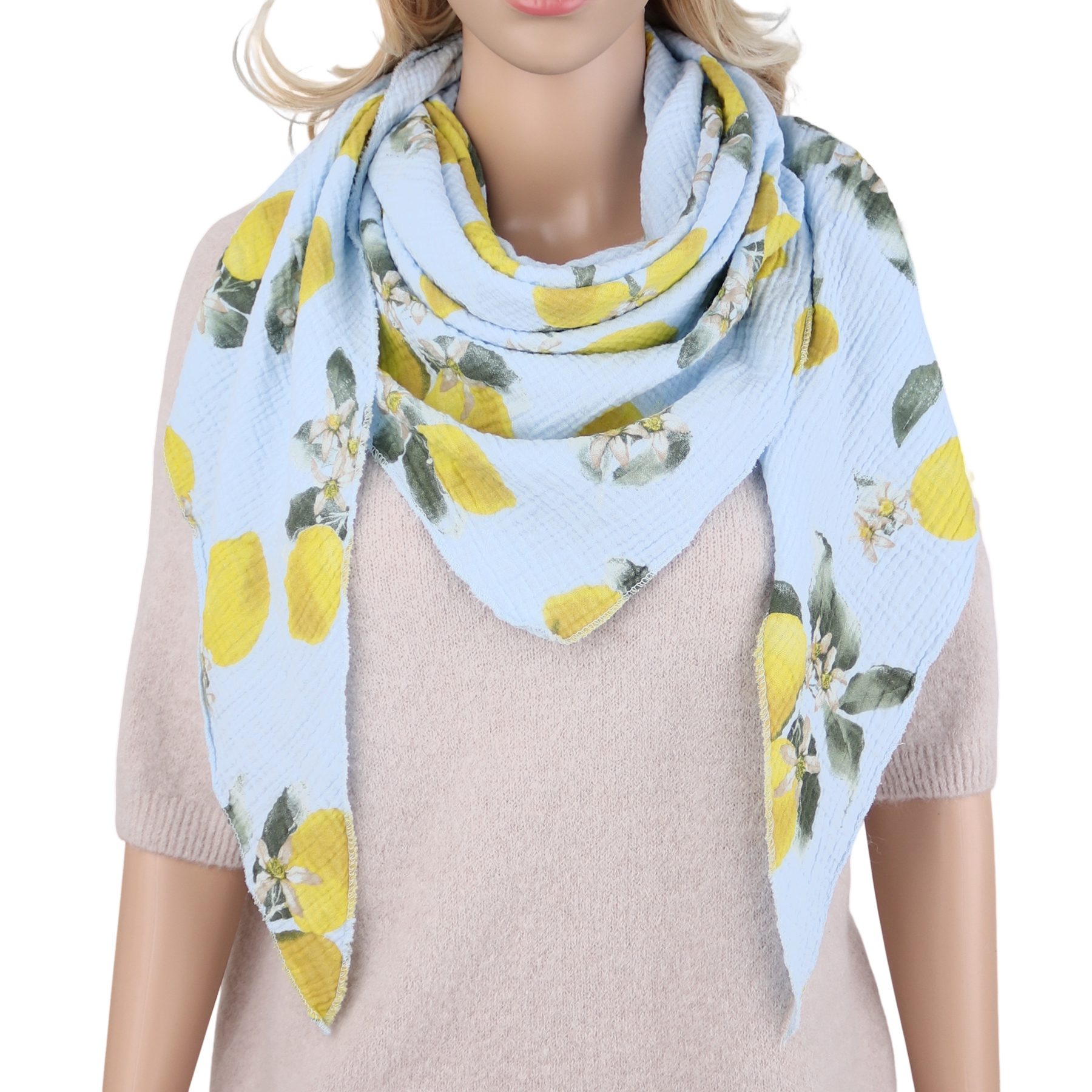 Verleihen Sie Ihrem Outfit das gewisse Etwas mit diesem hochwertigen Dreieckstuch in stylischer Optik (Lemon Print)! Das Tuch ist aus feinem Musselin gefertigt und bietet eine sanfte Textur, die sich angenehm auf der Haut anfühlt. Mit einer großzügigen Размер von ca. 185 x 80 cm lässt es sich vielseitig binden und stylen – ideal als lässiges Accessoire oder kuscheliger Begleiter.