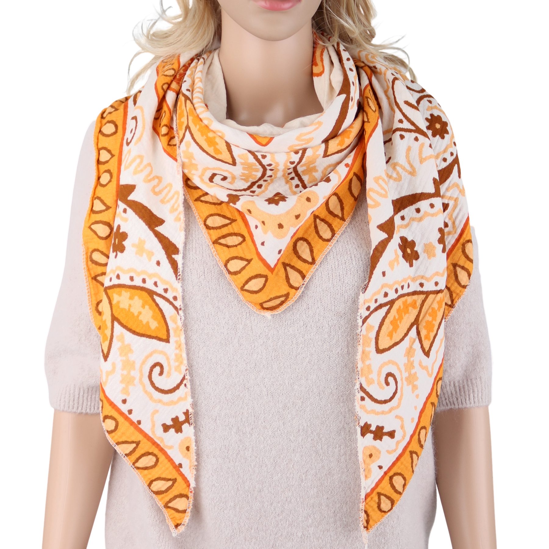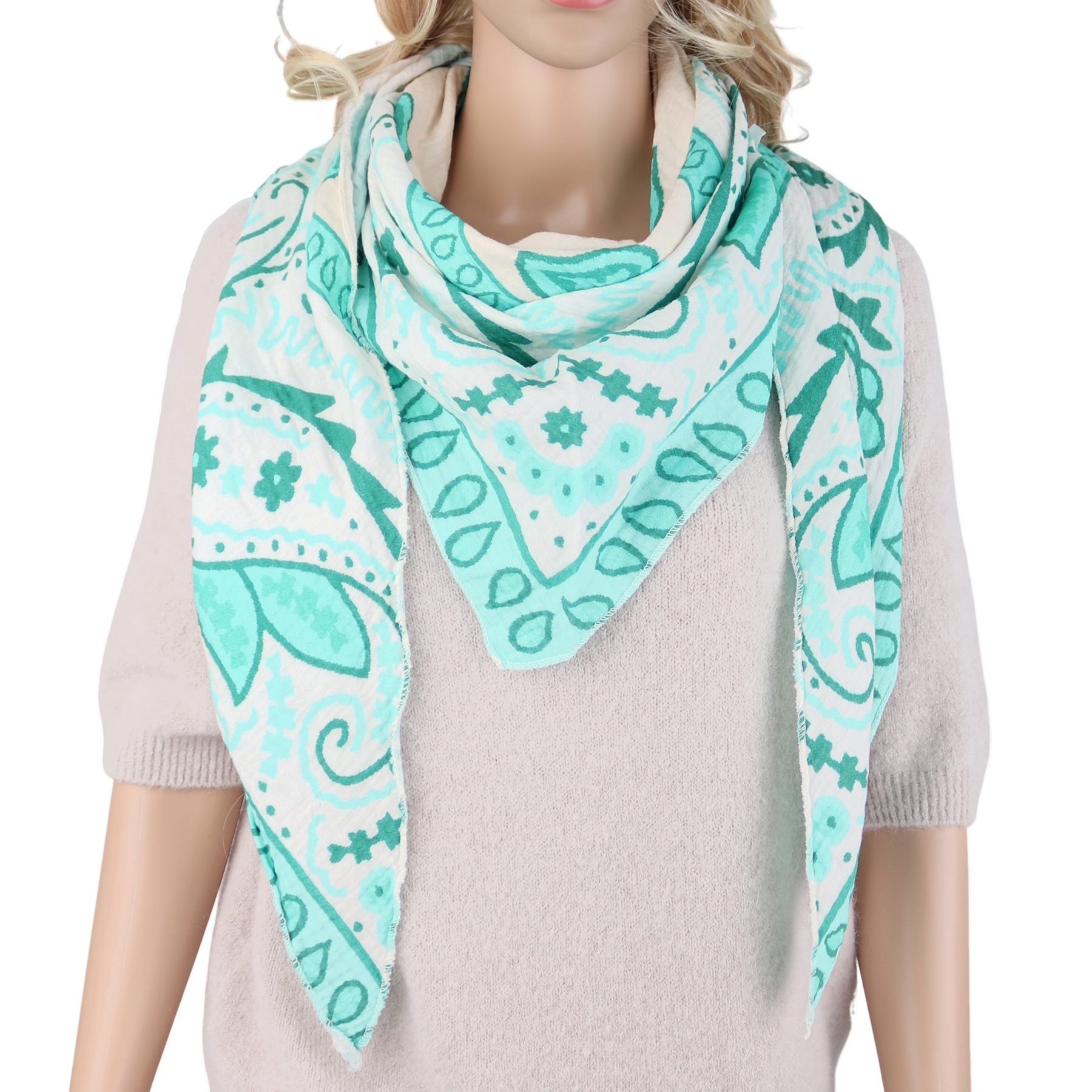Verleihen Sie Ihrem Outfit das gewisse Etwas mit diesem hochwertigen Dreieckstuch in angesagtem Paisley-Muster! Gefertigt aus feinem Musselin, bietet es eine sanfte Textur, die sich besonders angenehm auf der Haut anfühlt. Mit einer großzügigen Размер lässt es sich auf vielfältige Weise binden und stylen – perfekt als modisches Statement oder kuscheliger Begleiter.