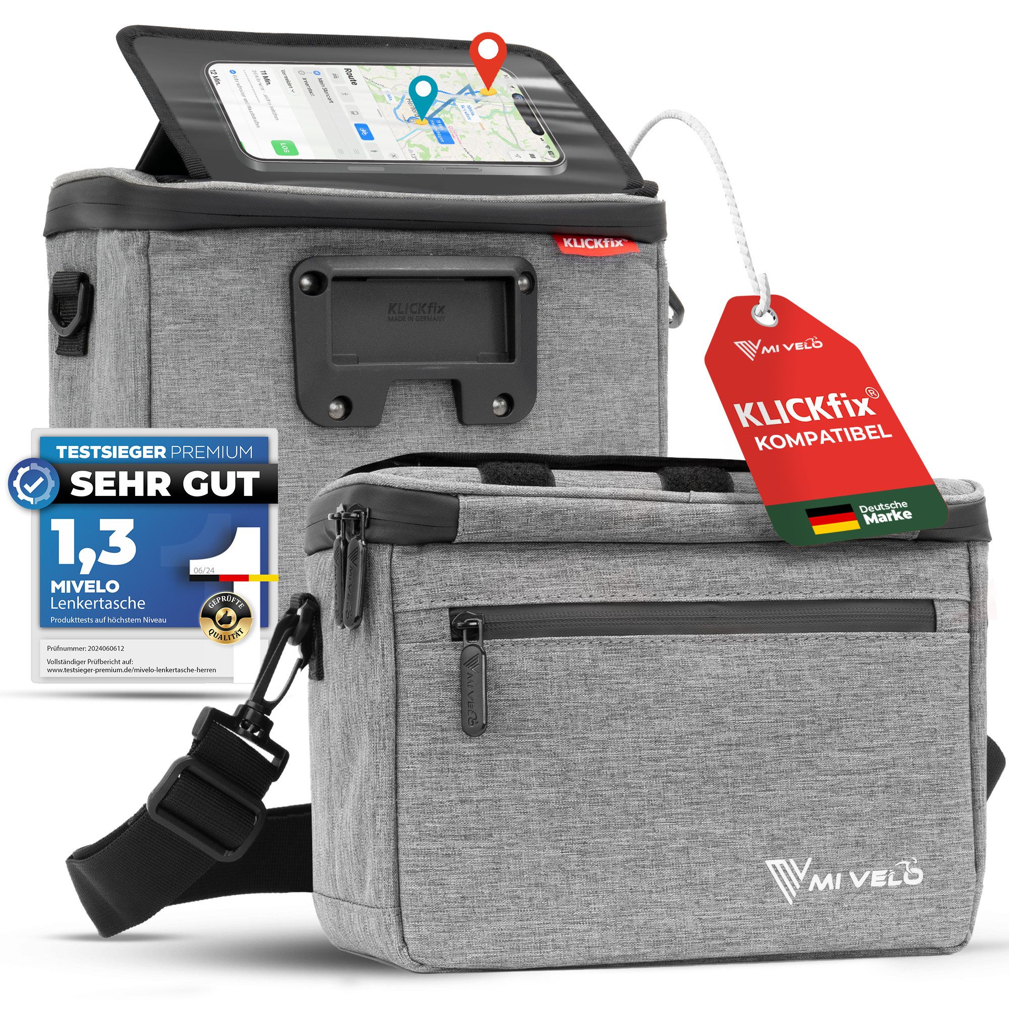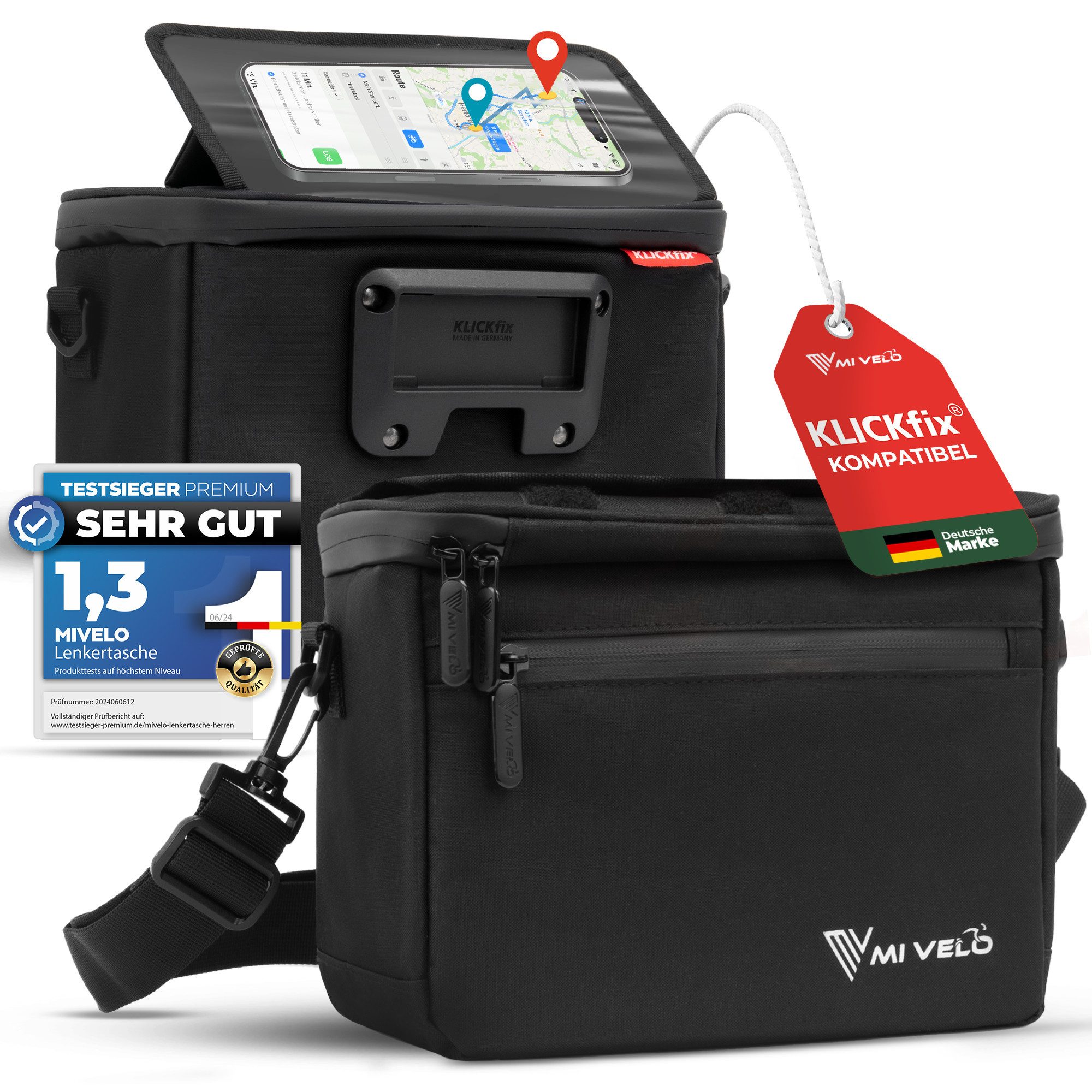 Die Fahrradtasche ist KLICKfix-kompatibel (Made in Germany), was ein einfaches und schnelles Befestigen oder Abnehmen am Fahrradlenker ermöglicht. Die Halterung bietet sicheren Halt während der Fahrt, selbst bei unebenem Gelände. Die Tasche kann optional mit oder ohne Lenkeradapter erworben werden und ist kompatibel mit E-Bikes, Mountainbikes, Cityrädern und mehr.