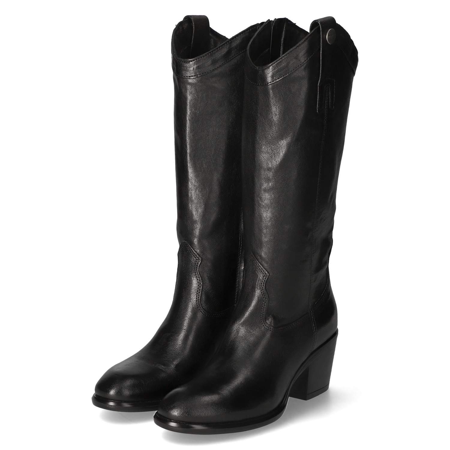 Die Mjus Damen Stiefel im Westernstil in edlem Schwarz aus Glattleder vereinen Funktionalität und trendiges Design. Der praktische Reißverschluss und die Anziehhilfe erleichtern das An- und Ausziehen, während die Ziernähte im Westerndesign für einen stilvollen Akzent sorgen. Das leichte, weiche Textilinnenfutter garantiert hohen Tragekomfort, während die flexible Laufsohle und der Blockabsatz von ca. 6 cm zusätzlichen Halt bieten. Mit einem Schaft von ca. 33 cm Höhe und 34 cm Umfang sind diese Stiefel nicht nur modisch, sondern auch bequem für den ganzen Tag.
