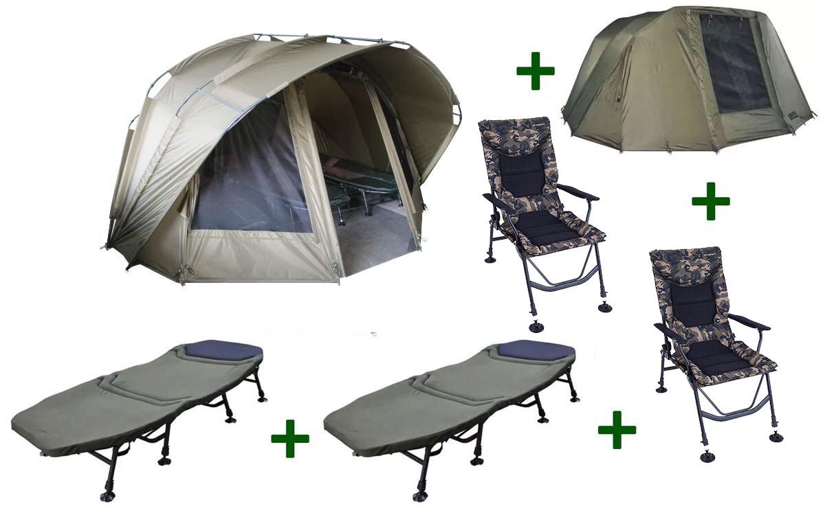 3,5 Man 2.0 MK Shelter mit Winterskin plus 2 Platinum Bedchairs und 2 Recliner Carpchairs