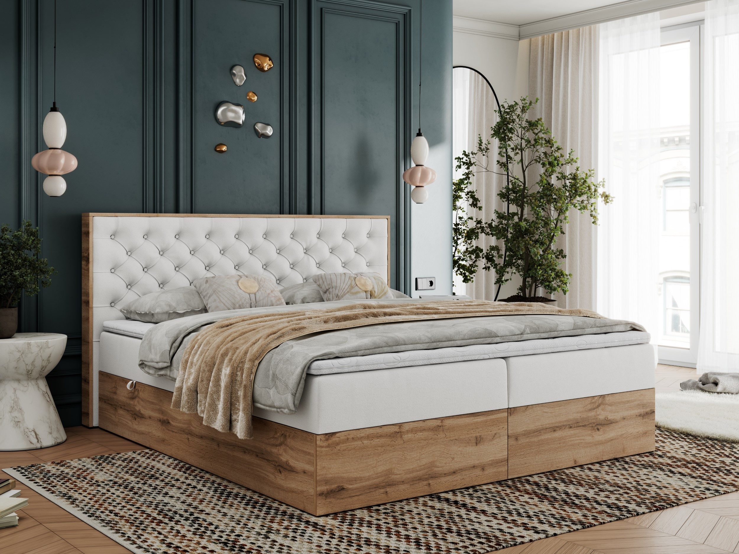 Das weich gepolsterte Kopfteil mit attraktiver Steppung verleiht dem Bett mit Stauraum eine elegante Optik und eine behagliche Atmosphäre. Dekorative Elemente aus hochwertigsten Möbelplatten garantieren Stabilität, Langlebigkeit, aber auch Eleganz. Das Boxspringbett mit Matratze verfügt über eine Möbelplattenverarbeitung am Bettkästen und am Kopfteil. Die Farbe der Möbelplatte am Bettrahmen und Kopfteil ist Wotan Eiche.