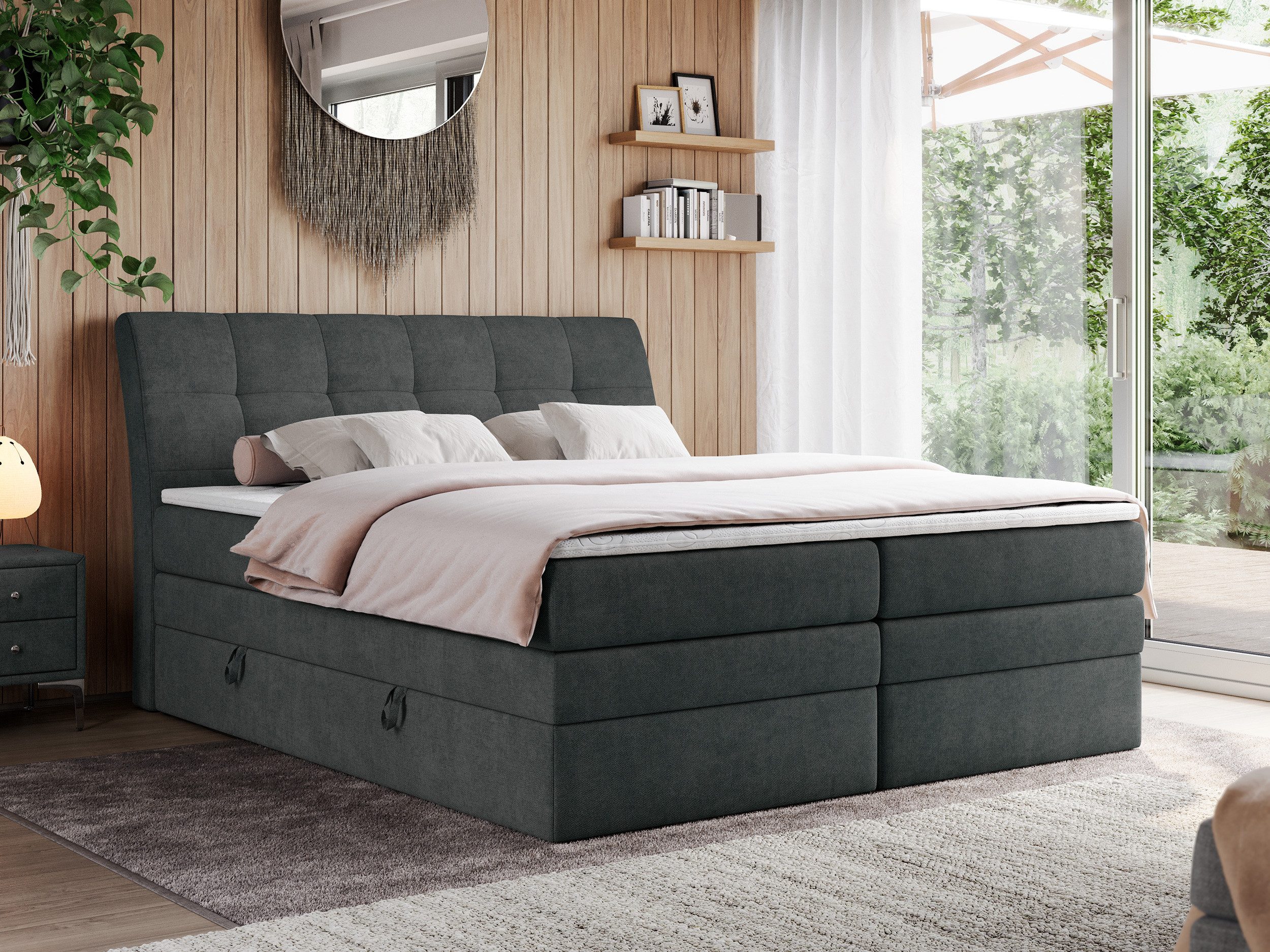 Das Boxspringbett mit mehreren Aufbewahrungsmöglichkeiten ist aus stabilen und extrem langlebigen Materialien gefertigt und wird standardmäßig mit einem doppelten Aufbewahrungskasten und einer PREMIUM-Matratzen geliefert