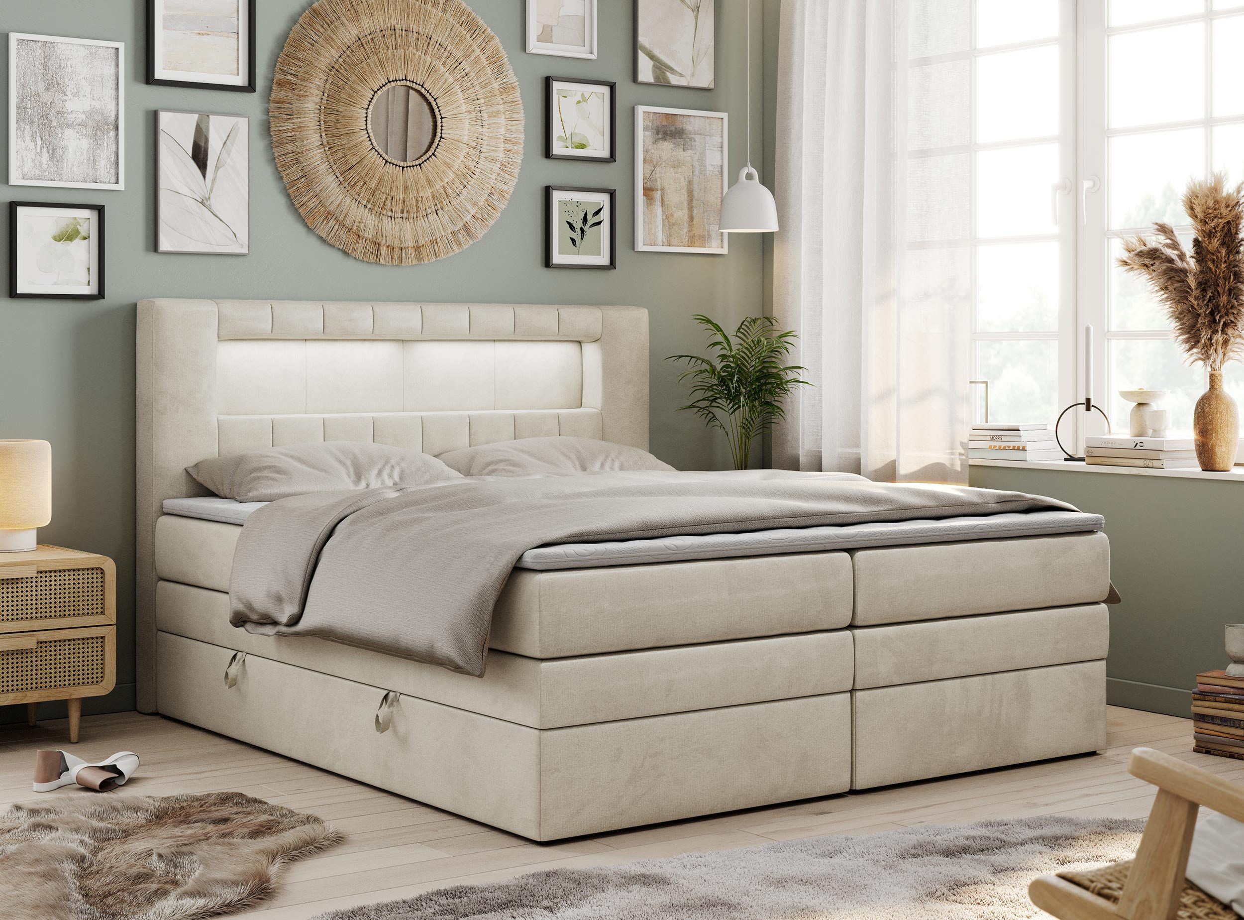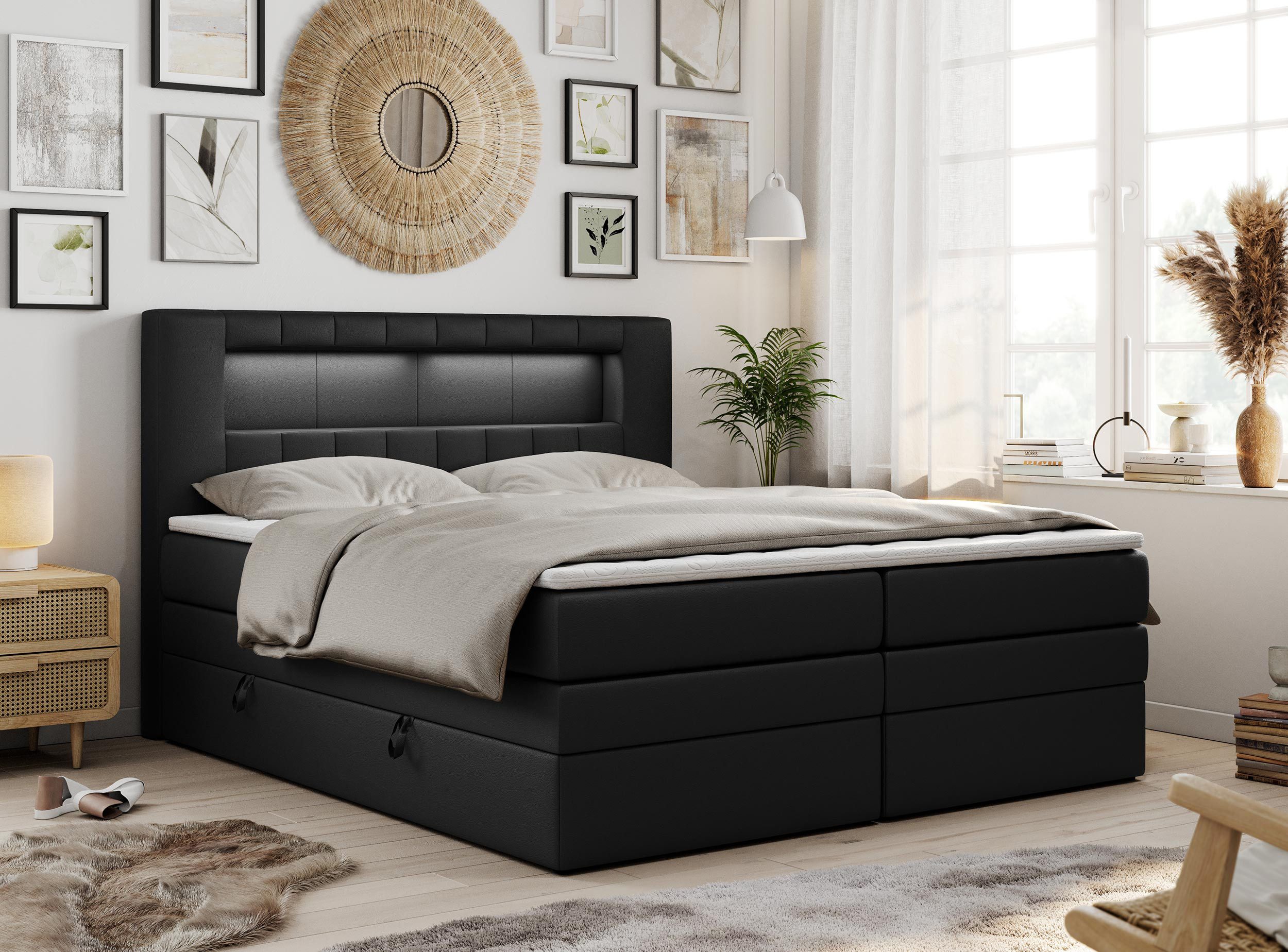 Das Boxspringbett mit mehreren Aufbewahrungsmöglichkeiten ist aus stabilen und extrem langlebigen Materialien gefertigt und wird standardmäßig mit einem doppelten Aufbewahrungskasten und einer PREMIUM-Matratzen geliefert