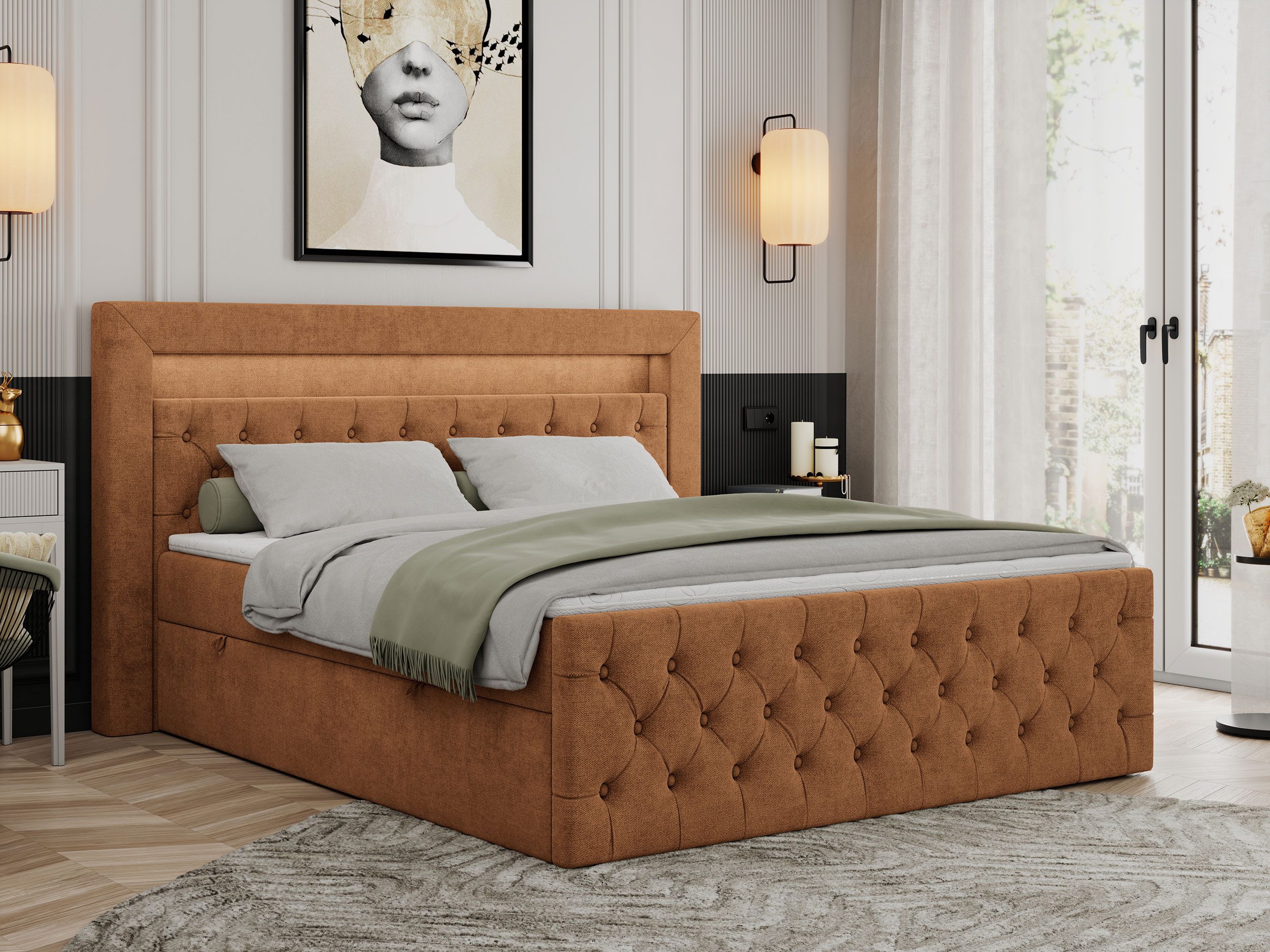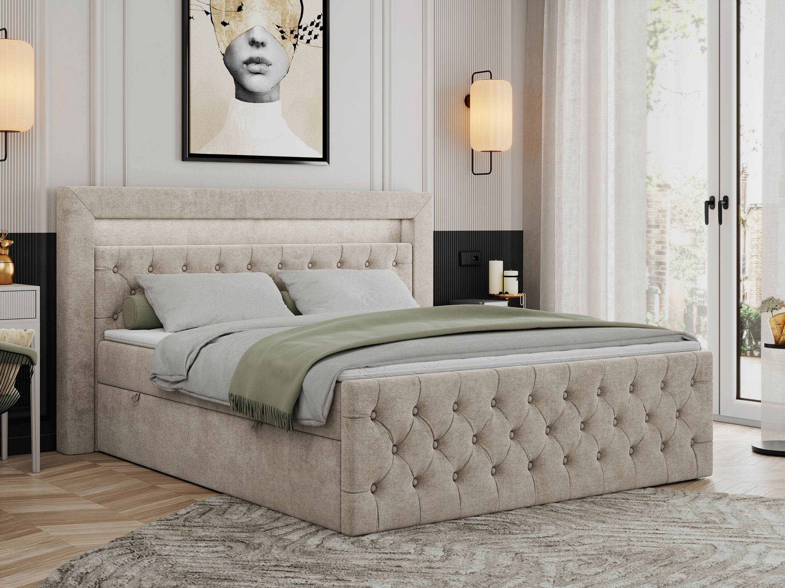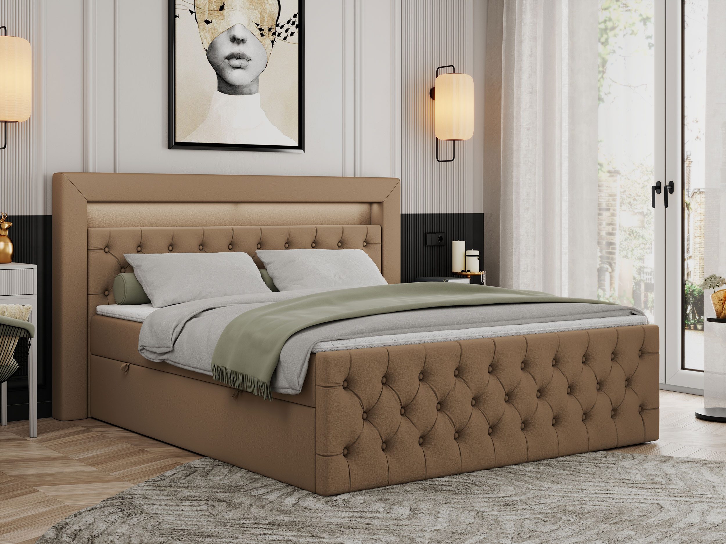 Das Boxspringbett mit mehreren Aufbewahrungsmöglichkeiten ist aus stabilen und extrem langlebigen Materialien gefertigt und wird standardmäßig mit einem doppelten Aufbewahrungskasten und einer PREMIUM-Matratze geliefert