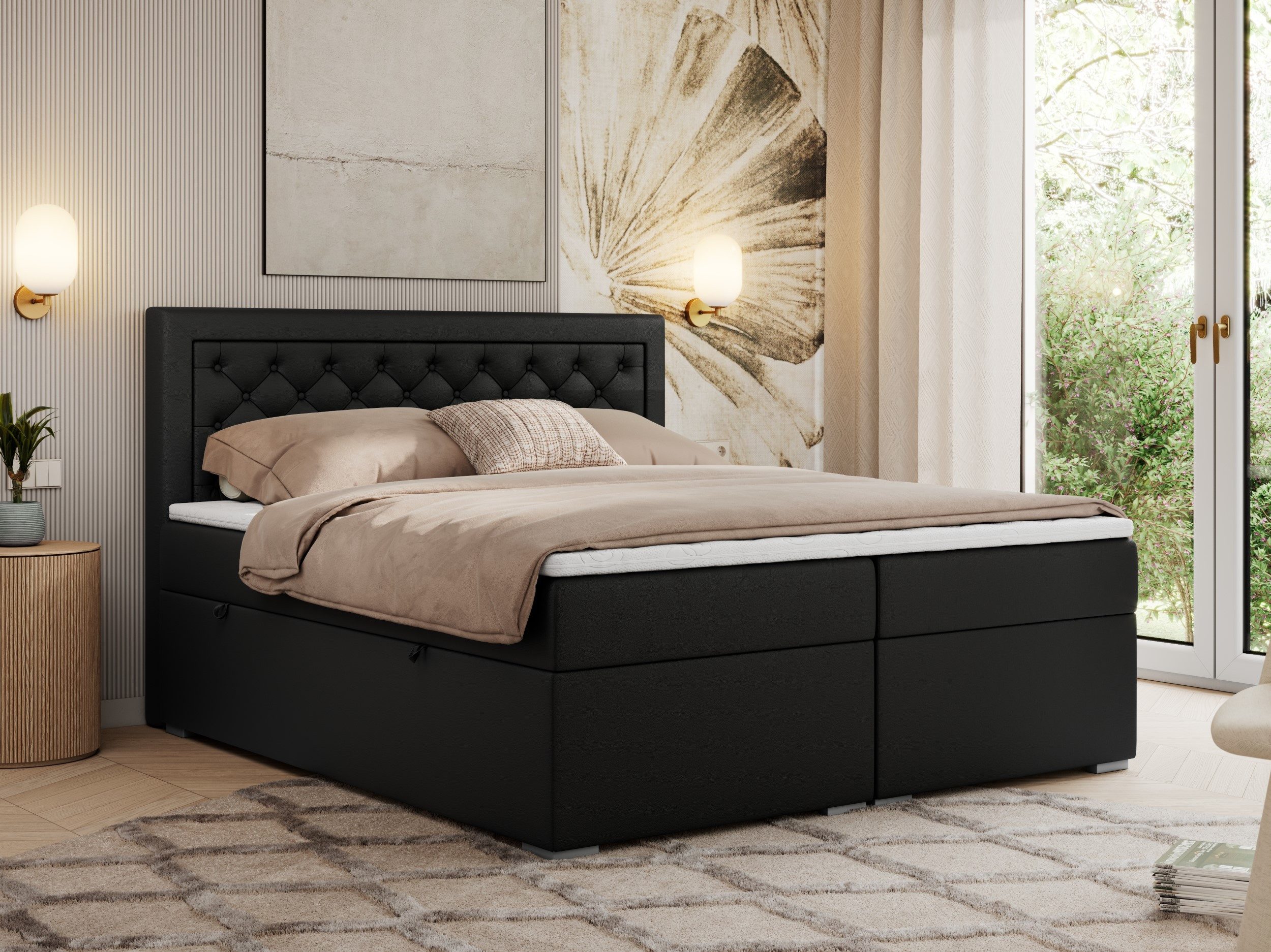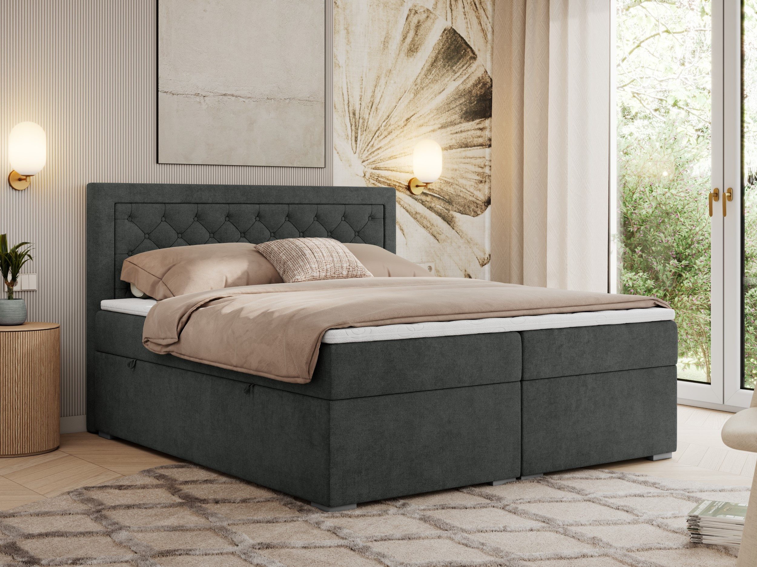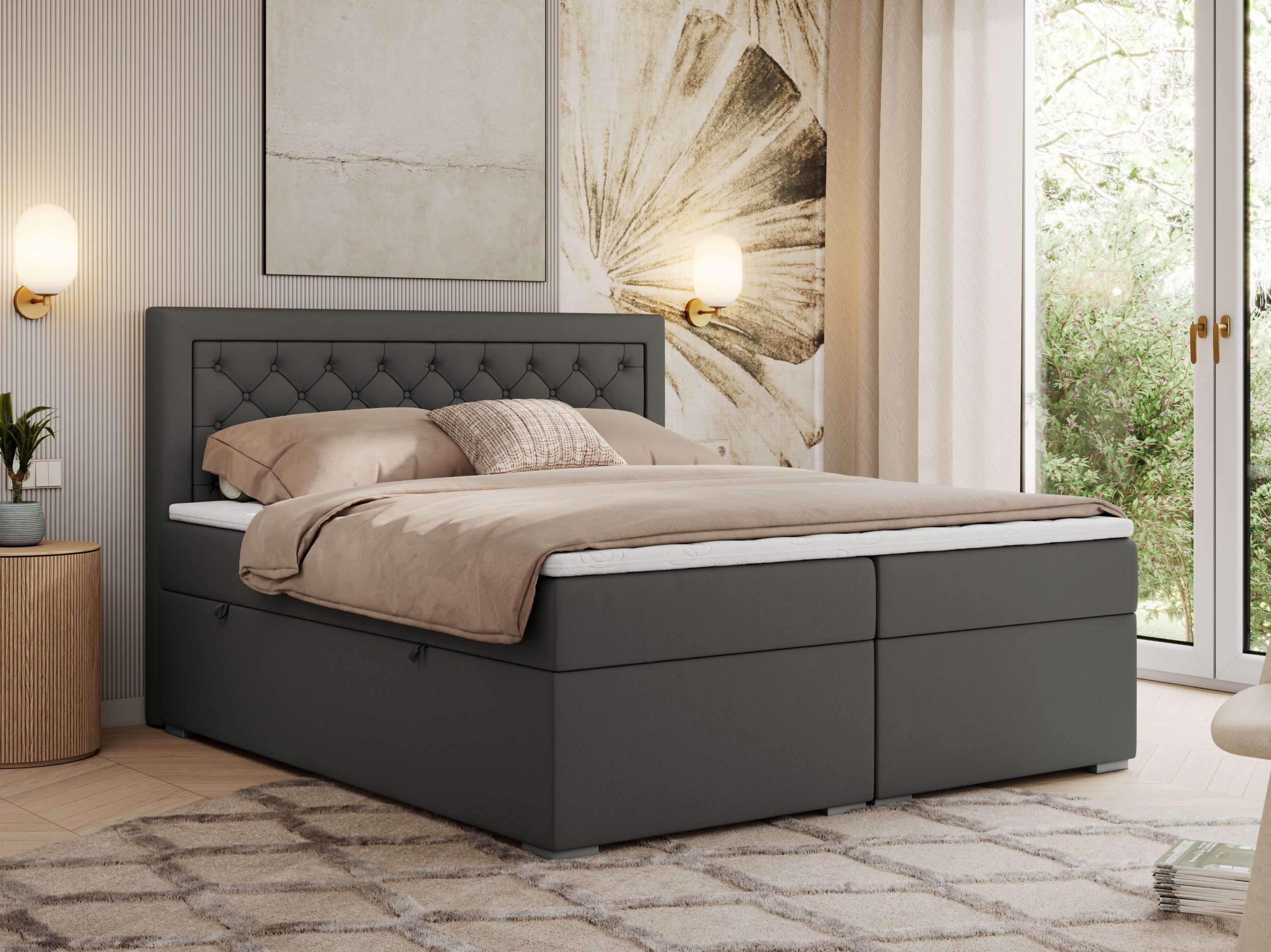 Das Boxspringbett mit Stauraum ist mit zwei 7-Zonen-Taschenfederkernmatratzen der Härte H3 oder H4 ausgestattet – zur Auswahl. Sie können das optimale Komfortniveau wählen. Die Multipocket-Federn passen sich individuell an Ihren Körper an, und jede Tasche funktioniert unabhängig voneinander. Die Verwendung hochwertiger T30-Schaum garantiert eine Körperunterstützung. Kunststofffüße verleihen dem Boxspringbett eine moderne Note, während der T25-Topper den Komfort noch weiter steigert und ein weiches, einladendes Schlafgefühl erzeugt.