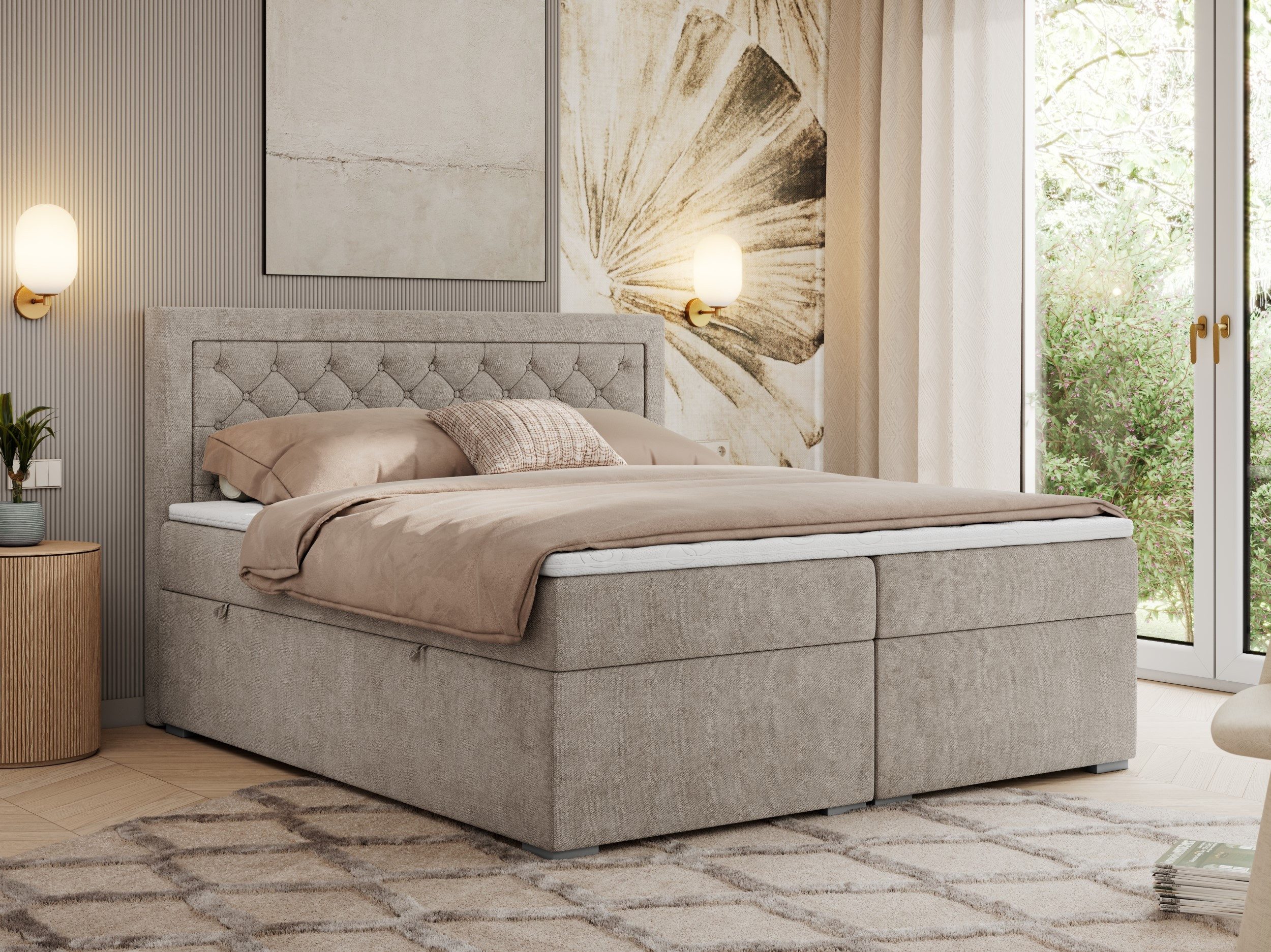 Dieses Doppelbett mit einem stilvoll gesteppten Kopfteil und dekorativen Knöpfen sind nicht nur ein Blickfang, sondern bietet mit zwei integrierten Bettkästen auch reichlich Stauraum für Bettzeug und persönliche Gegenstände – ideal für Ordnung und Stil im Schlafzimmer. Dieses Boxspringbett mit Bettkasten ist ideal für alle, die ein Bett mit Stauraum suchen. Der gesteppte Kopfteil, geschmückt mit stilvollen Knöpfen, strahlt zeitlose Eleganz aus und sorgt für höchsten Komfort beim Entspannen.