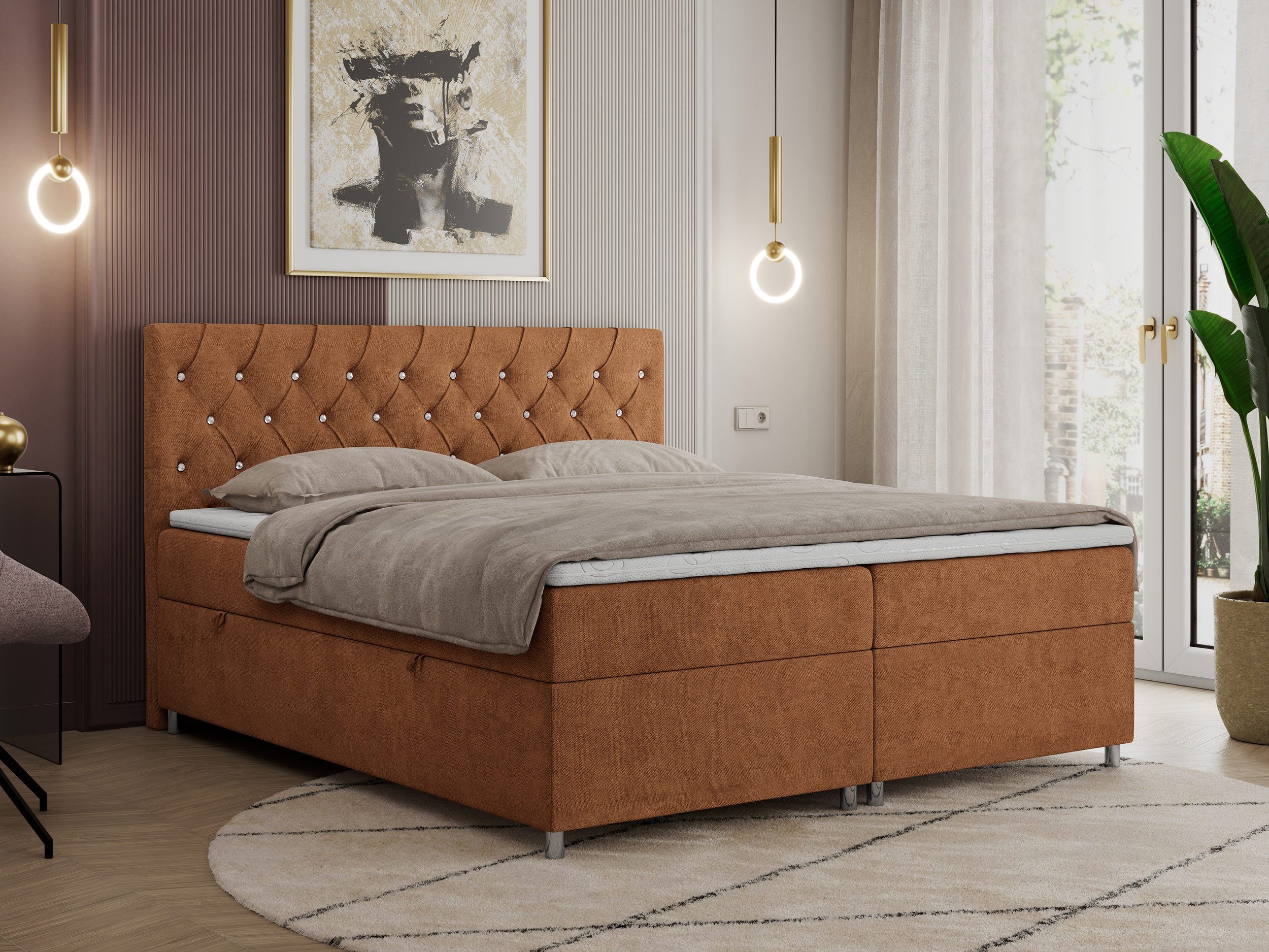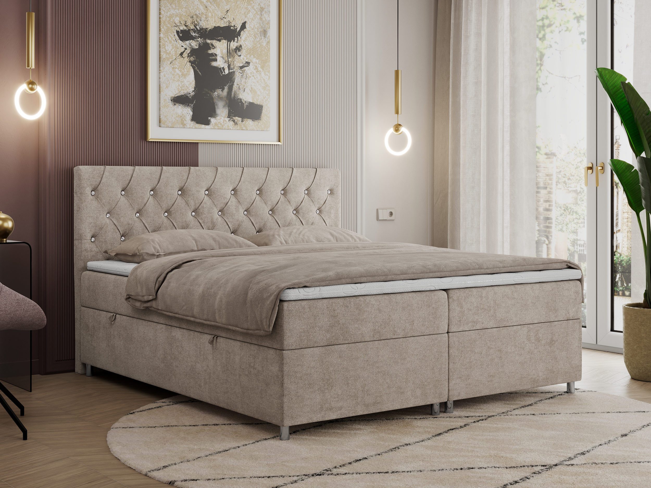 Das Boxspringbett mit mehreren Aufbewahrungsmöglichkeiten ist aus stabilen und extrem langlebigen Materialien gefertigt und wird standardmäßig mit einem doppelten Aufbewahrungskasten und einer PREMIUM-Matratze geliefert