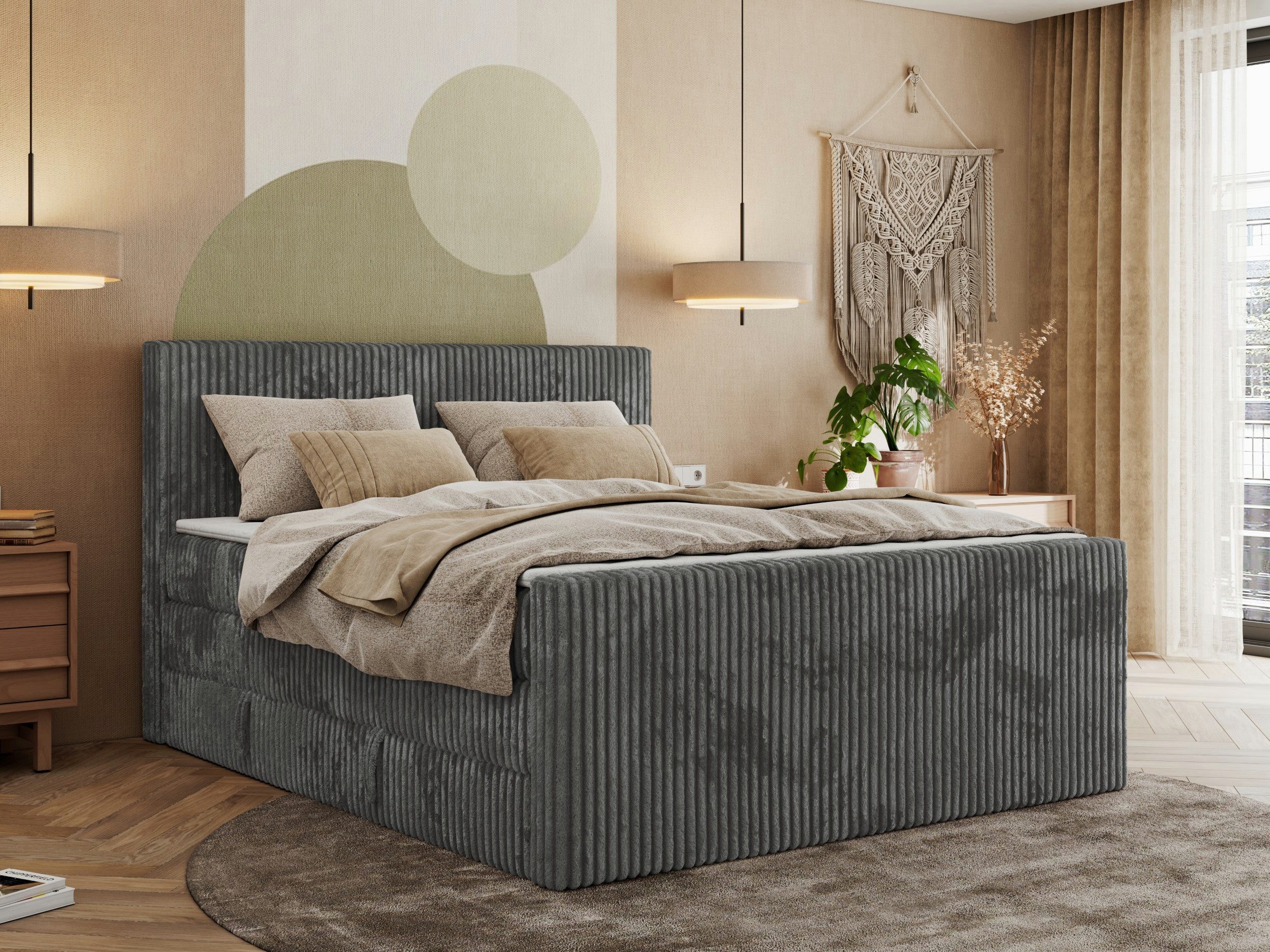 Dieses Boxspringbett mit Bettkästen ist die perfekte Harmonie aus Komfort, Qualität und Eleganz. Das Bett mit Matratze und Kopfteil bietet nicht nur erholsamen Schlaf, sondern wird auch zum zentralen Element des Interieurs – einem Ort der Entspannung und einer echten Wohlfühloase.