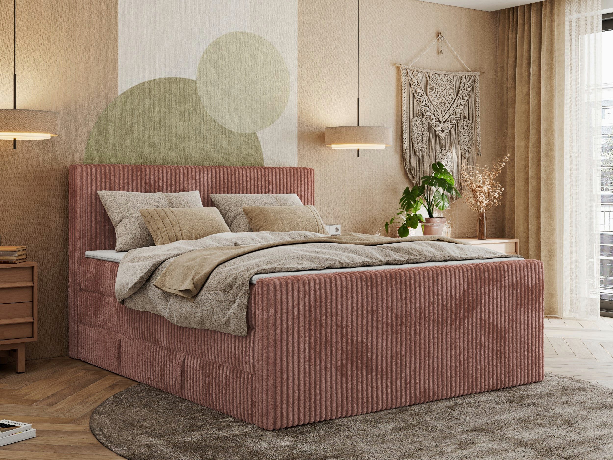 Besonderes Augenmerk verdient der exklusive Stoff TILIA – ein samtiger, cordähnlicher Bezug, der mit seiner Weichheit und luxuriösen Optik begeistert. Dieses edle Material zeichnet sich durch dickes, samtiges Flor aus, das sich in Streifen anordnet. Die Strapazierfähigkeit des Stoffes sorgt dafür, dass das Boxspringbett mit Fußteil, auch bei intensiver Nutzung seine makellose Optik bewahrt und ihm einen einzigartigen, dekorativen Charakter verleiht.