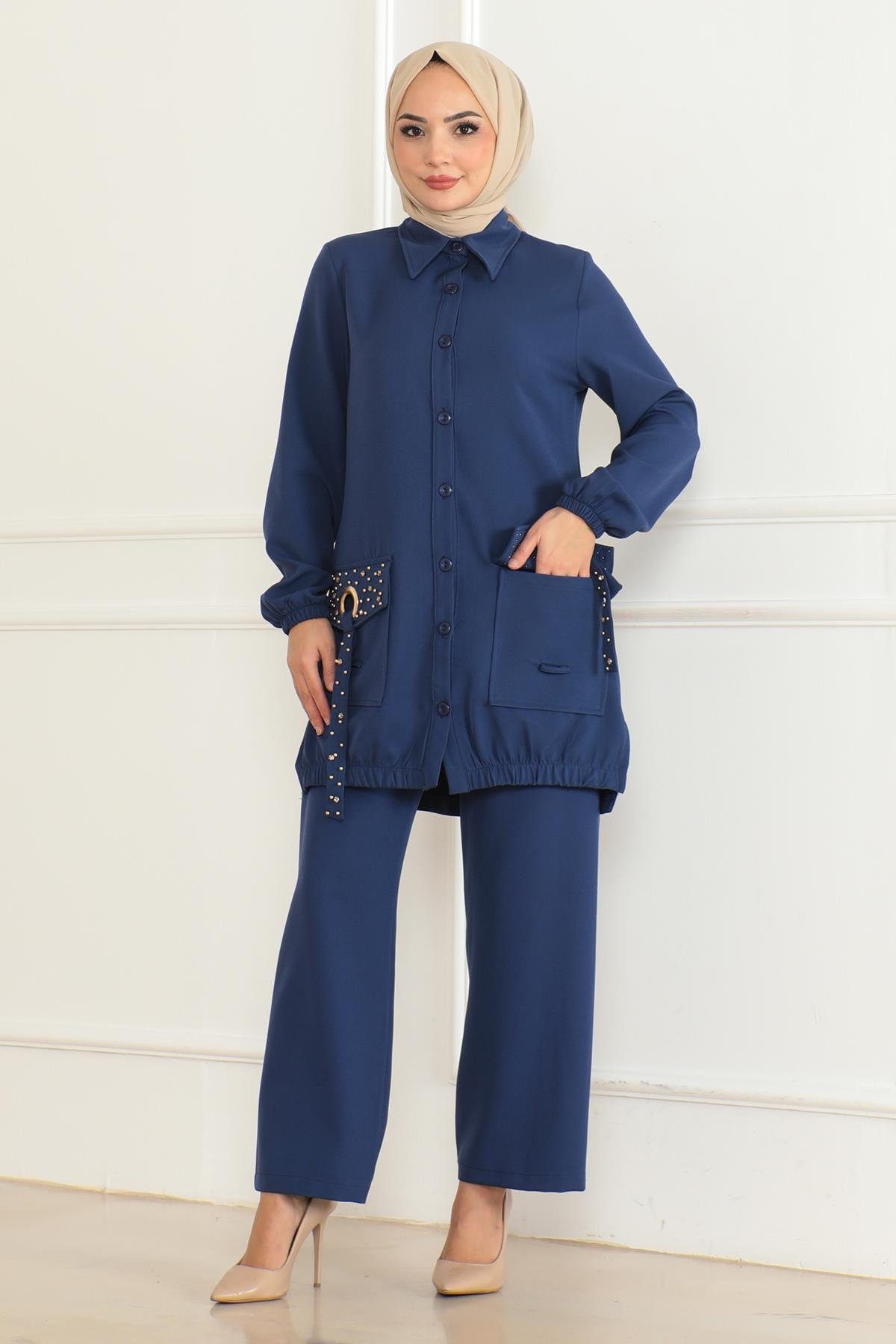 Stoffmerkmal: Hergestellt aus doppelter Stofflage.Produktmerkmal: Es handelt sich um ein neues Hijab-Modell der Saison. Es ist ungefüttert und verfügt über vordere Knöpfe, die verwendet werden können. Die Tasche ist mit Stein-Details verziert. Die Ärmelbündchen sind elastisch. Die Hose hat einen elastischen Bund. Aufgrund von Konzeptaufnahmen kann es zu Farbabweichungen kommen. Das
