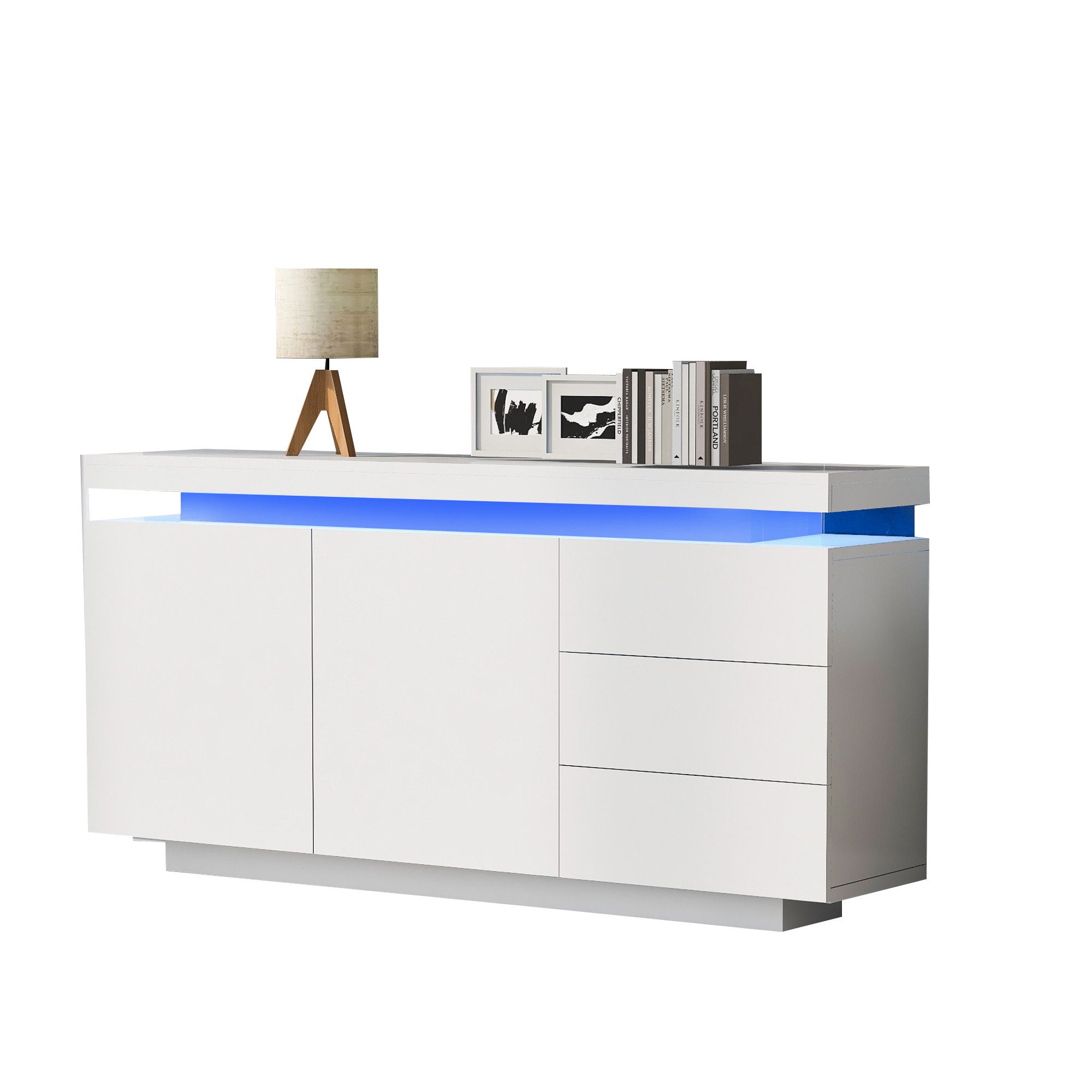 Das moderne Design in Weiß und die Verwendung von hochwertiger Spanplatte machen dieses Möbelstück nicht nur ästhetisch ansprechend, sondern auch langlebig und zuverlässig. Es verfügt über 2 Schränke und 3 Schubladen, die Ihnen vielseitige Aufbewahrungsmöglichkeiten bieten.