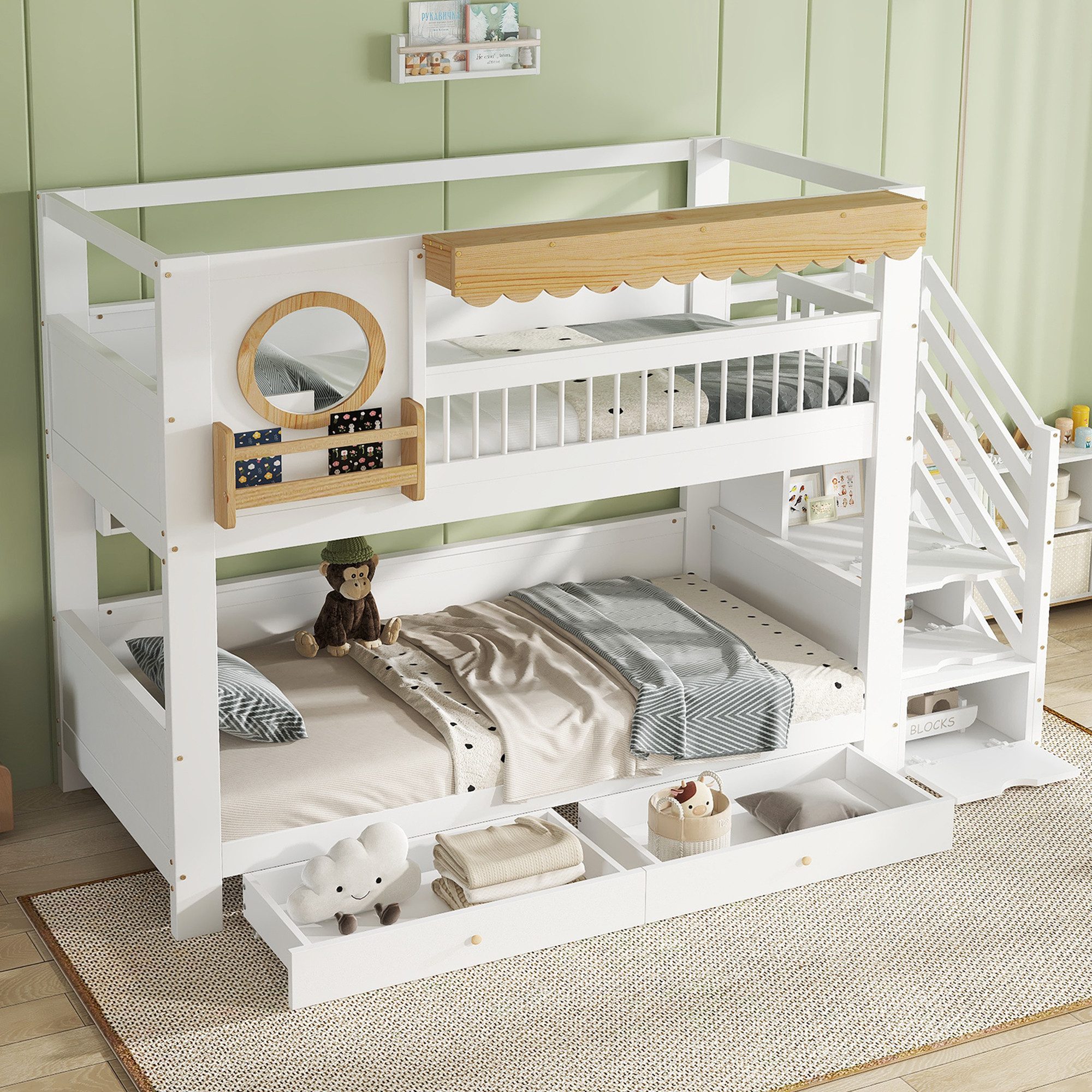 3. Exquisites Design: Das Etagenbett vereint ein raffiniertes Design mit stabilen Materialien. Die Kombination aus Kiefer und MDF in Weiß und Naturfarbe verleiht dem Möbelstück eine ansprechende Optik, die jeden Raum aufpeppt und gleichzeitig robust ist.