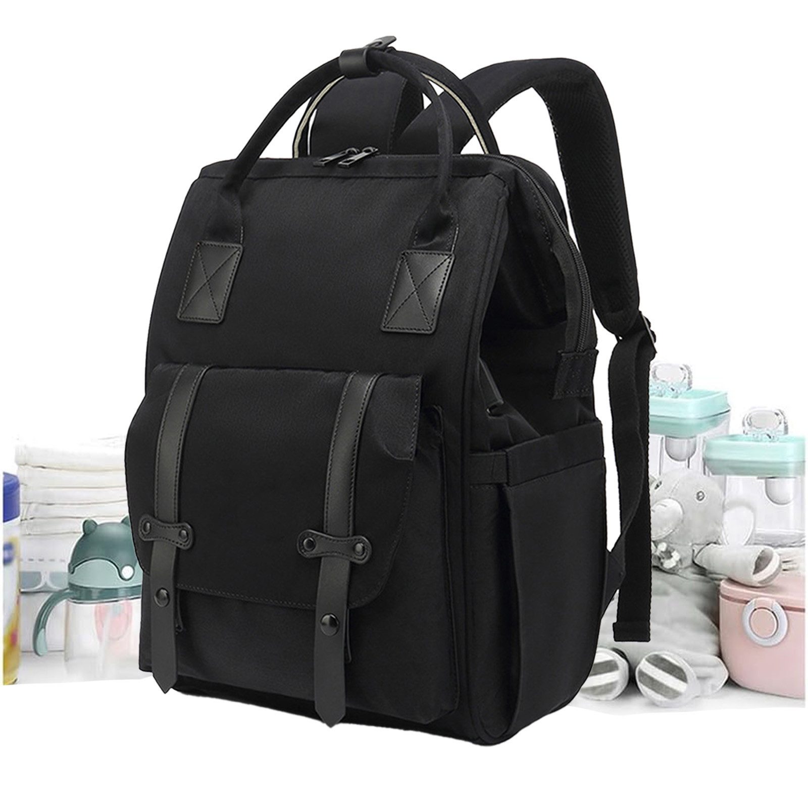 Mehrere Fächer für alles Wichtige: Hauptfach mit Unterteilungen für Windeln, Fläschchen, Wechselkleidung, Spielzeug und Elternutensilien wie Geldbörse oder Handy.