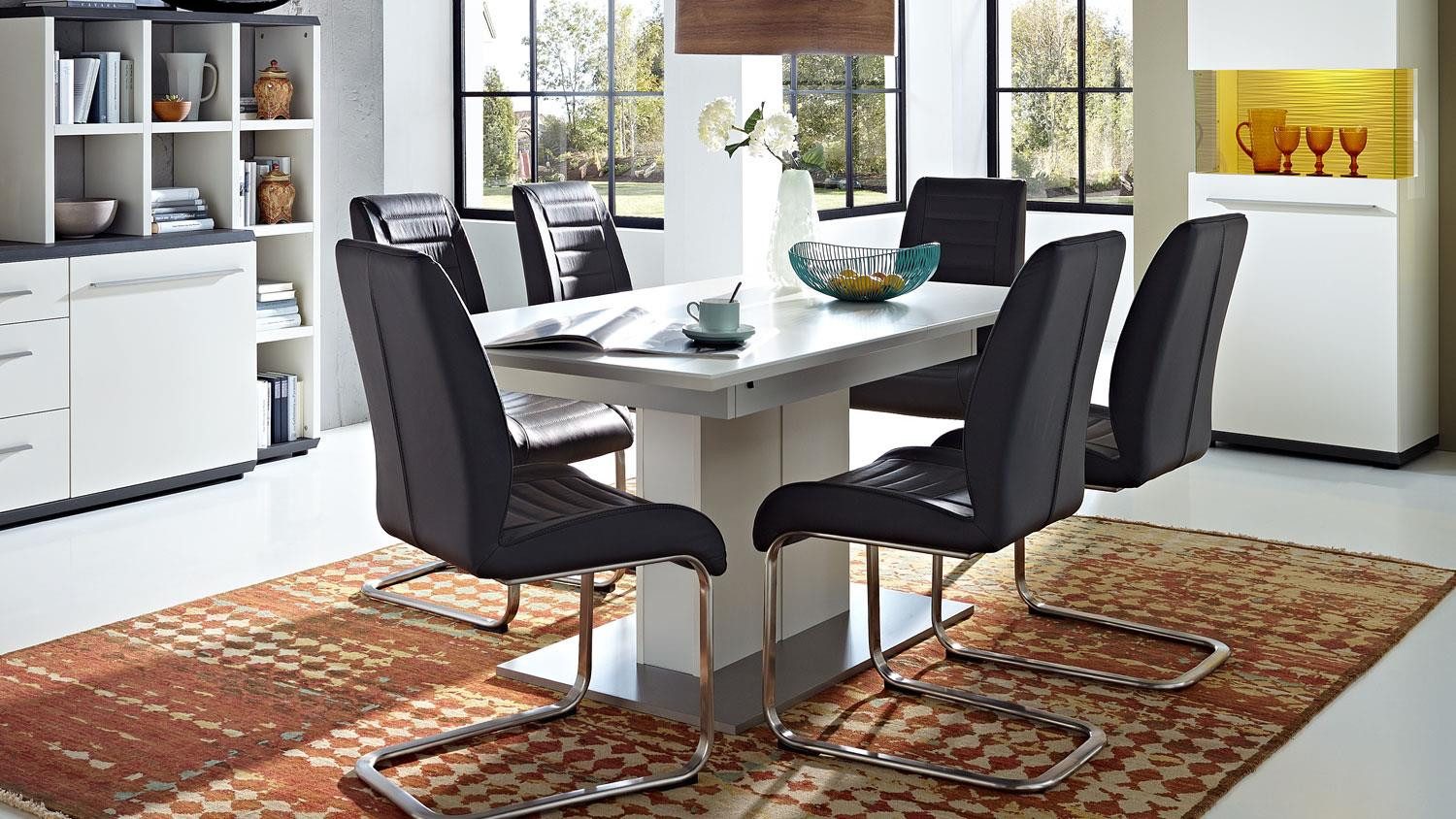 Im eleganten Stil fügt sich dieser Esstisch Light Line von "Die Hausmarke" ab sofort in Ihr Esszimmer ein. Der eindrucksvolle Esszimmertisch in weiß matt lack passt in jede Einrichtung und sorgt für einen direkten Blickfang. Das Highlight ist ein vorhandener Synchronauszug, sowie eine enthaltene Einlegeplatte, welche den Tisch auf eine Breite von 205 cm bringen lässt. Die silberfarbene Fußplatte setzt Akzente und rund das Erscheinungsbild gekonnt ab.