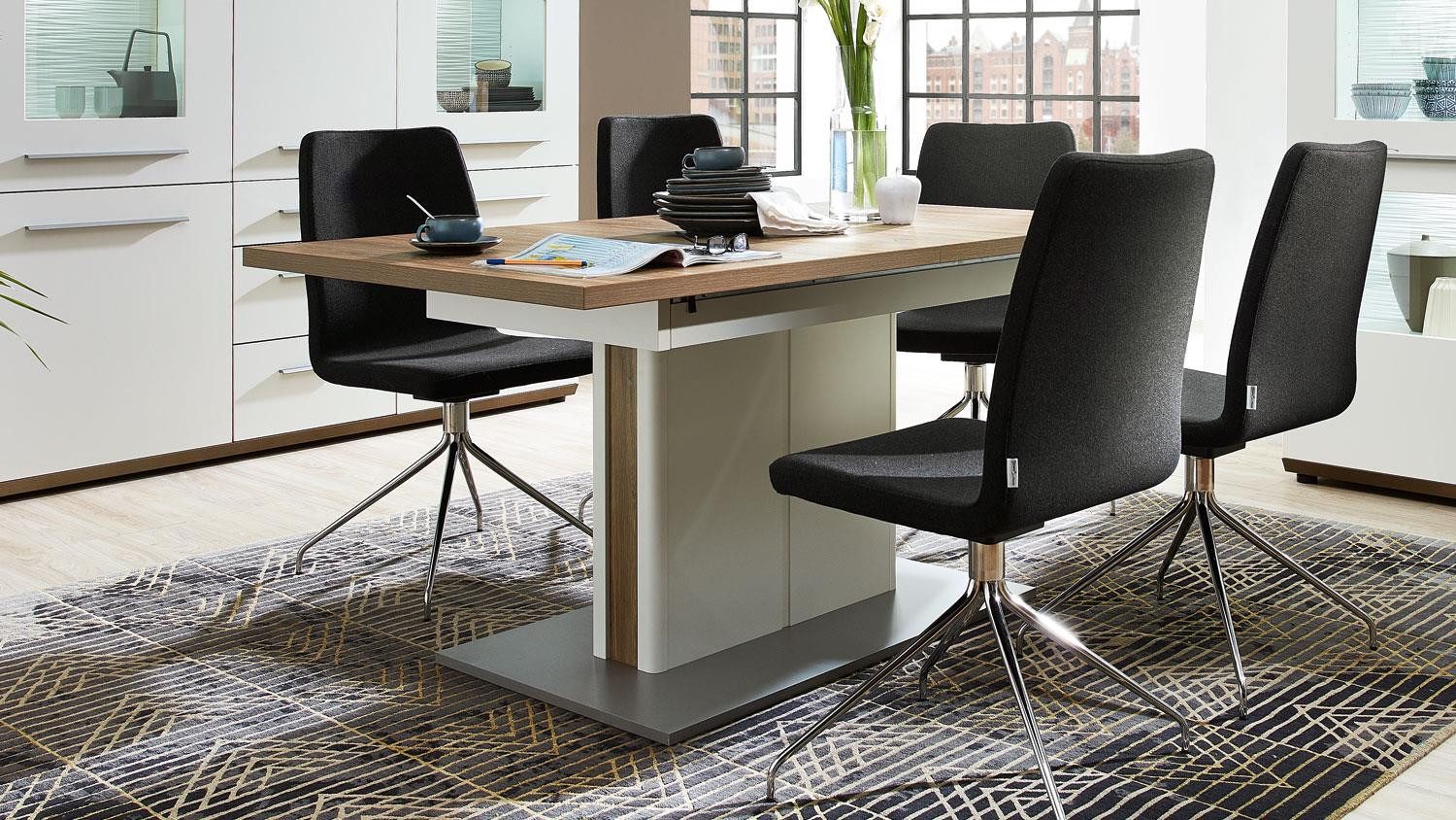 Einem gemütlichen Abendessen mit Familie und Freunden steht ab sofort nichts mehr im Wege. Mit diesem schönen Ausziehtisch SIGNO haben Sie einen modernen und zugleich praktischen Esszimmertisch in schicker Naturoptik. Der Tisch besitzt die Ausführung Balkeneiche furniert und weiß matt Lack mit silberfarbener Fußplatte. Der praktische Synchronauszug erlaubt es, die Platte von 160 cm auf 205 cm zu erweitern.