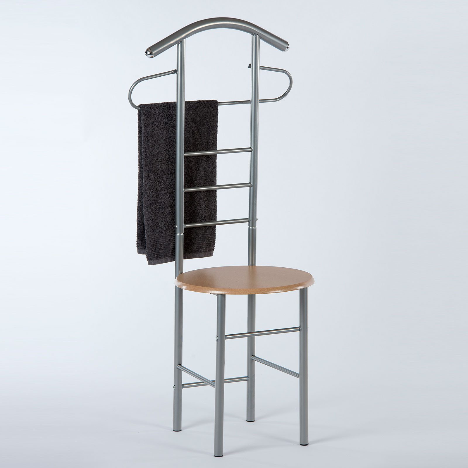 Der Sitz des Herrendienerstuhls Henry besteht aus hochwertigem MDF in einer stilvollen Buche-Nachbildung. Mit einem Durchmesser von 40 cm bietet der Sitz ausreichend Platz und Komfort. Das silberfarbene Metallgestell verleiht dem Stuhl eine moderne und zugleich zeitlose Optik, die sich nahtlos in verschiedene Einrichtungsstile integrieren lässt.
