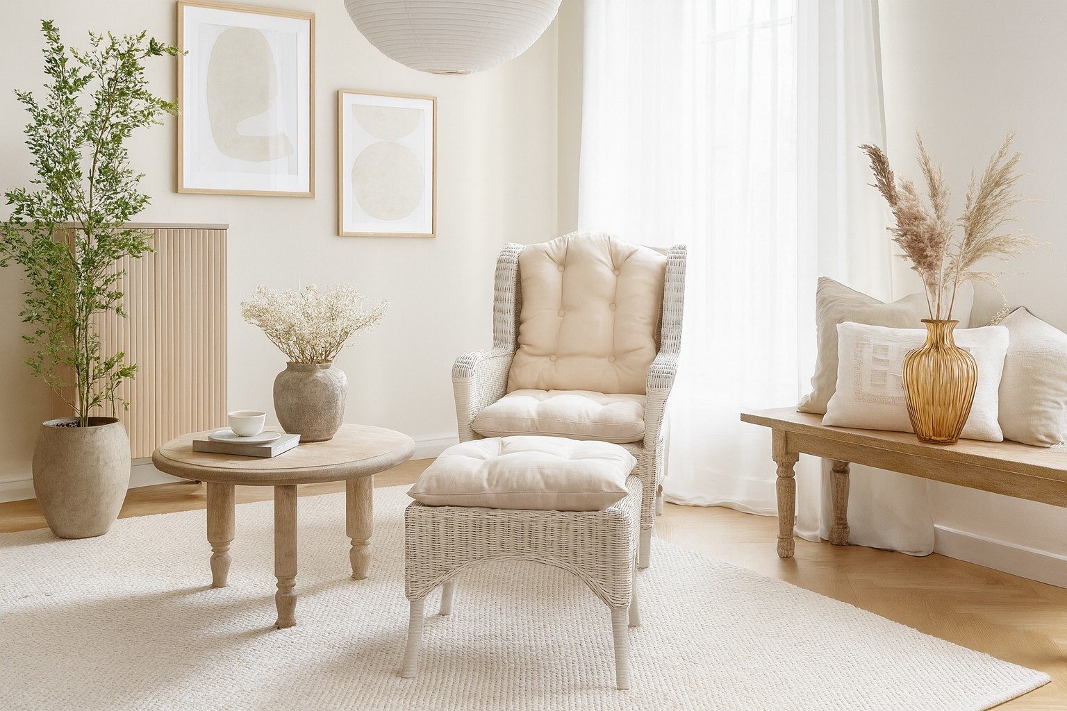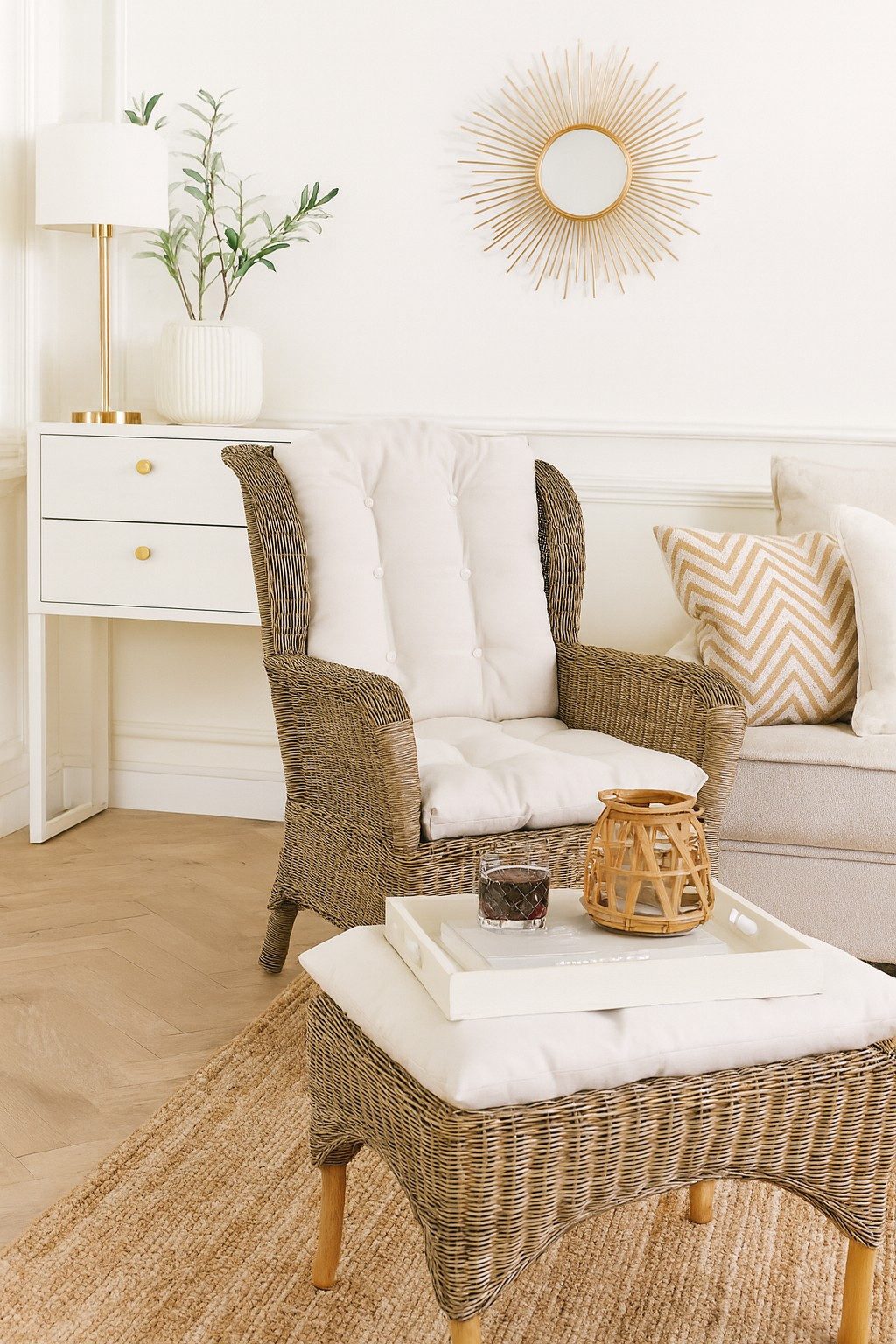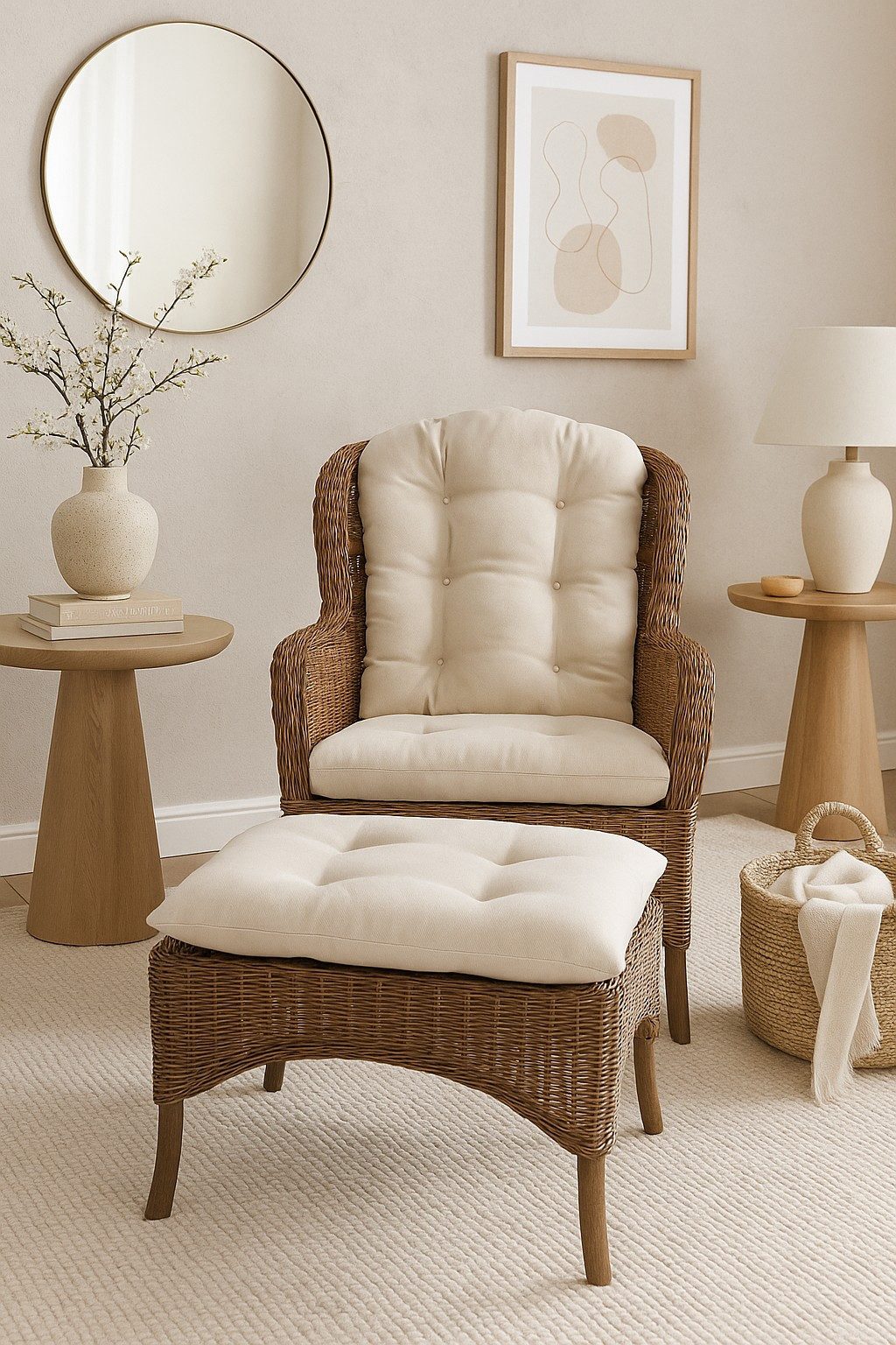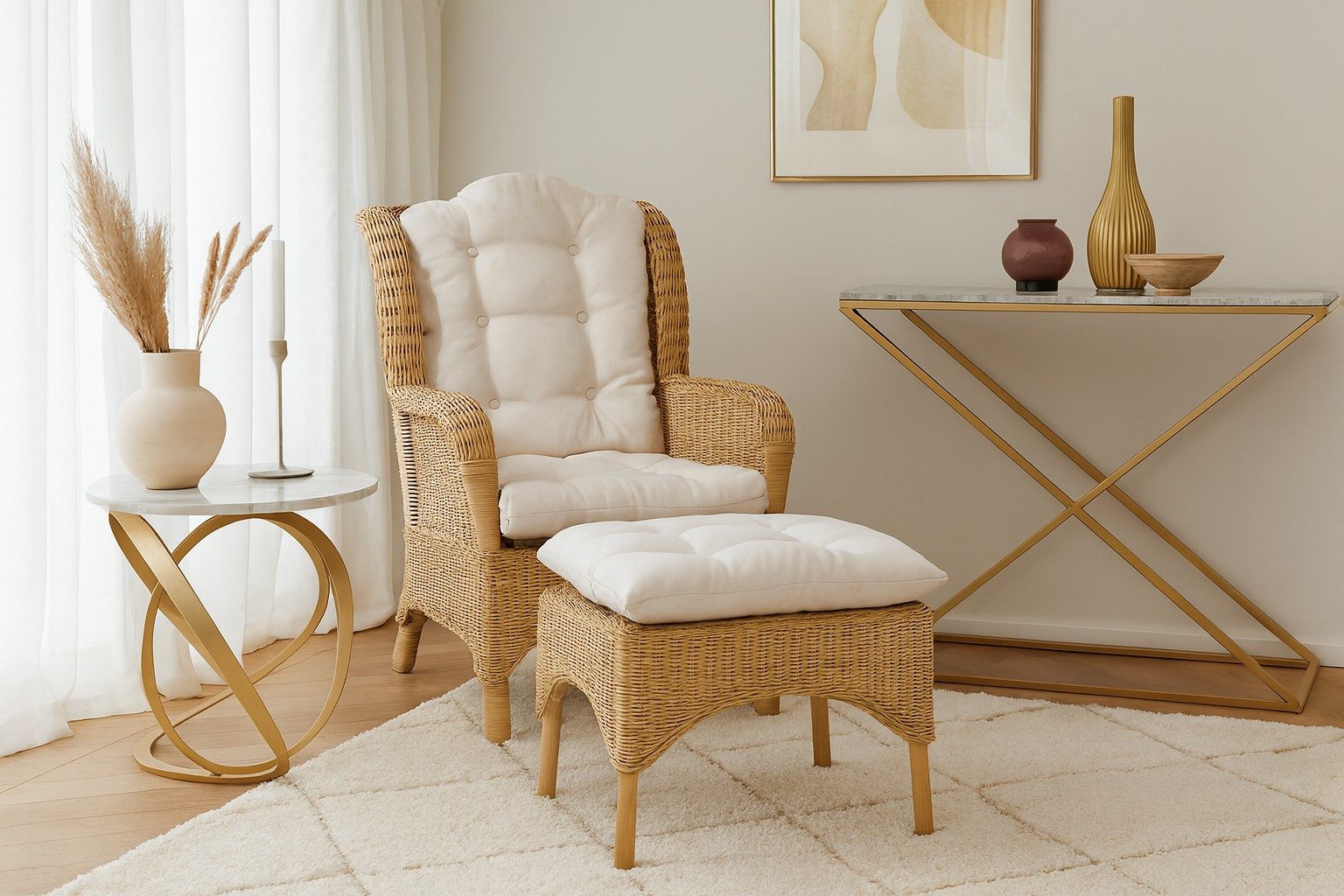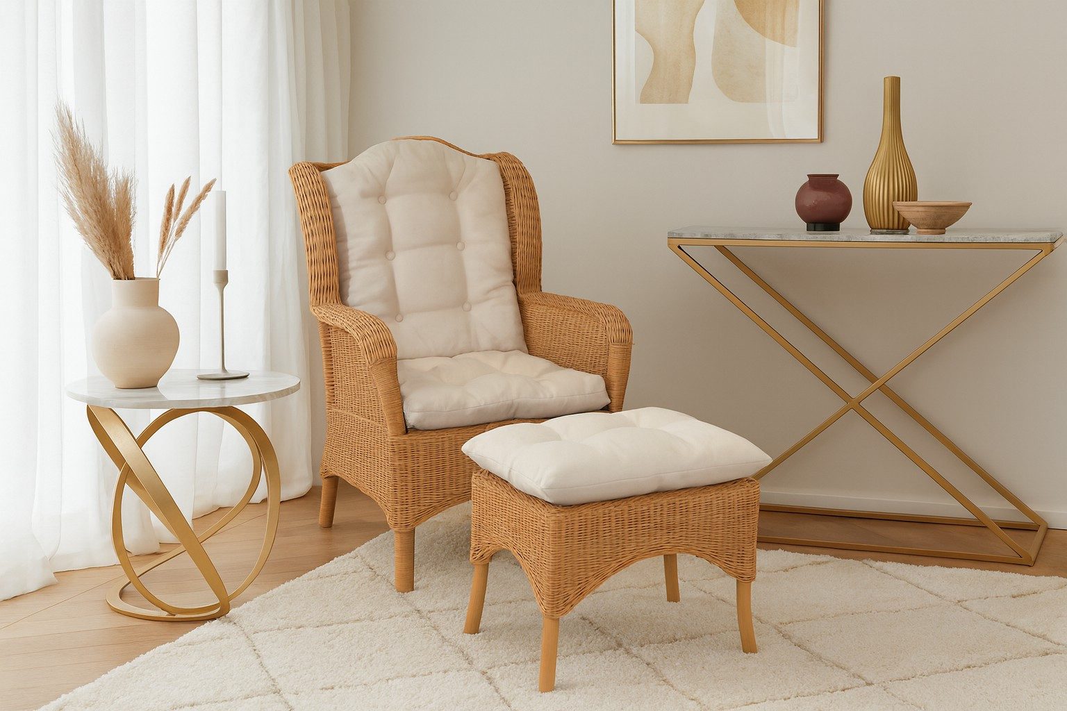 Bequemer Ohrensessel mit passendem Fußhocker aus 100% Naturmaterial Rattan, sorgsam handgeflochten. Die pflegeleichte, farbig gebeizte und lackierte Oberfläche ist in vier trendigen Farben erhältlich. Inklusive Kissenauflagen mit cremefarbenem Stoffbezug (100% Polyester) und extra starker Vliesfüllung; formstabil gearbeitet mit Knopfsteppung.