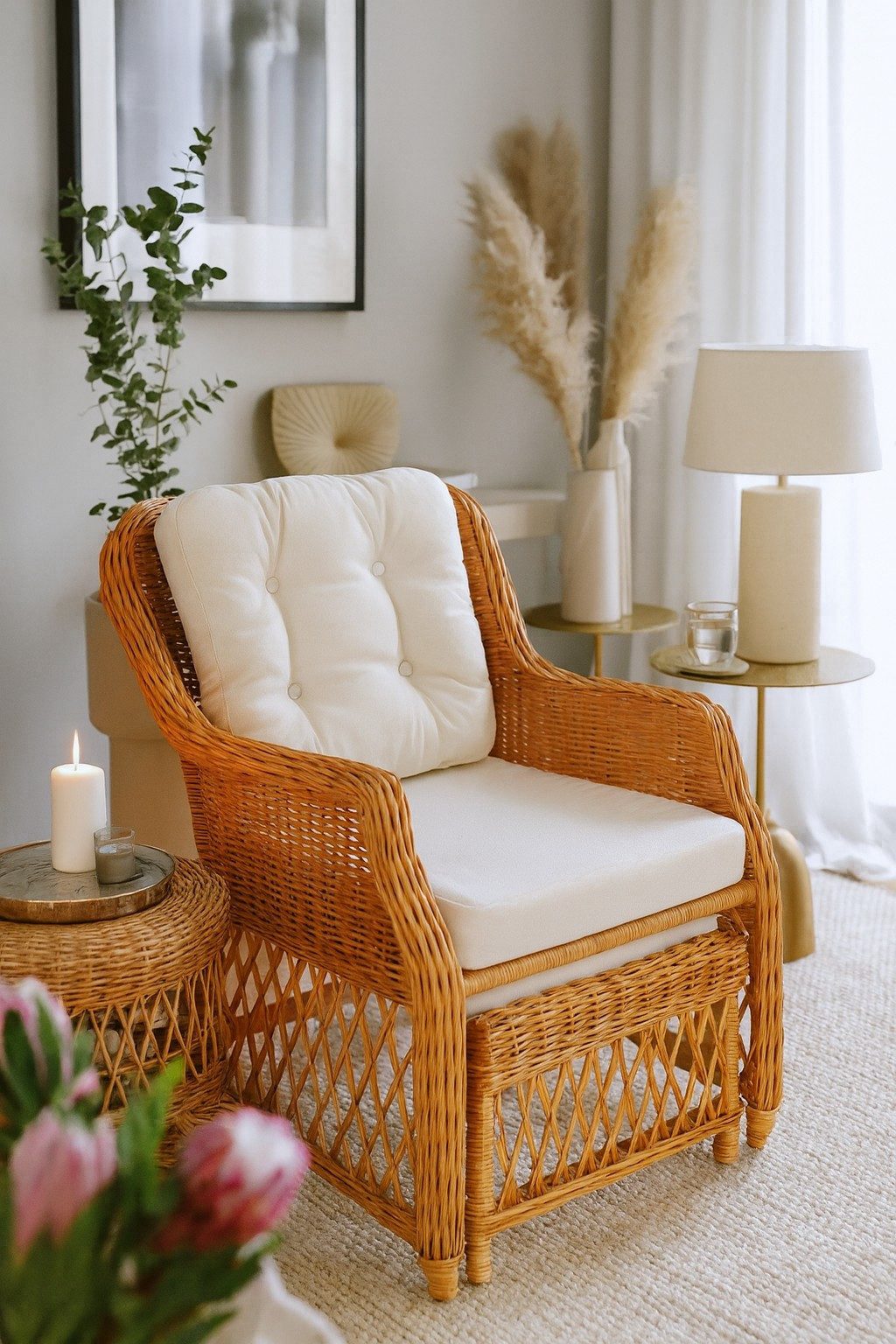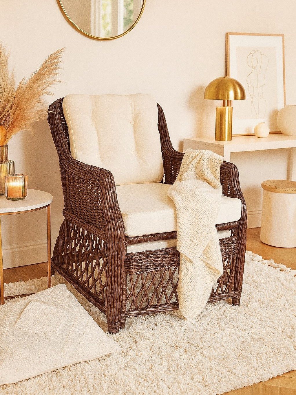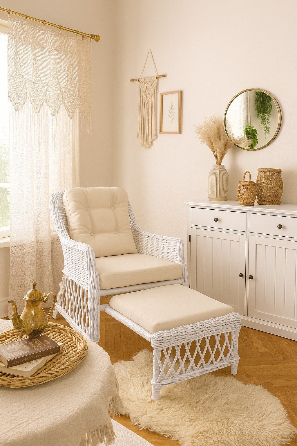 Bringen Sie nostalgischen Flair in Ihre Wohnräume – mit diesem charmanten Rattansessel mit ausziehbarem Fußteil. Das filigrane, handgeflochtene Design kombiniert mit einem stilvollen Stoffbezug macht diesen Sessel zum echten Blickfang im Landhaus- oder Boho-Stil. Ob im Wohnzimmer, Wintergarten oder auf der Veranda – dieser gemütliche Sessel lädt zum stilvollen Entspannen ein.