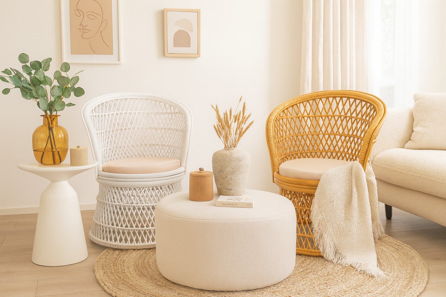 Großer, bequemer Sessel aus komplett handgeflochtenem Rattangeflecht. Oberfläche wahlweise weiß lackiert oder beigefarben gebeizt & lackiert. Auf der Sitzfläche liegt ein rundes, schaumstoffgepolstertes Sitzkissen mit cremefarbenem Bezug (100% Polyester). Lieferung erfolgt montiert per Spedition.
