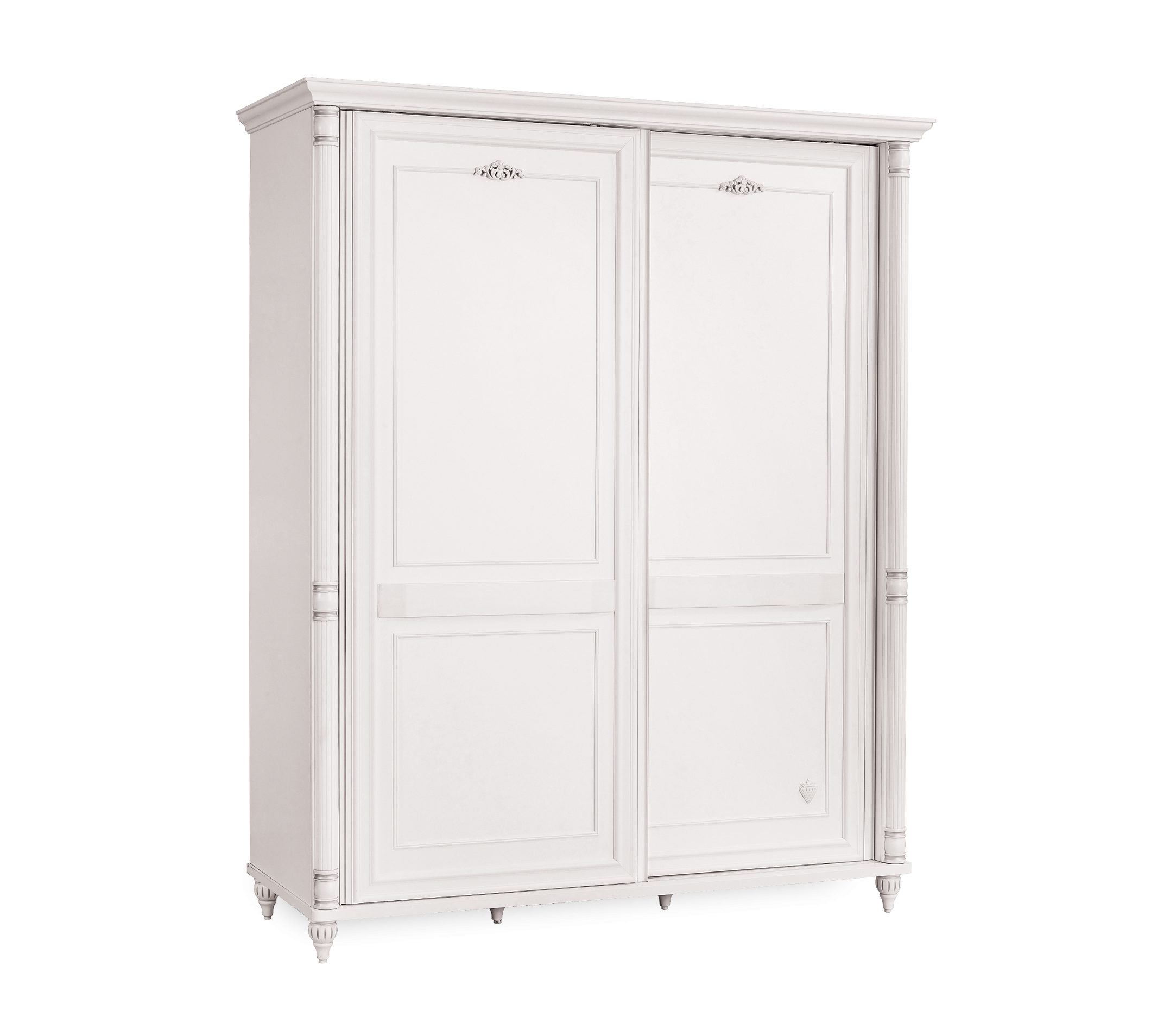 Dieser Kleiderschrank mit den großen Schiebetüren, ist das Stauraumwunder der Möbelserie Romantic. Ein Traum in Weiß behütet geliebte Kleidungsstücke mit der Würde eines Butlers. Gleich zwei Kleiderstangen rücken die Garderobe ins perfekte Licht.
