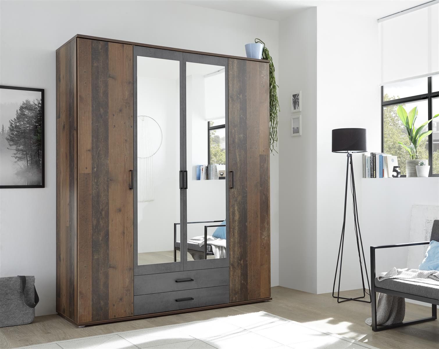 Mit diesem modernen Kleiderschrank lässt sich jedes Jugend- oder Schlafzimmer geschmackvoll einrichten. Dieser attraktive Kleiderschrank inklusive Spiegelelement auf der Mitteltür repräsentiert einen zeitlosen Einrichtungsstil. In den Schubkästen und hinter den Schranktüren gibt es viel Stauraum für Kleidungsstücke und andere Dinge. Der angesagte Kleiderschrank ist praktisch geeignet für jede Jugend-/Schlafzimmereinrichtung oder für die erste eigene Wohnung. Im Paket enthalten sind: 1x Drehtüren-Schrank (viertürig) inkl. Einlegeböden, Kleiderstange und Montage-Material.