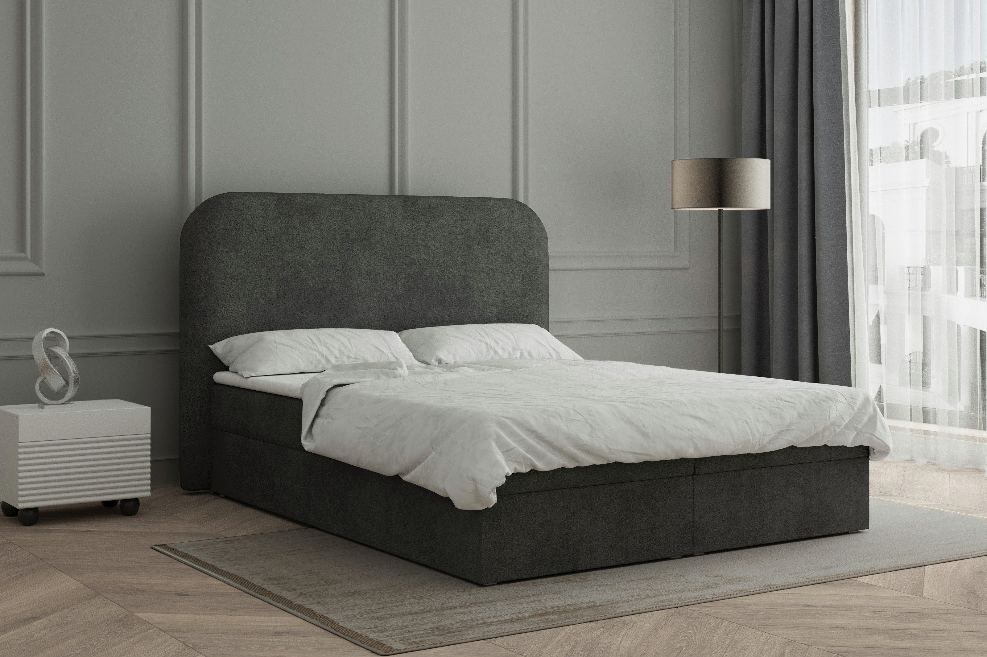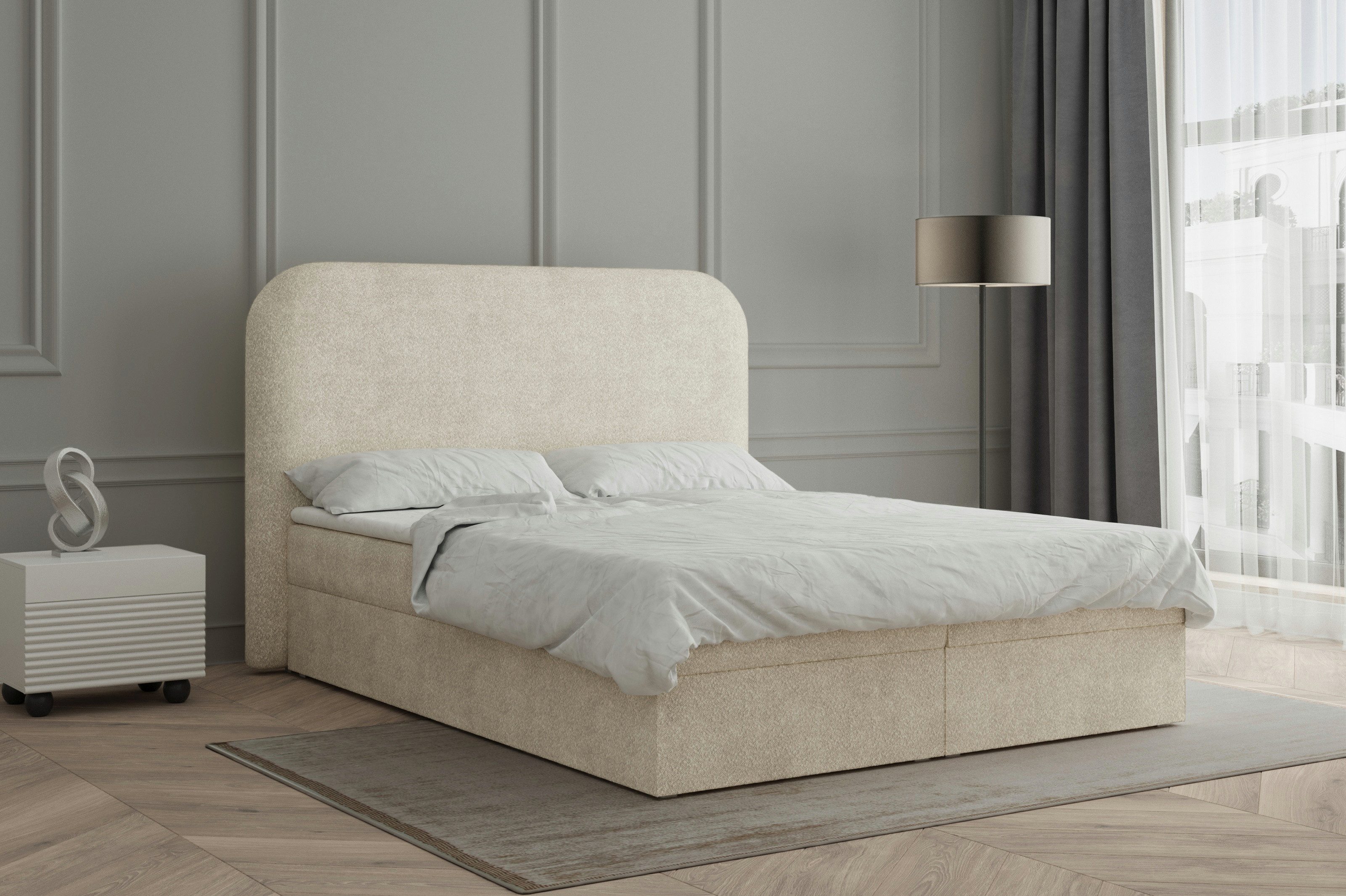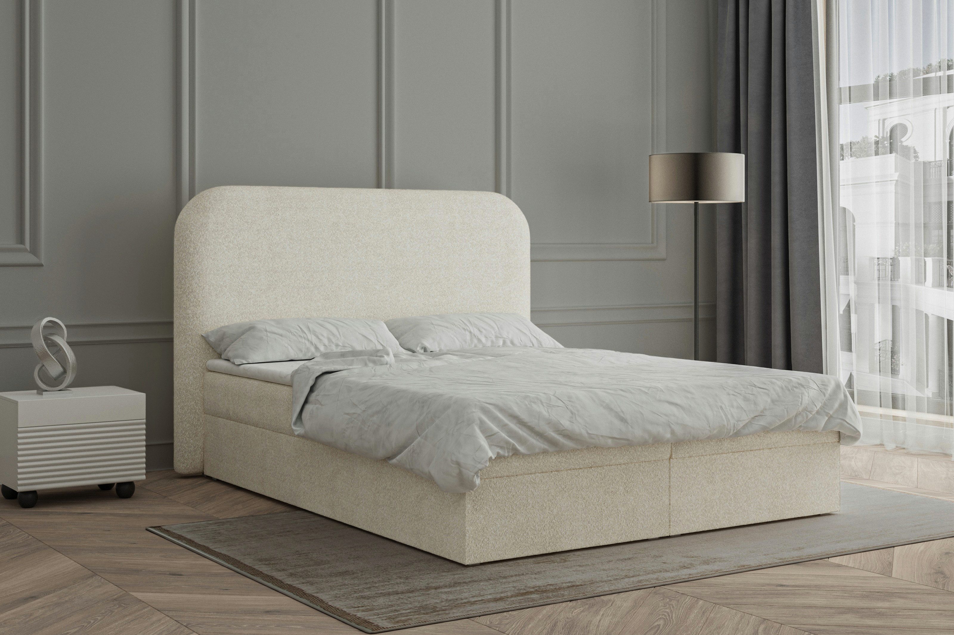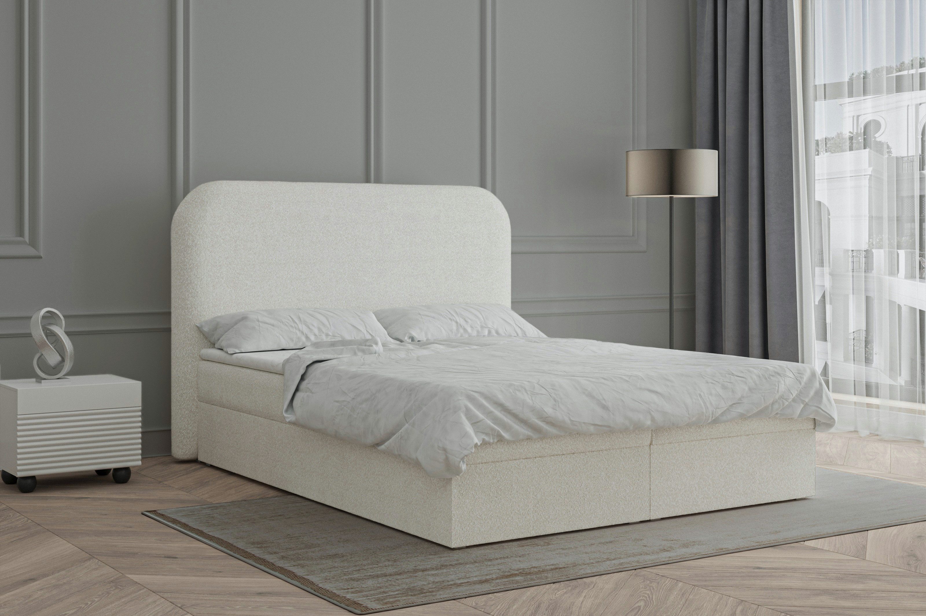 Der luxuriöse Bouclé-Stoff verleiht dem Boxspringbett nicht nur eine angenehme Weichheit, sondern auch eine stilvolle Optik. Der robuste Rahmen sorgt für Stabilität und Langlebigkeit, während ein praktischer Federmechanismus den Zugang zum großzügigen Stauraum unter der Liegefläche mühelos ermöglicht. Der zusätzliche Topper steigert den Komfort und sorgt für ein noch angenehmeres Liegegefühl. Das Bett ist die perfekte Lösung für alle, die neben Funktionalität auch besonderen Wert auf hohen Komfort legen.