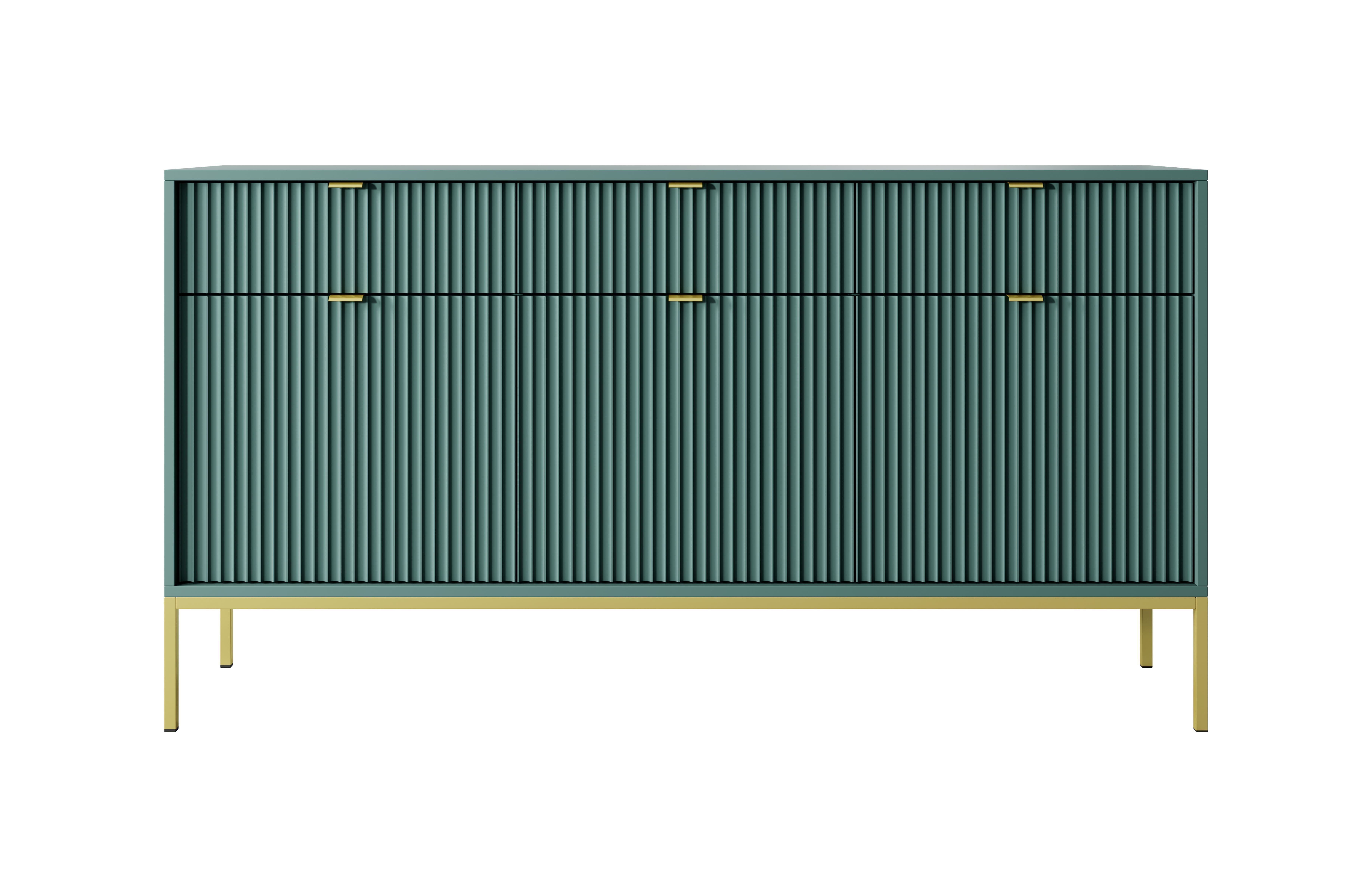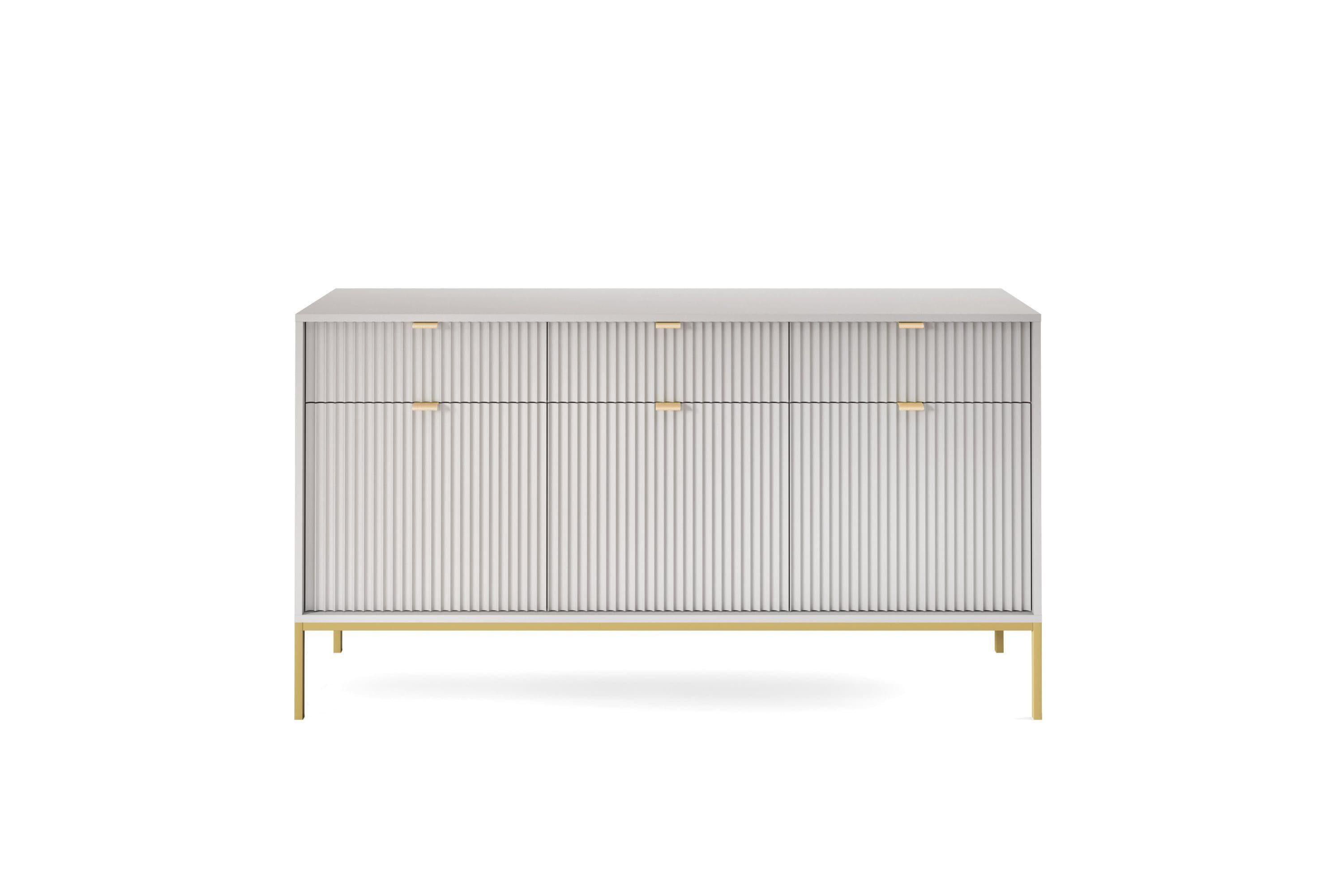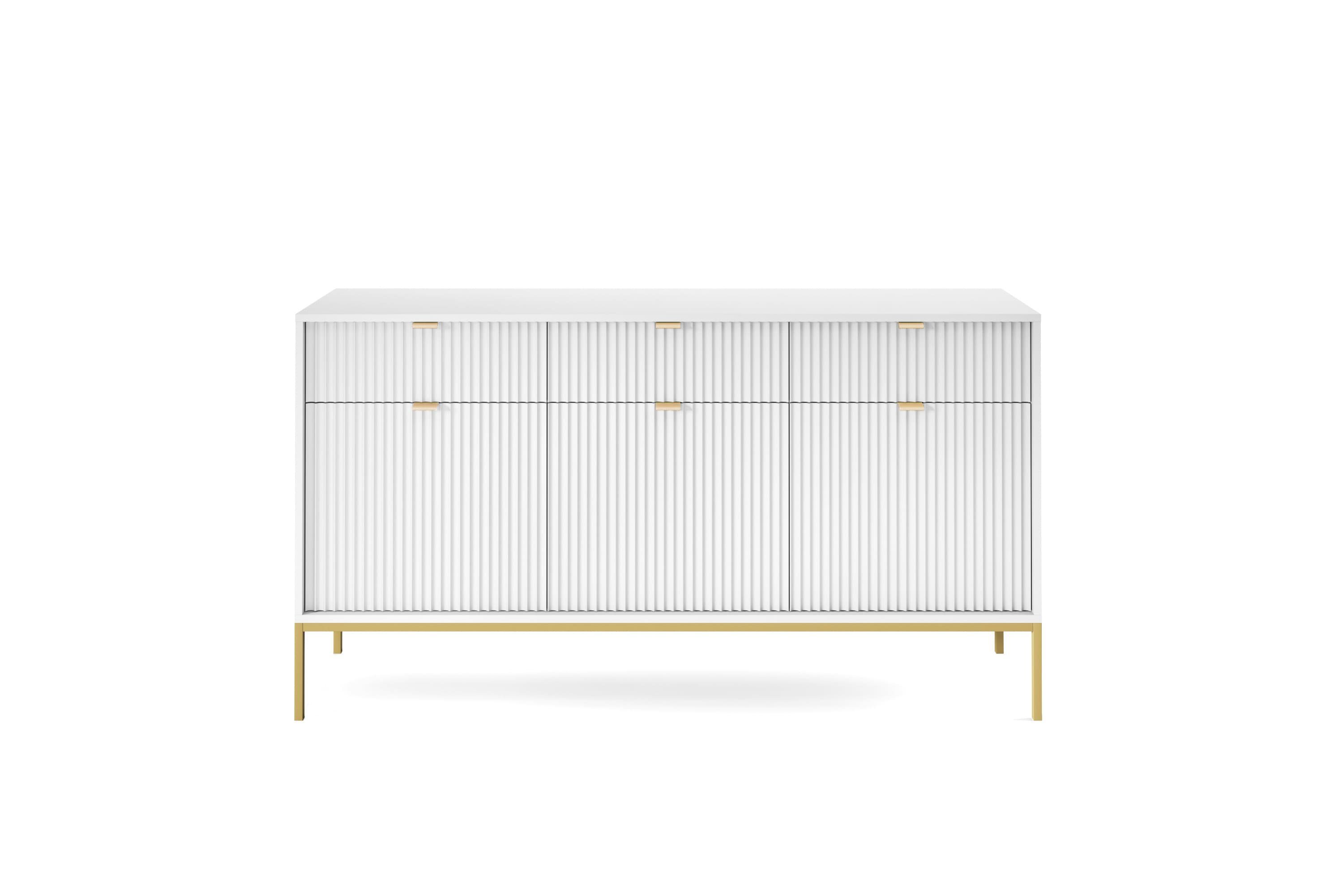 Die Kommode Lihght präsentiert sich als eine stilvolle und funktionale Lösung für moderne Wohnräume. Ihr schlichtes, aber elegantes Design sorgt für einen zeitgemäßen Look, der jedes Interieur aufwertet. Die Metallbeine verleihen dem Möbelstück eine leichte, luftige Ausstrahlung und machen es gleichzeitig stabil. Abgerundet wird das Design durch dekorative Griffe in einer trendigen Goldfarbe, die dem Möbelstück eine elegante Note verleihen. Besonders bemerkenswert ist die raffinierte Riffelung der Front, die der Kommode nicht nur visuell, sondern auch haptisch eine besondere Wirkung verleiht. Diese Kombination aus schlichter Eleganz und innovativen Details macht die Kommode zu einem echten Blickfang in jedem Raum.