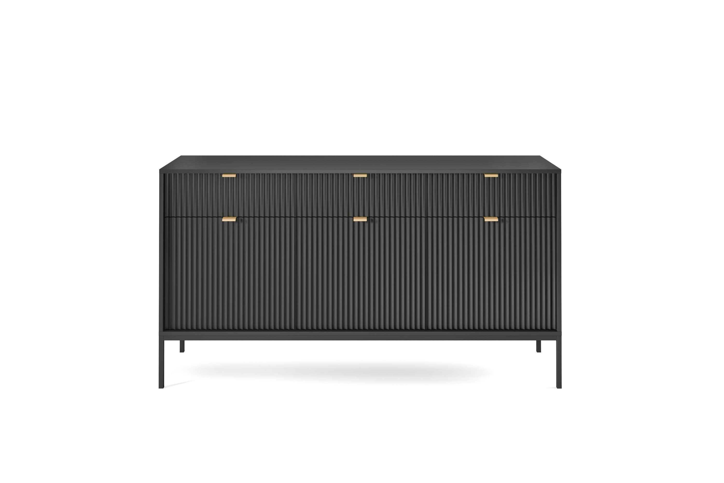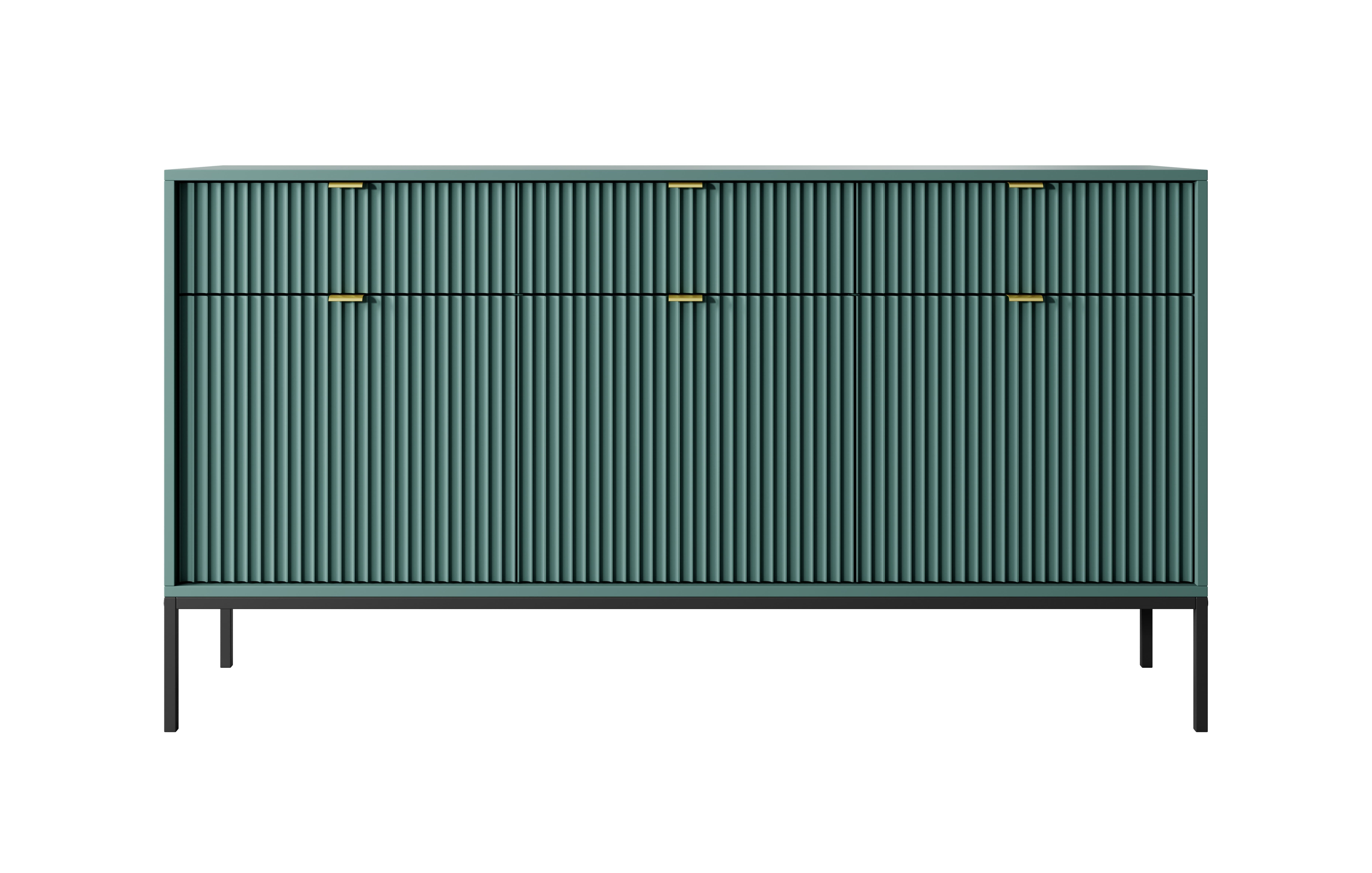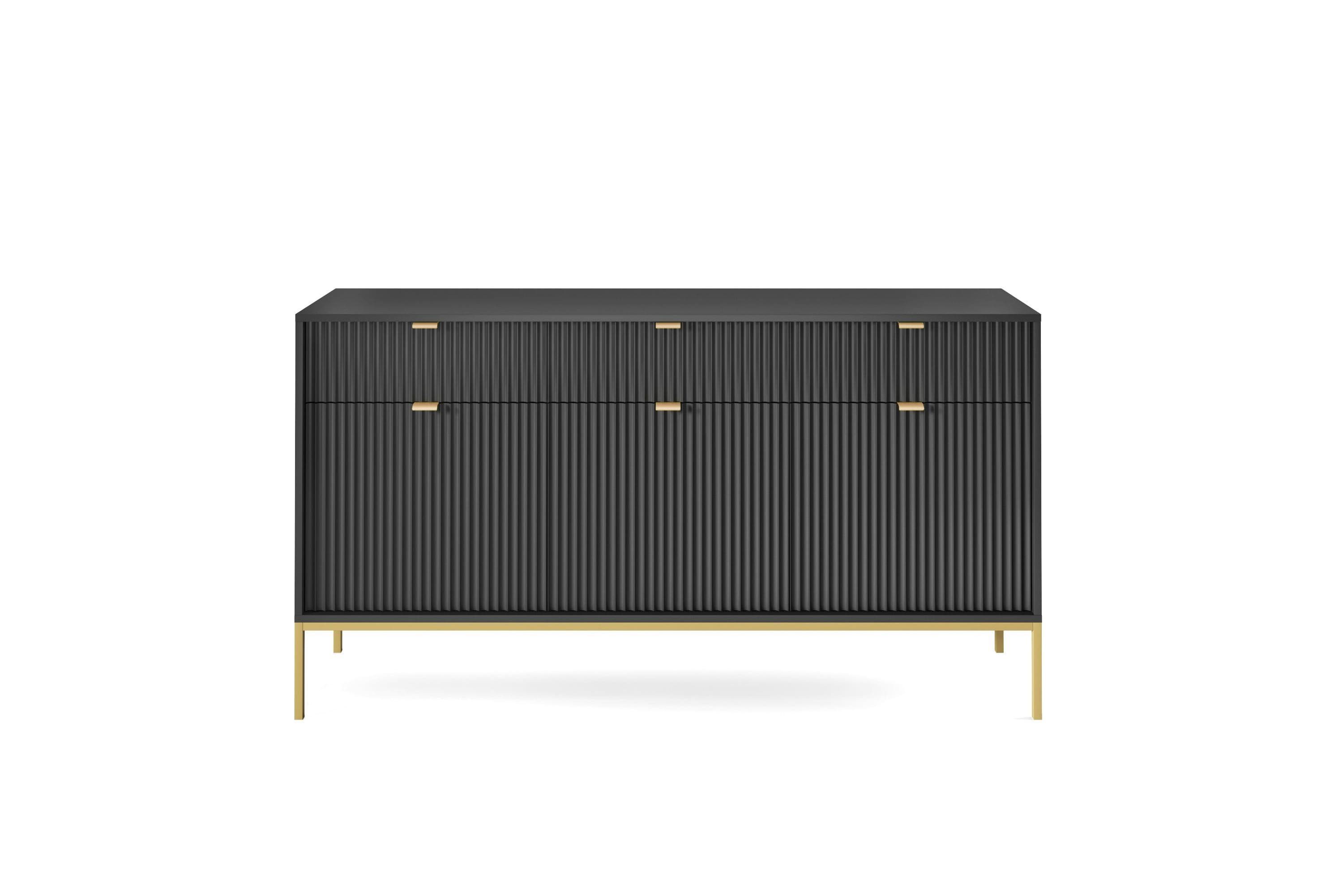Die Kommode Lihght präsentiert sich als eine stilvolle und funktionale Lösung für moderne Wohnräume. Ihr schlichtes, aber elegantes Design sorgt für einen zeitgemäßen Look, der jedes Interieur aufwertet. Die Metallbeine verleihen dem Möbelstück eine leichte, luftige Ausstrahlung und machen es gleichzeitig stabil. Abgerundet wird das Design durch dekorative Griffe in einer trendigen Goldfarbe, die dem Möbelstück eine elegante Note verleihen. Besonders bemerkenswert ist die raffinierte Riffelung der Front, die der Kommode nicht nur visuell, sondern auch haptisch eine besondere Wirkung verleiht. Diese Kombination aus schlichter Eleganz und innovativen Details macht die Kommode zu einem echten Blickfang in jedem Raum.