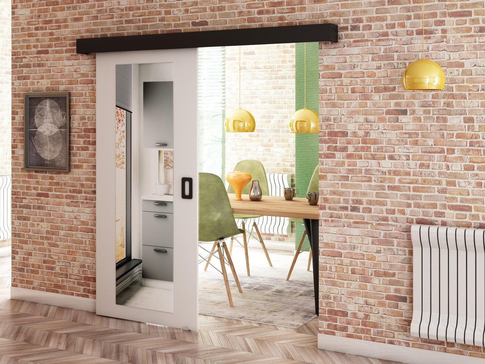 MAY-Schiebetür aus 16 mm starker laminierter Möbelplatte, Kanten sorgfältig mit haltbarem und beschädigungsbeständigem PVC-Furnier verarbeitet, Griff aus haltbarem Kunststoff.