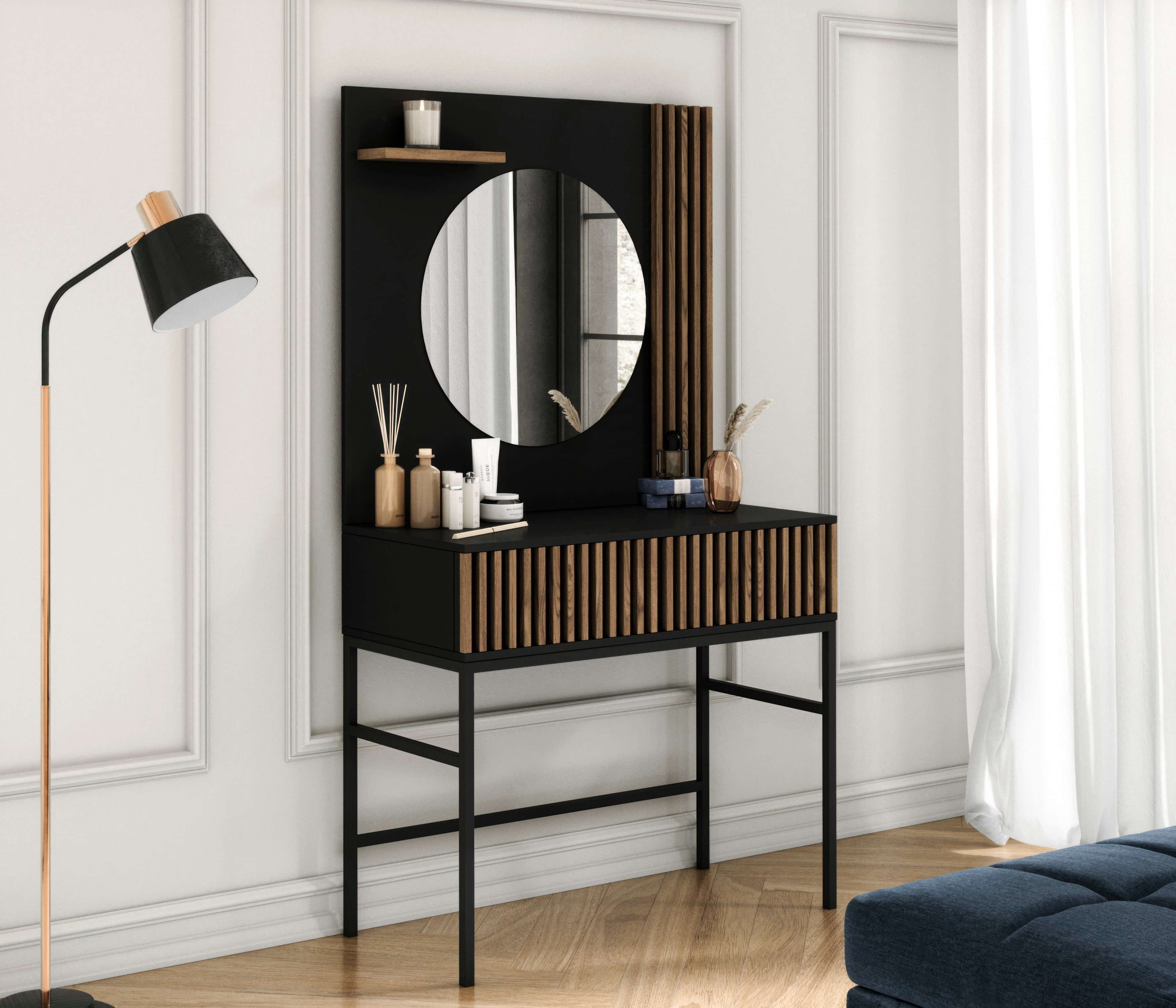 Der Schminktisch Meteor ist das perfekte Möbelstück für ein Schlafzimmer oder ein Ankleidezimmer. Der Schminktisch wurde nach den neuesten Designtrends entworfen und ist dank seiner kompakten Abmessungen auch in einem kleinen Raum perfekt. Trotz seiner robusten und langlebigen Konstruktion wiegt der Schminktisch nur 44 kg, wodurch er sich leicht bewegen und an den gewünschten Ort stellen lässt.