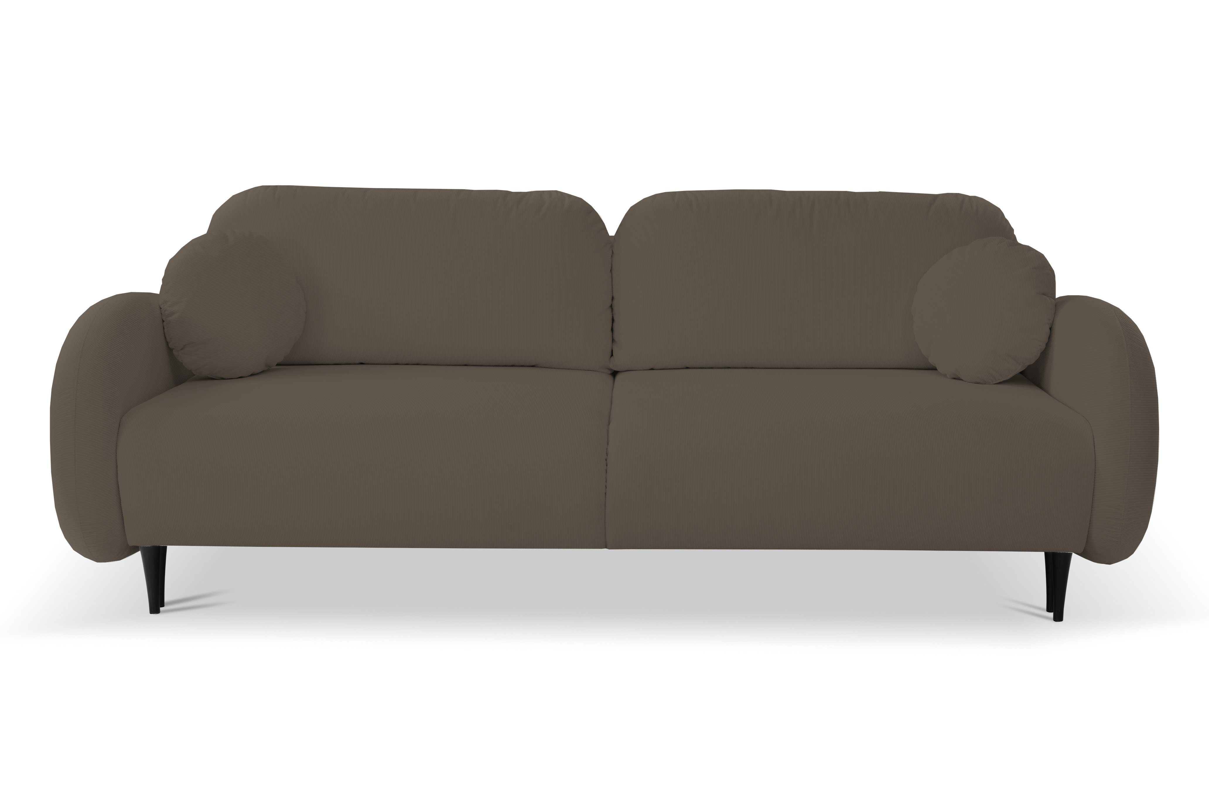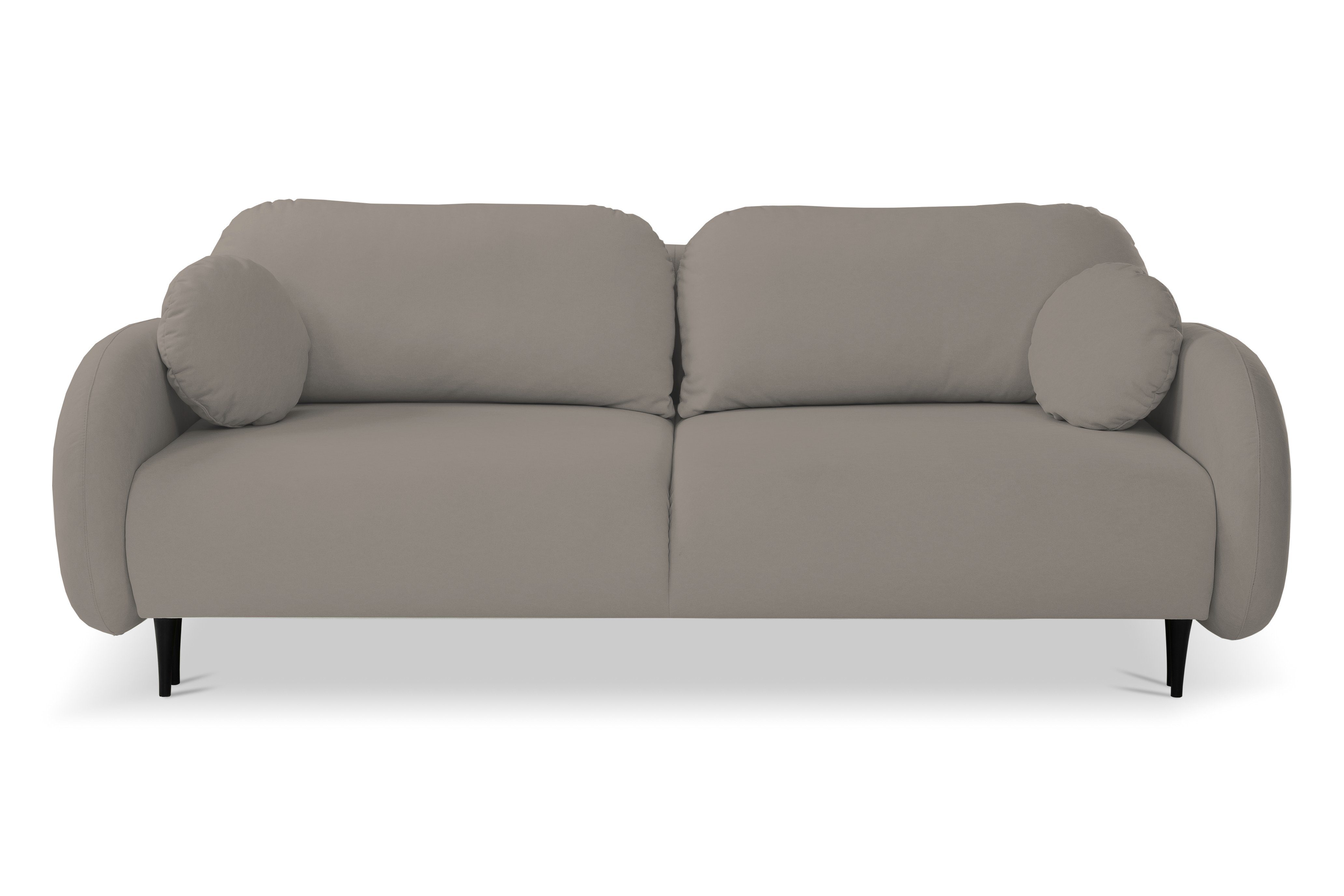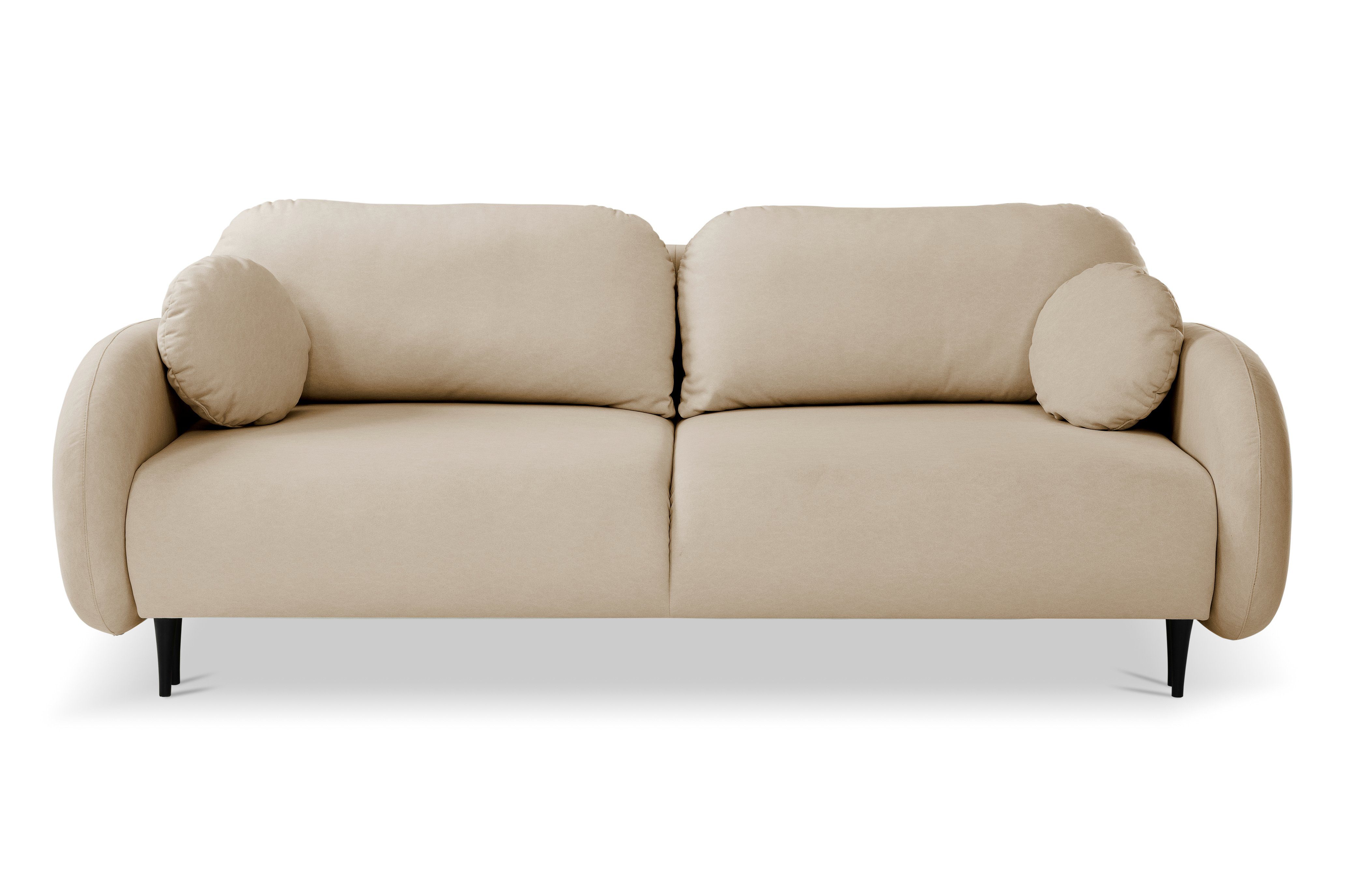 Das Designersofa PUCH mit seiner abgerundeten Form ist ein Möbelstück mit einzigartigem Charakter. Sein dezentes Design, die abgerundeten Armlehnen und die weichen Kissen laden zu langen Stunden der Entspannung ein. Das Sofa Puch hat eine solide Konstruktion aus Holz und Spanplatten, seine Füllung besteht aus federndem und bestem PUR-Schaum und Wellenfedern, und seine Stabilität wird durch Holzbeine verstärkt, die auch eine schöne Dekoration sind - sie verleihen Leichtigkeit und Charme im Scandi-Stil. Außerdem verfügt das Sofa über ein packbares Bettzeugfach und die Möglichkeit, es auszuklappen, und die Schlaffunktion ist dank der klappbaren Stützmechanismen sehr einfach zu bedienen.