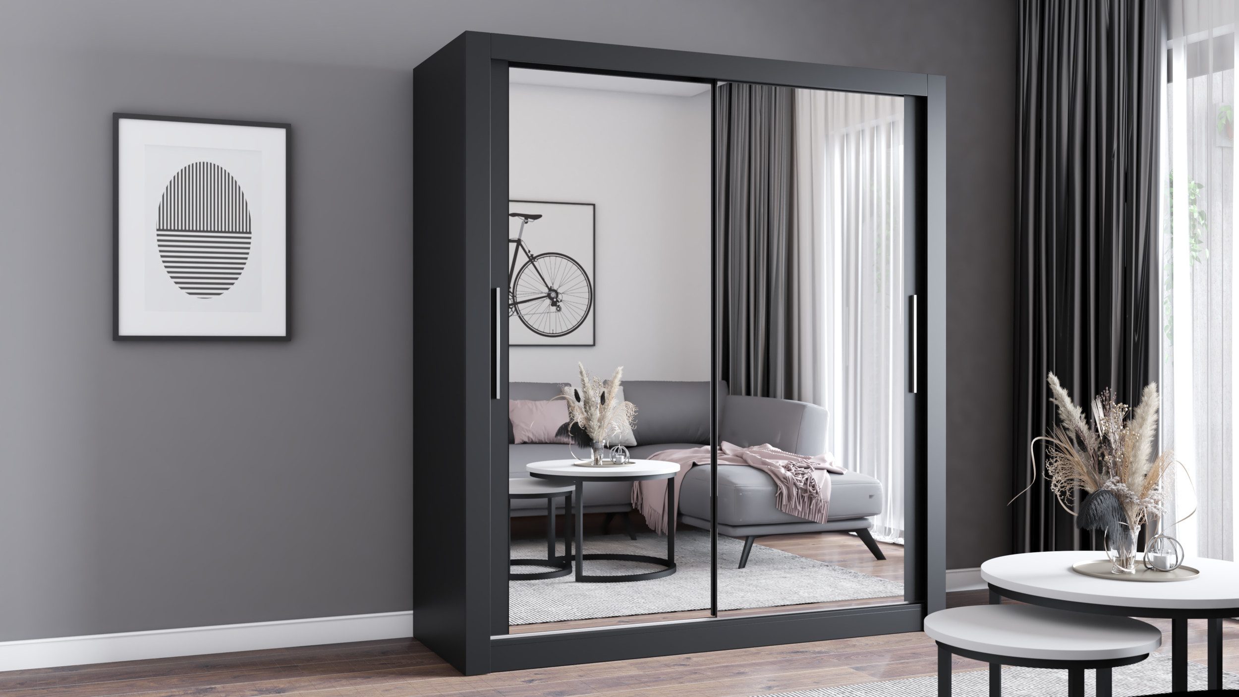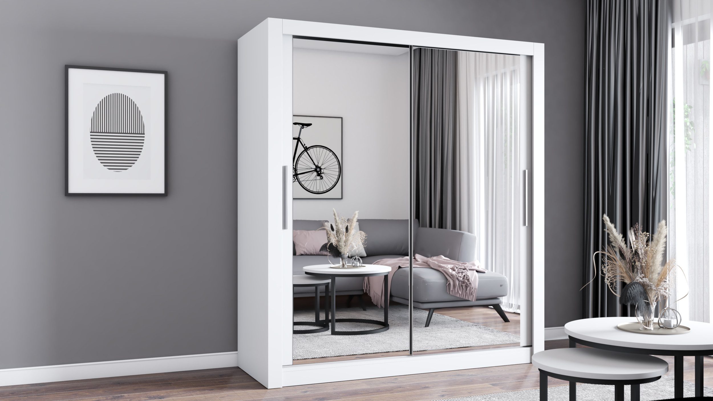 Die Fronten des Milko Kleiderschranks sind mit einem großen, eleganten Spiegel ausgestattet, der den Raum optisch vergrößert und ihm Tiefe verleiht. Der Spiegel ist ein echter Blickfang und unterstreicht das moderne Design des Schranks.