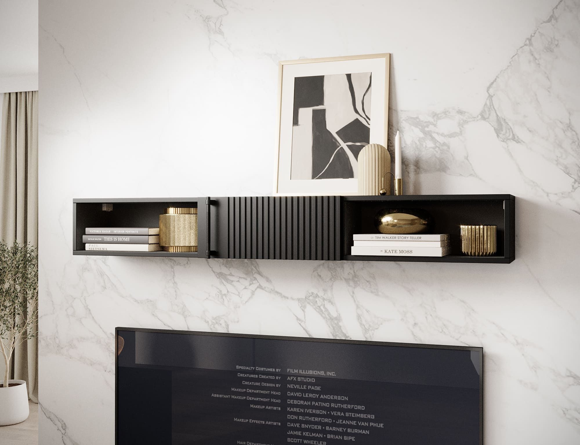 Das Wandhängeregal mit Aufsatz Raftilo vereint minimalistisches Design, hochwertige Materialien und praktische Funktionalität. Gefertigt aus laminierter Spanplatte mit gefräster MDF-Front, besticht es durch elegante Verarbeitung und einen markanten Loft-Charakter. Die schwarze Oberfläche harmoniert perfekt mit den schwarzen Aluminiumgriffen und unterstreicht den industriellen Look.