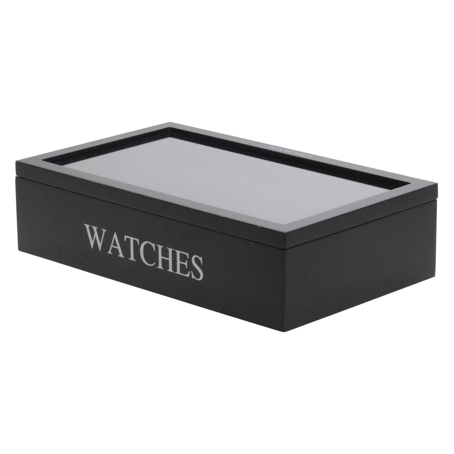 Die Oberseite der Box ziert eine kristallklare Klarglasscheibe, die einen ungehinderten Blick auf Ihre kostbaren Zeitmesser ermöglicht, während sie gleichzeitig vor Staub und Kratzern geschützt sind. Egal, ob Sie ein leidenschaftlicher Uhrensammler sind oder einfach eine elegante Lösung zur Aufbewahrung Ihrer täglichen Uhren suchen, diese Uhrenbox ist die perfekte Wahl.